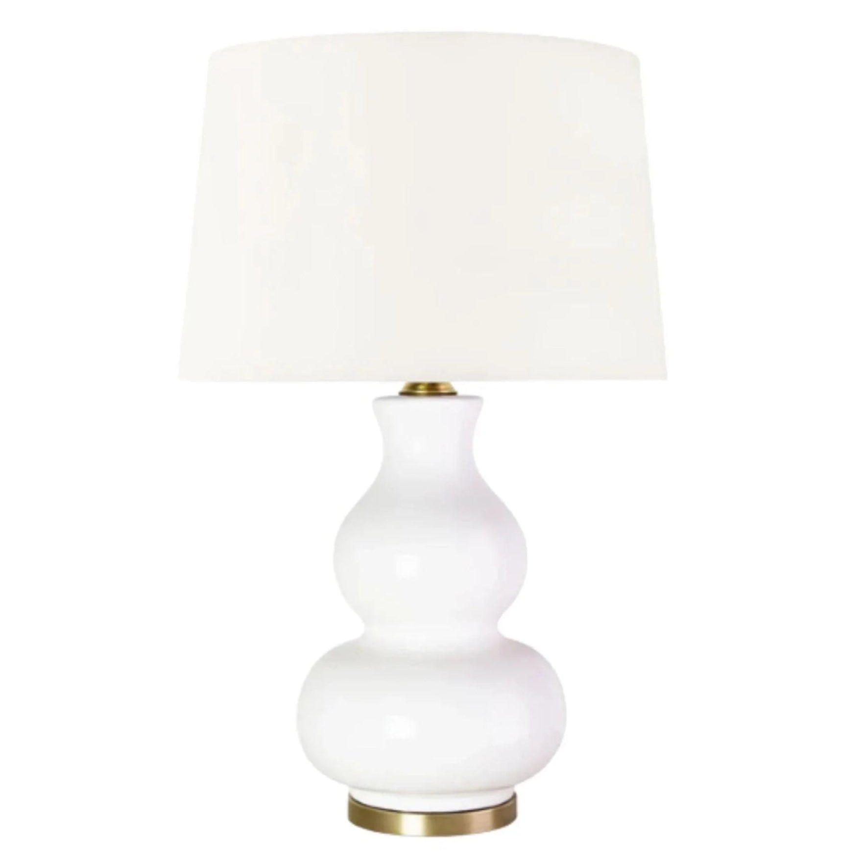 The lamp features a ceramic body with a gloss finish and a solid brass base with an unlacquered antique finish.