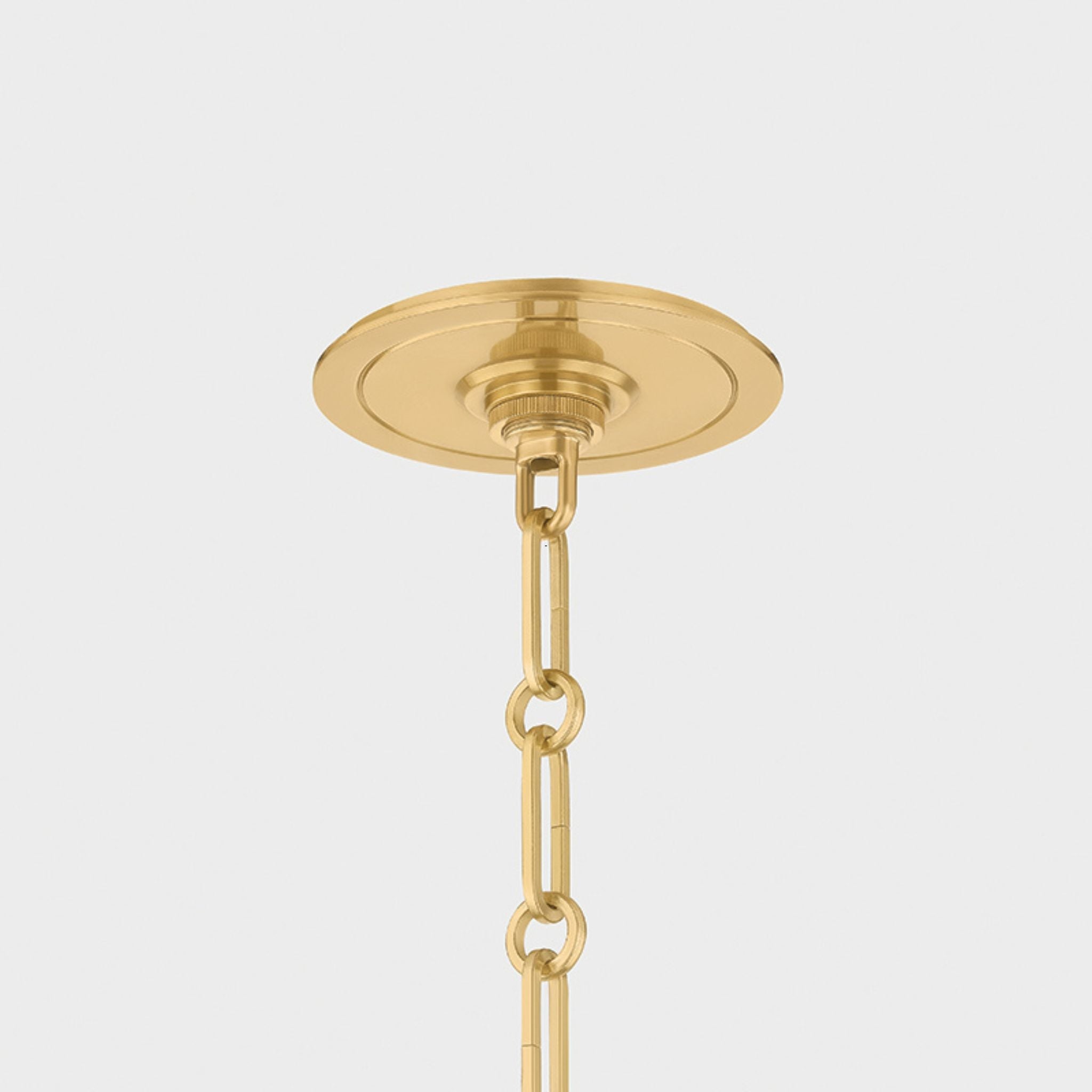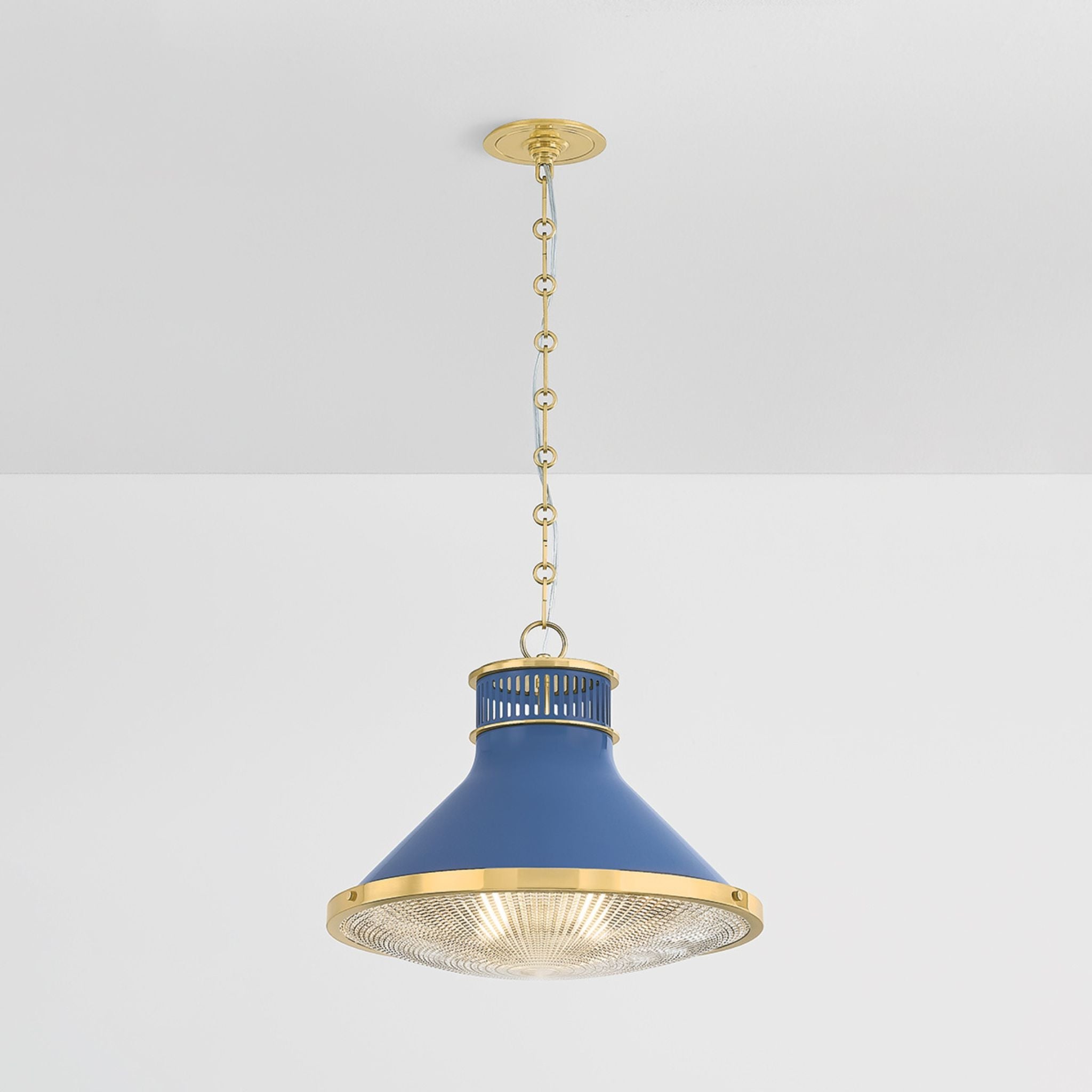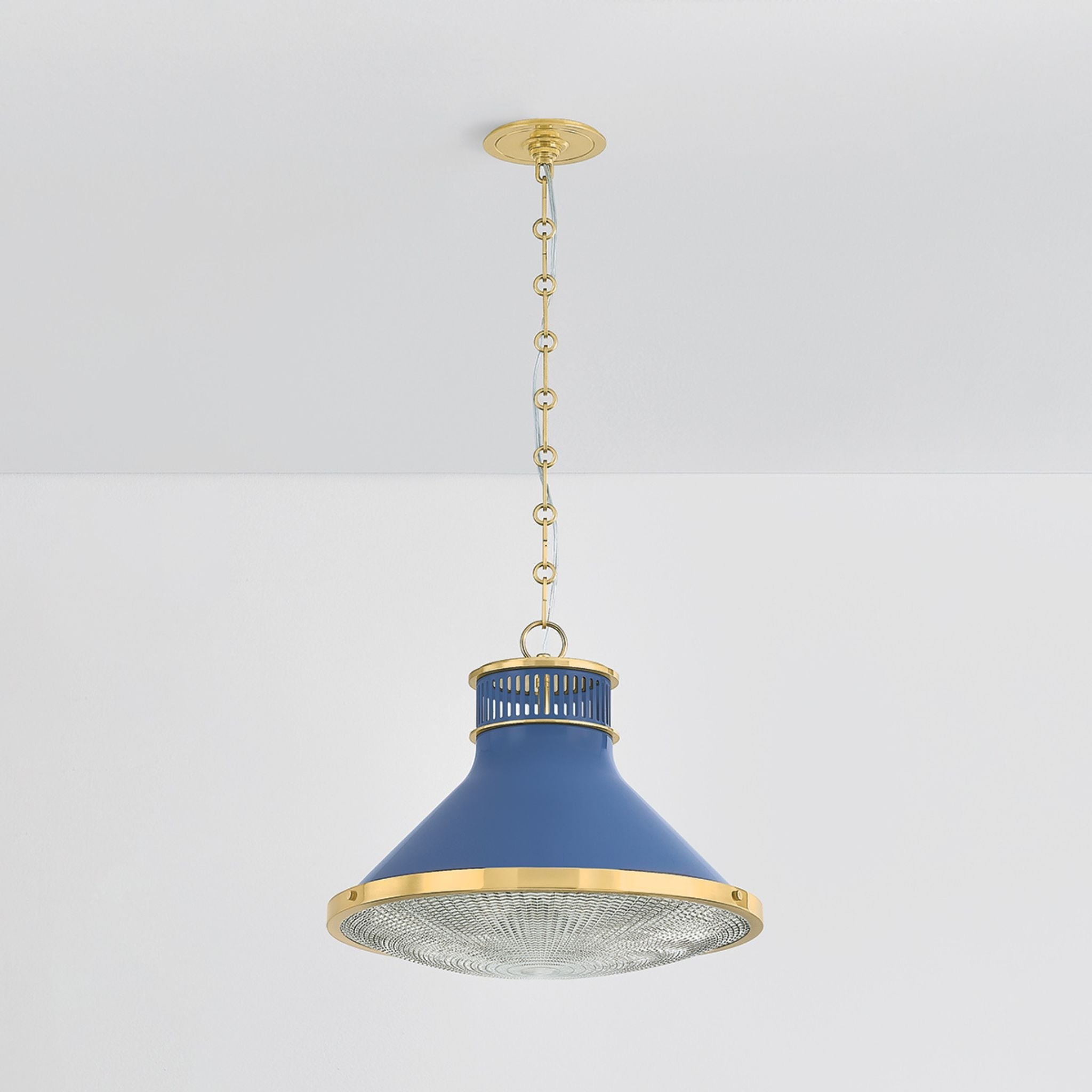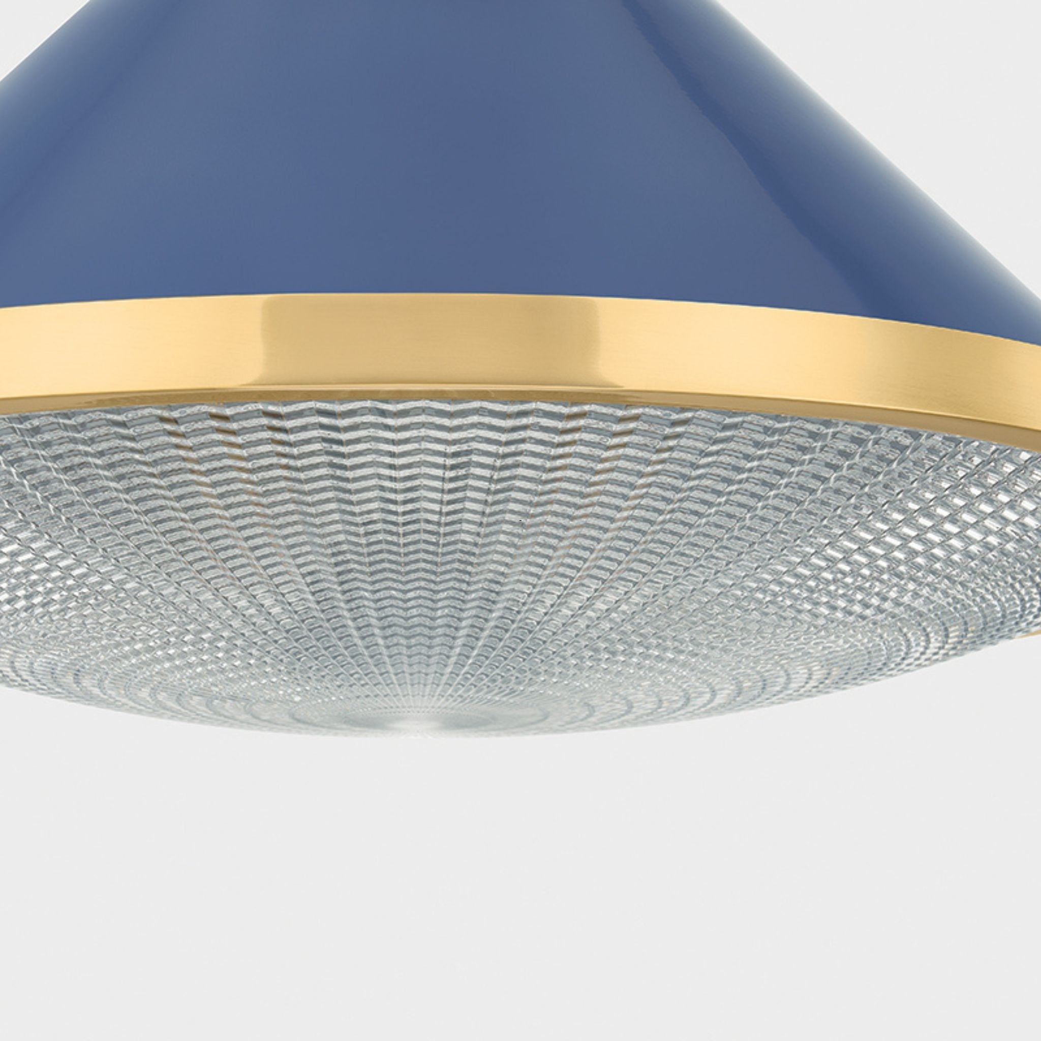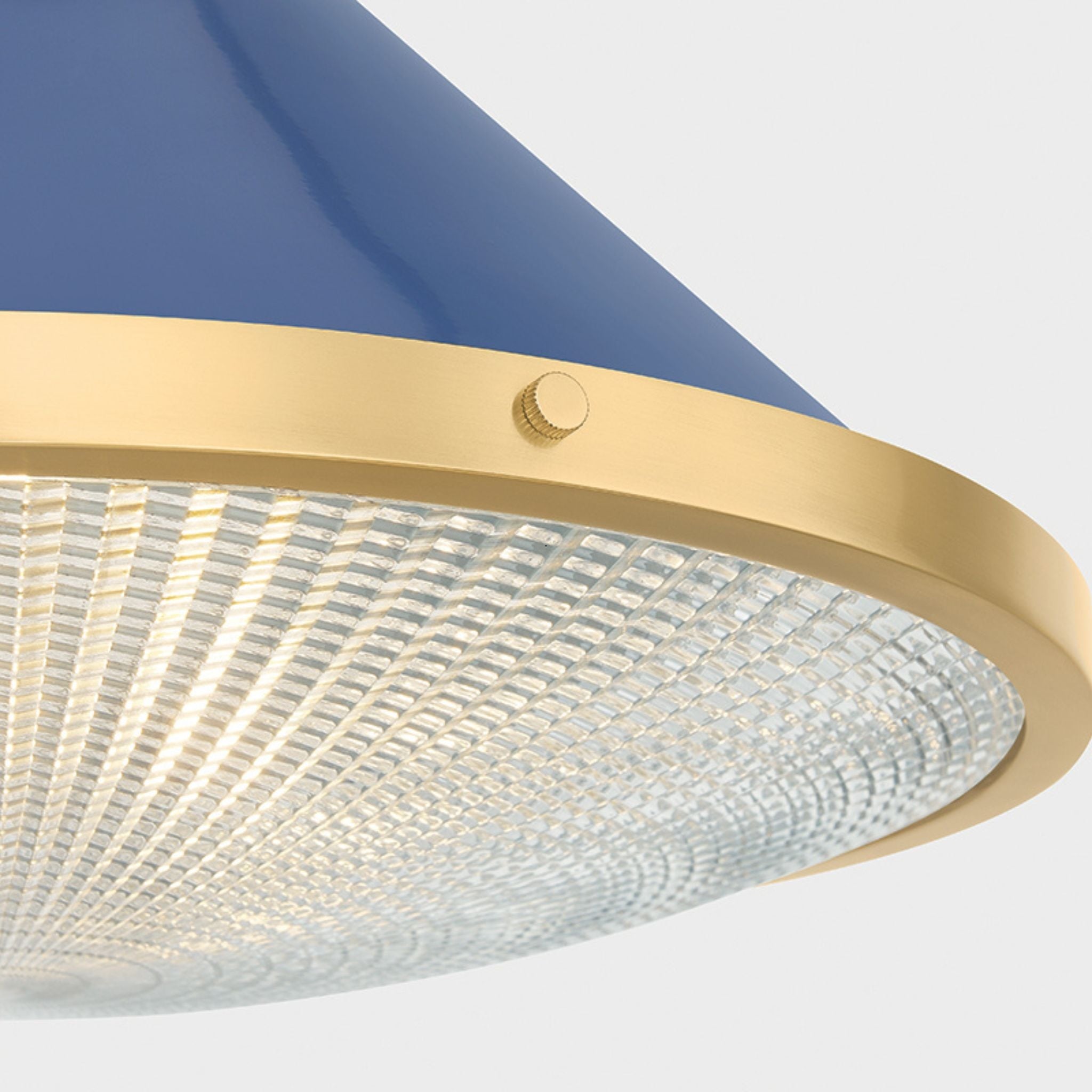 The Highclere family blends industrial and classic elements to create a modern, elevated basic. Etched for added texture, the clear optic glass shade creates a beautiful diffusion of light while the bell-shaped silhouette of the shade is accented by Mark D. Sikes' signature brass screw detailing.