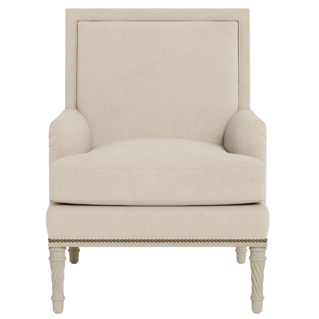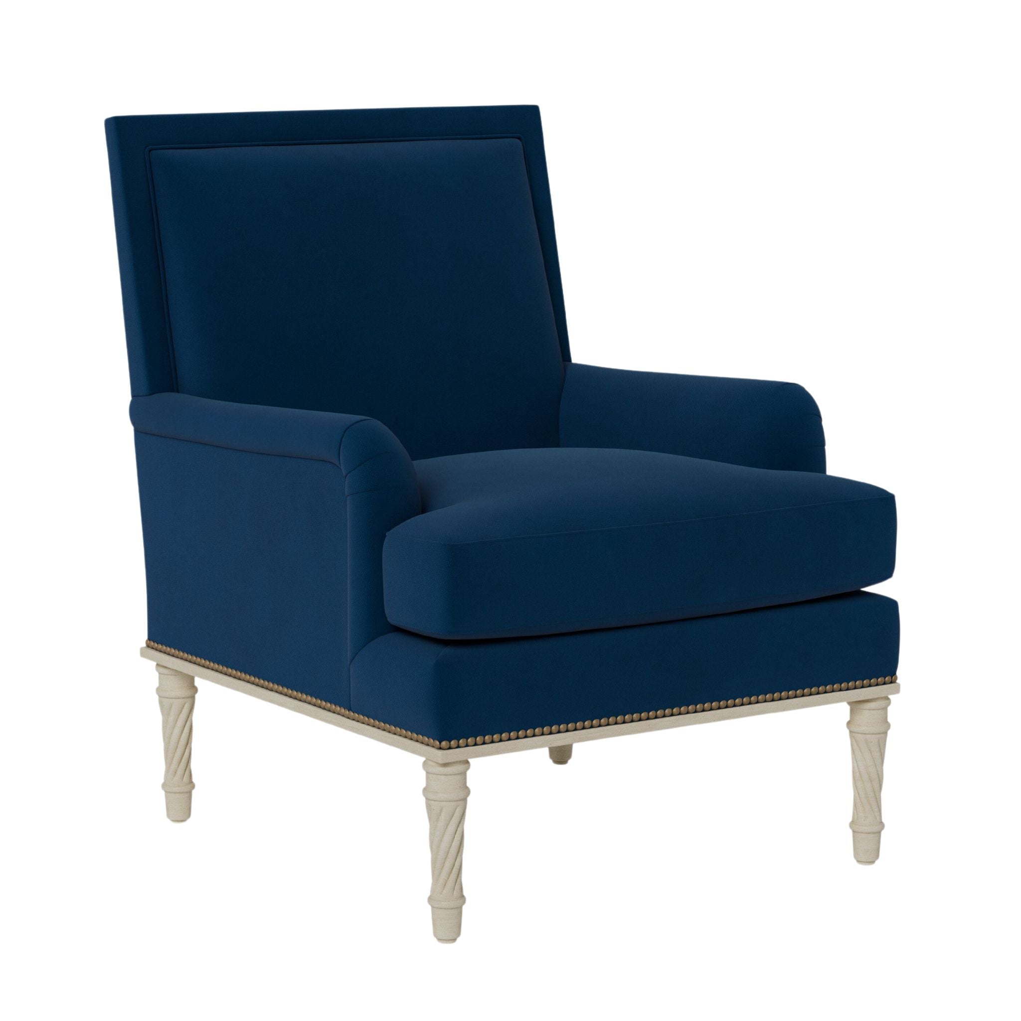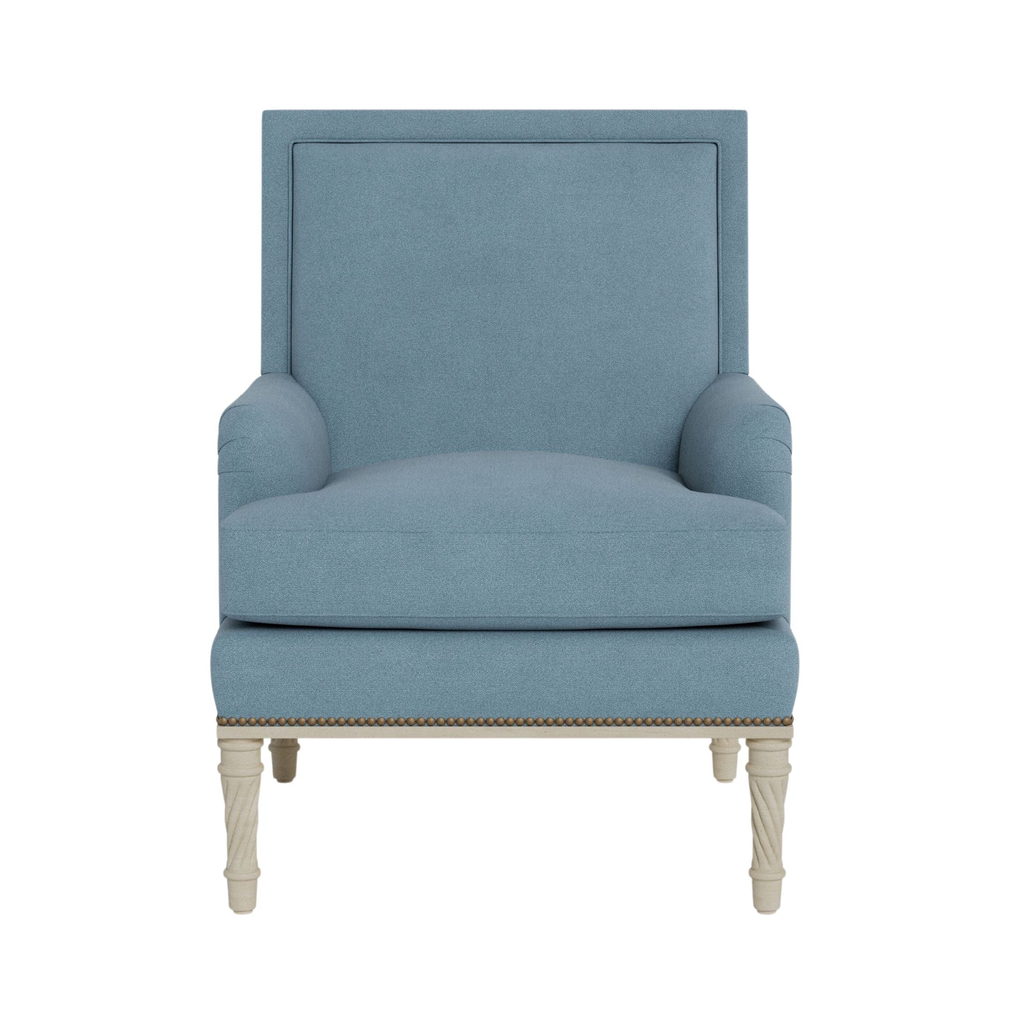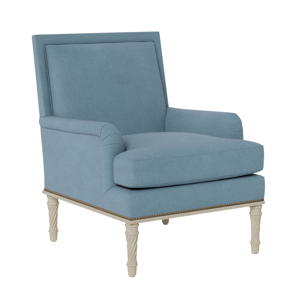 Inspired by the famous Jean-Henri Jansen, a designer known for his exceptional taste and for his work renovating and redecorating the White House, the Bunny Williams Azure chair and matching ottoman brings traditional ornate flourishes into current times. This modern chair boasts rolled arms, carved twisted legs, and stylish French nailhead trim. Perfect to tuck into a peaceful bedroom corner.