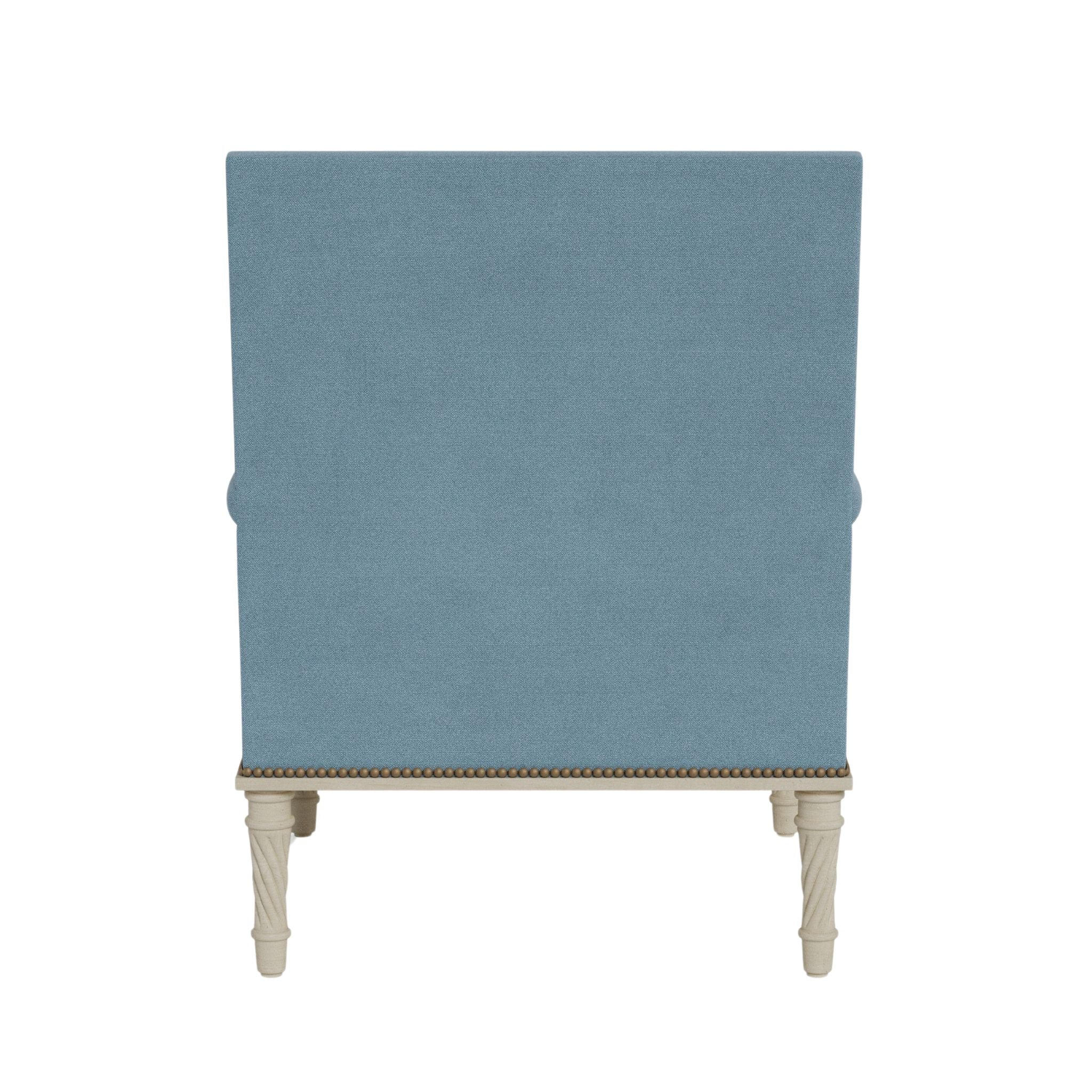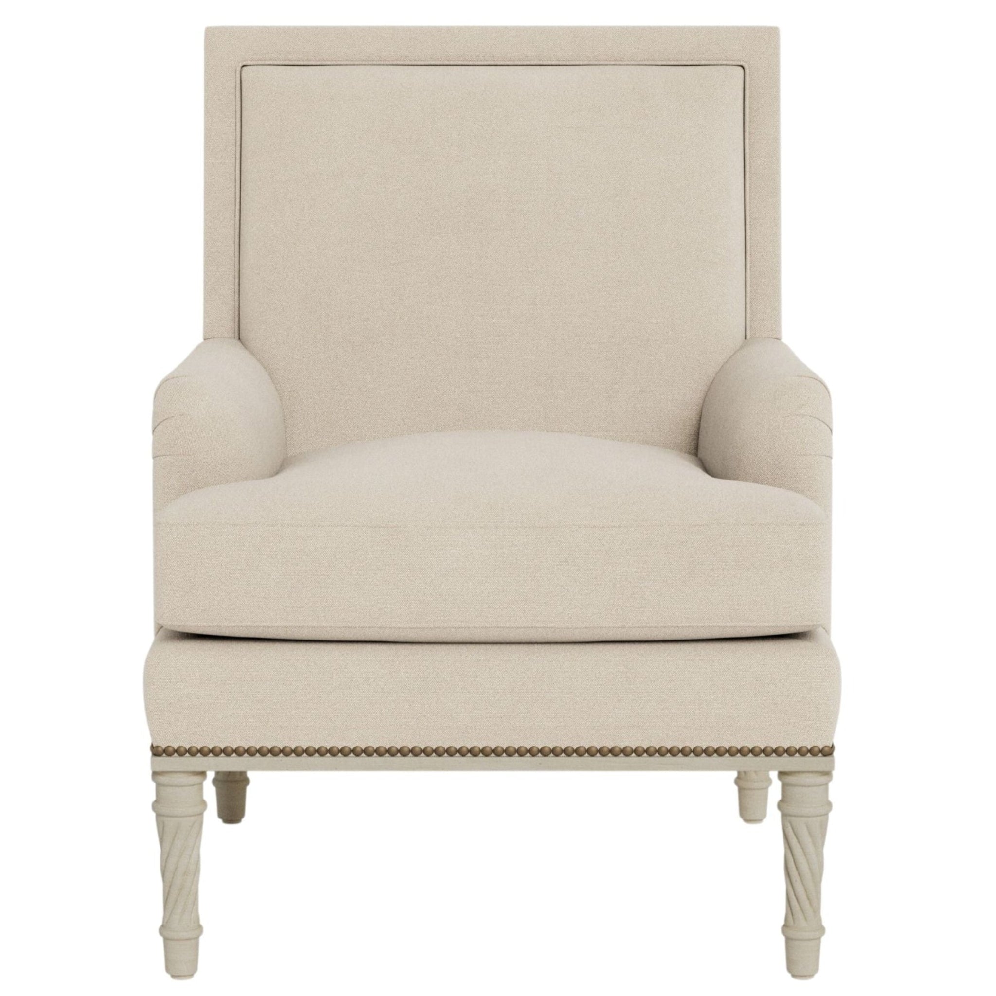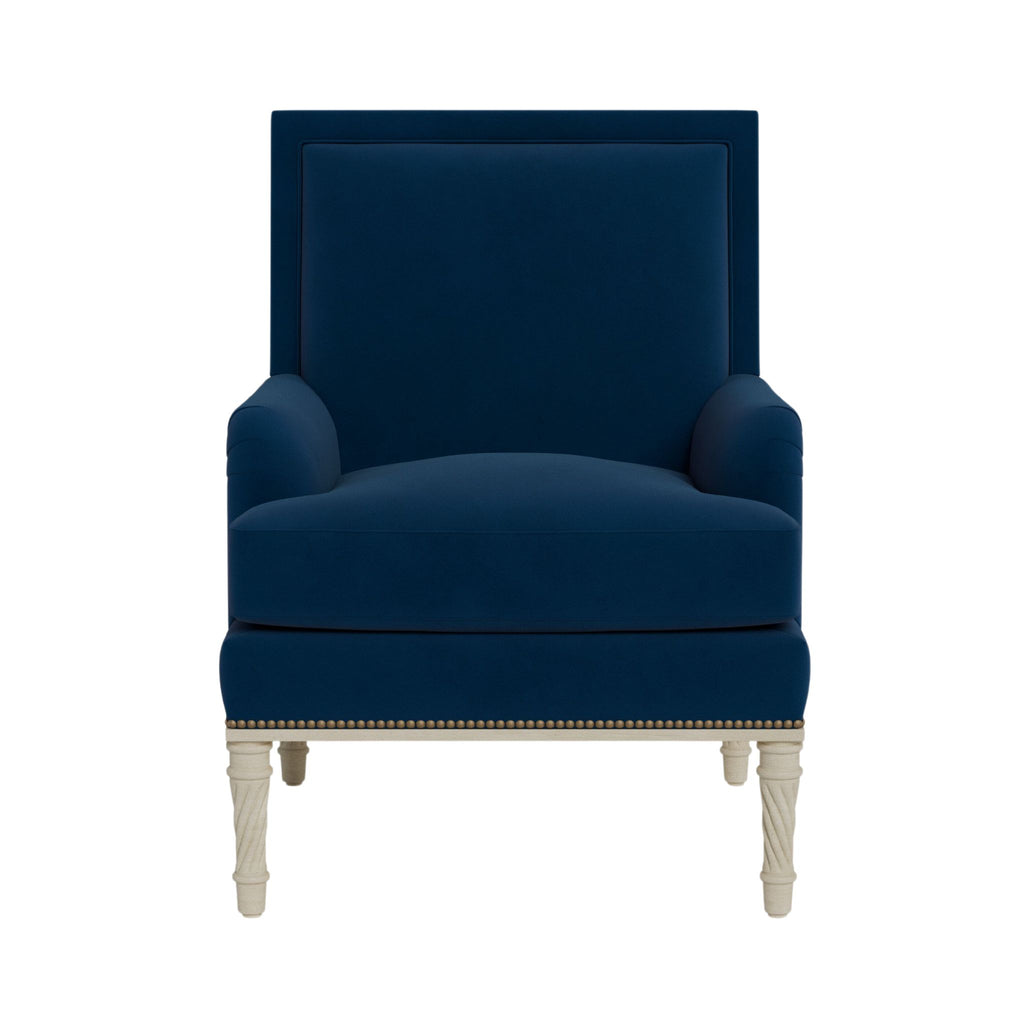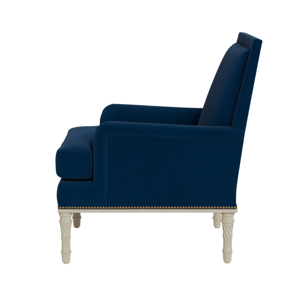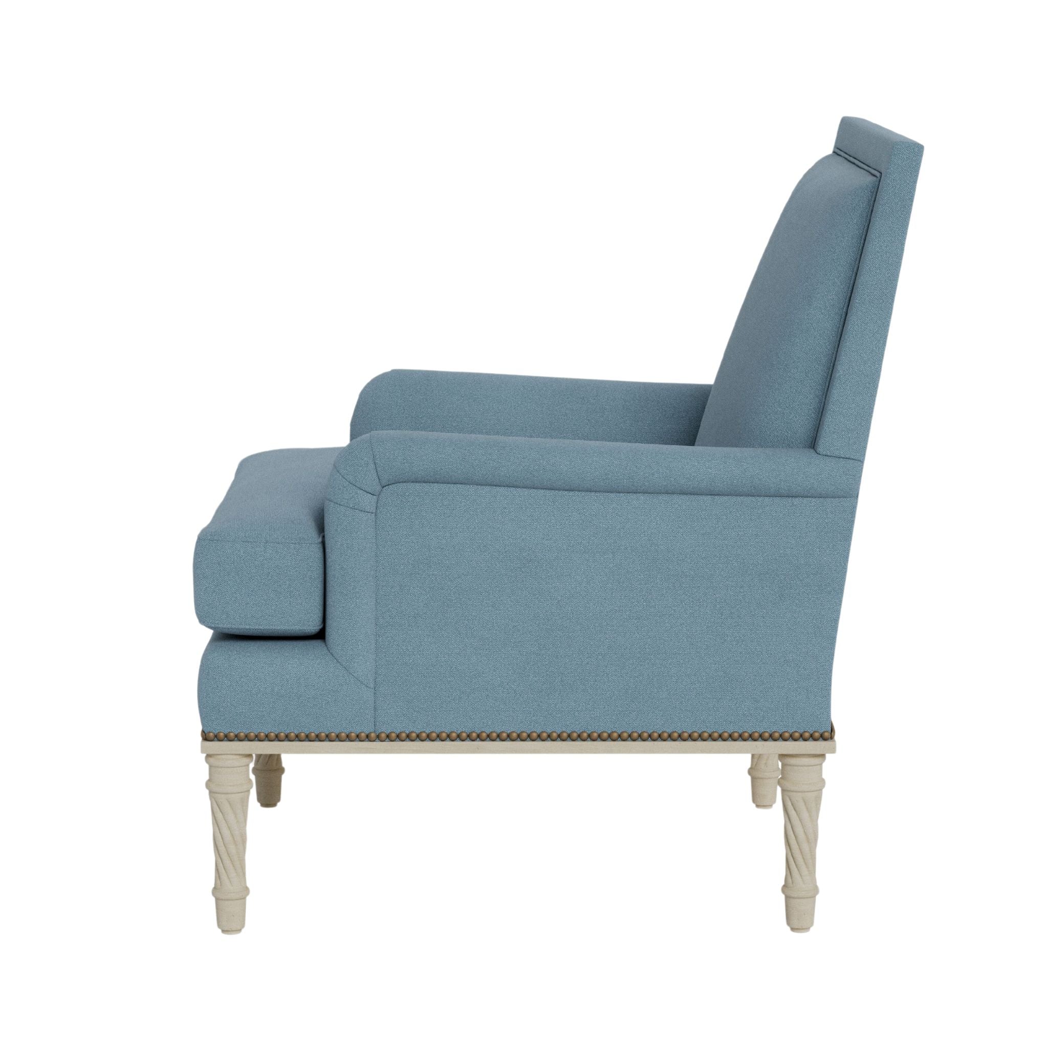 Inspired by the famous Jean-Henri Jansen, a designer known for his exceptional taste and for his work renovating and redecorating the White House, the Bunny Williams Azure chair and matching ottoman brings traditional ornate flourishes into current times. This modern chair boasts rolled arms, carved twisted legs, and stylish French nailhead trim. Perfect to tuck into a peaceful bedroom corner.