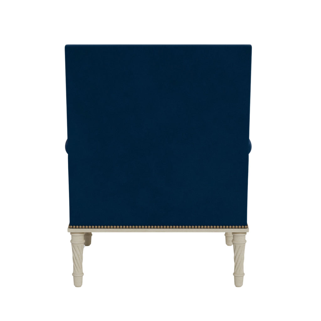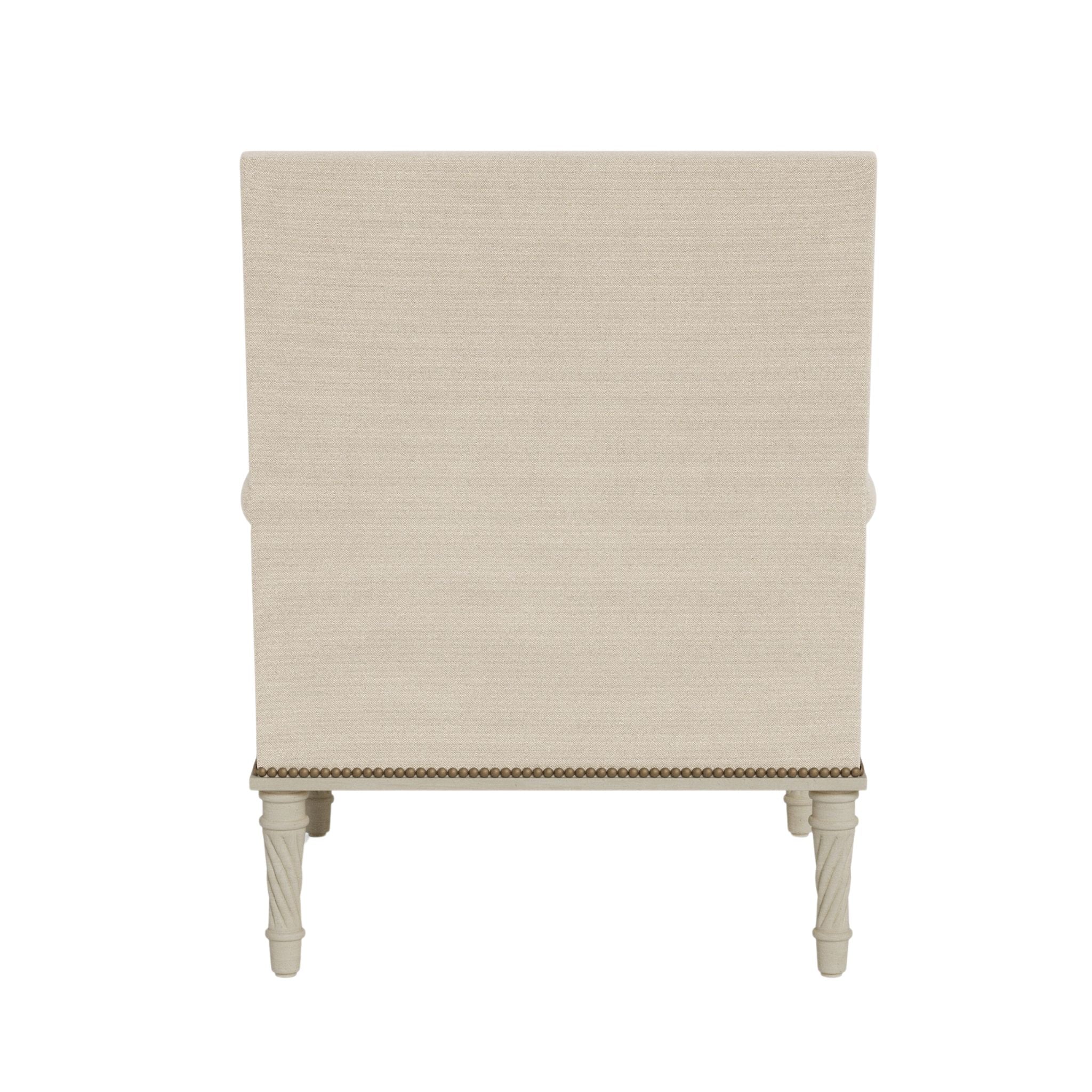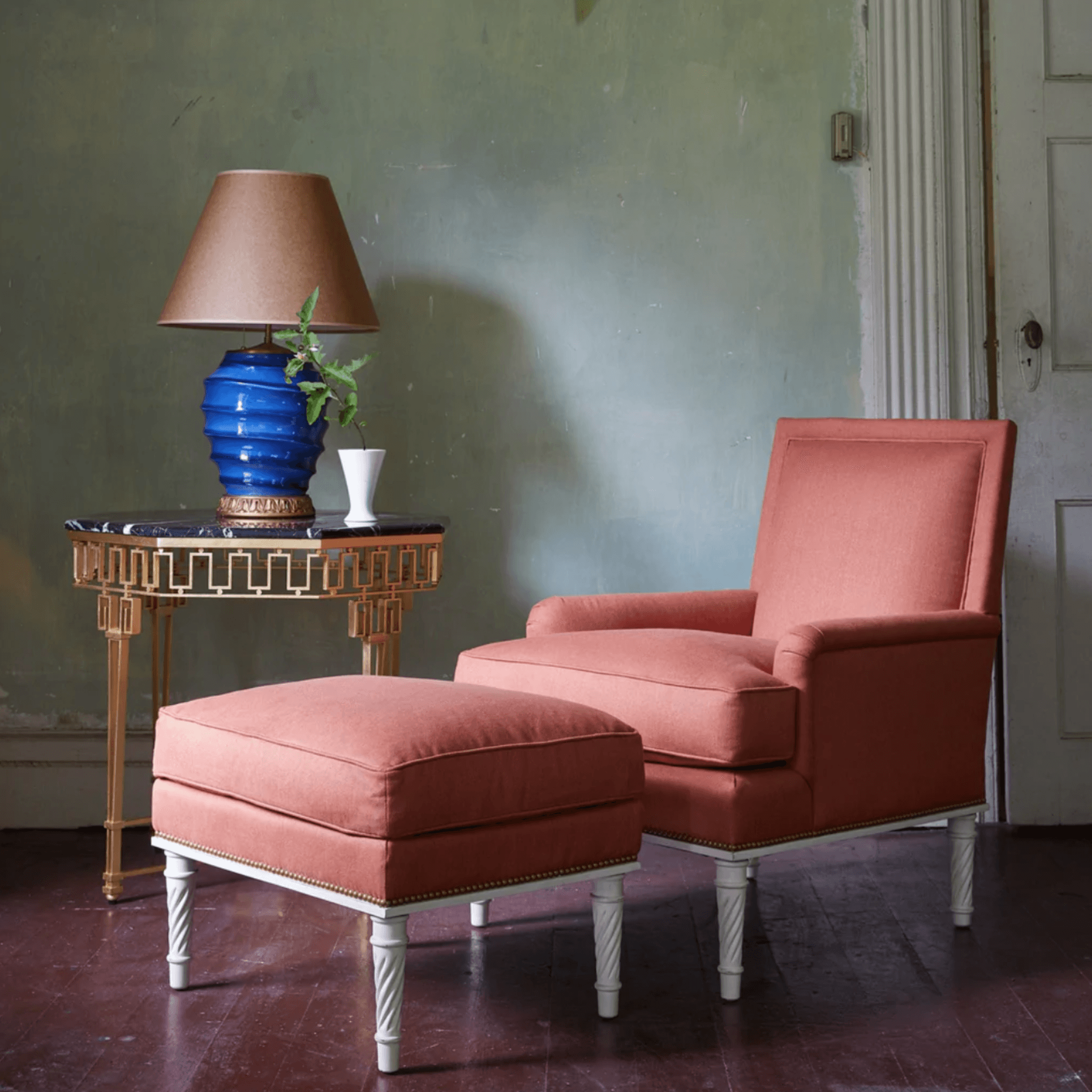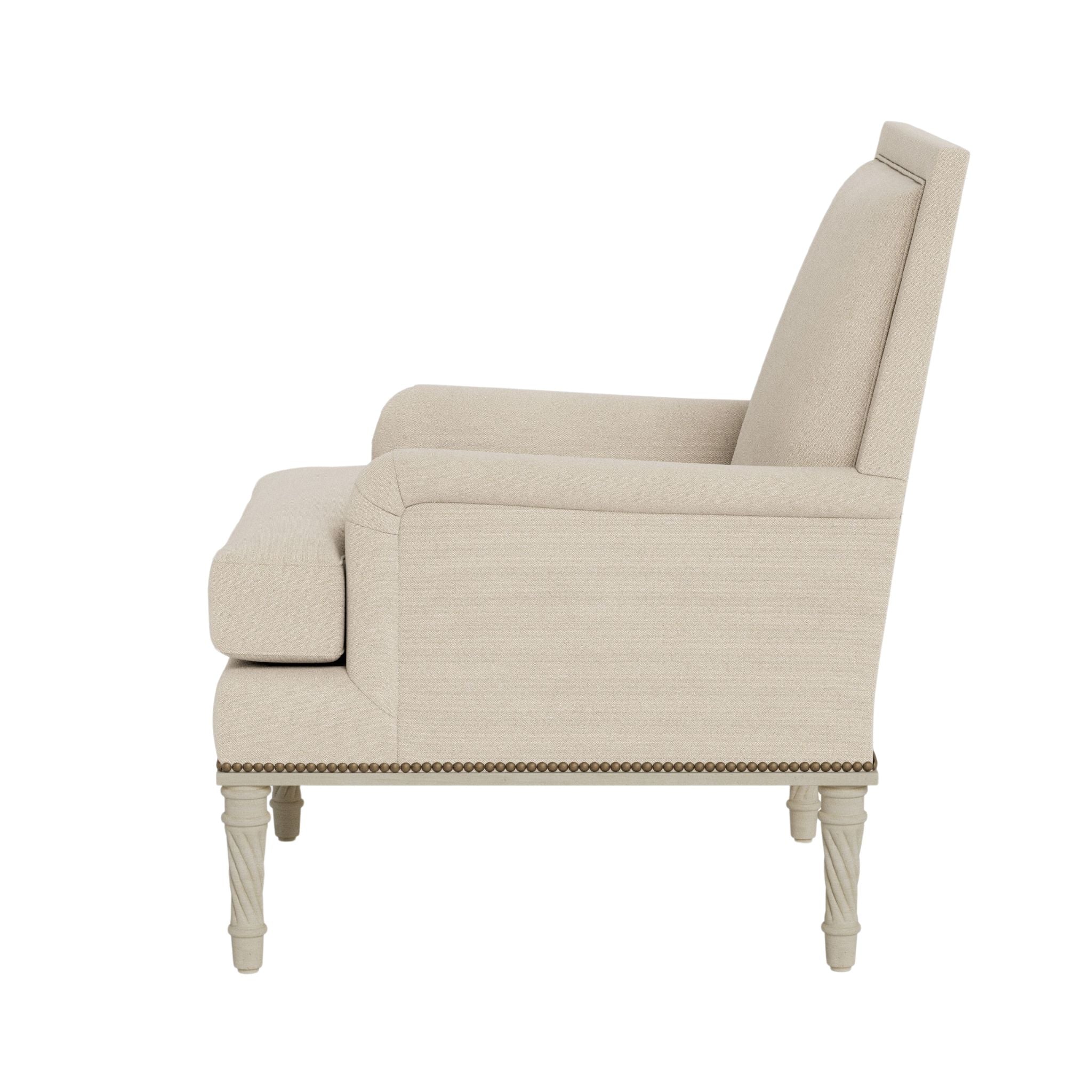 Inspired by the famous Jean-Henri Jansen, a designer known for his exceptional taste and for his work renovating and redecorating the White House, the Bunny Williams Azure chair and matching ottoman brings traditional ornate flourishes into current times. This modern chair boasts rolled arms, carved twisted legs, and stylish French nailhead trim. Perfect to tuck into a peaceful bedroom corner.