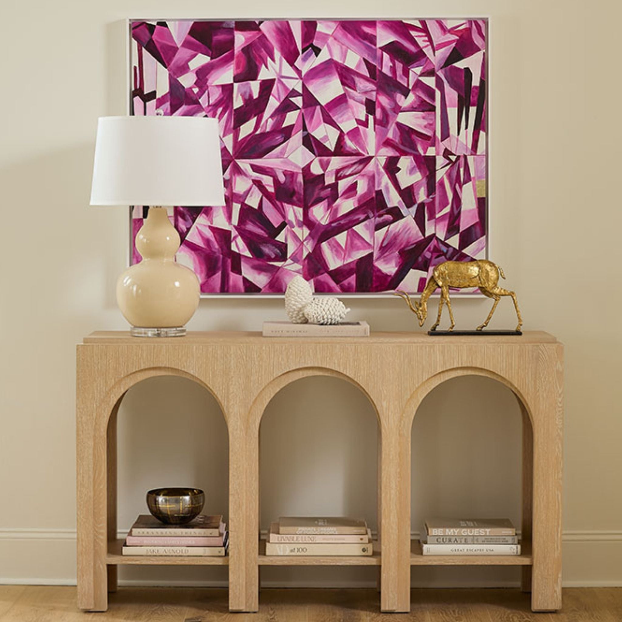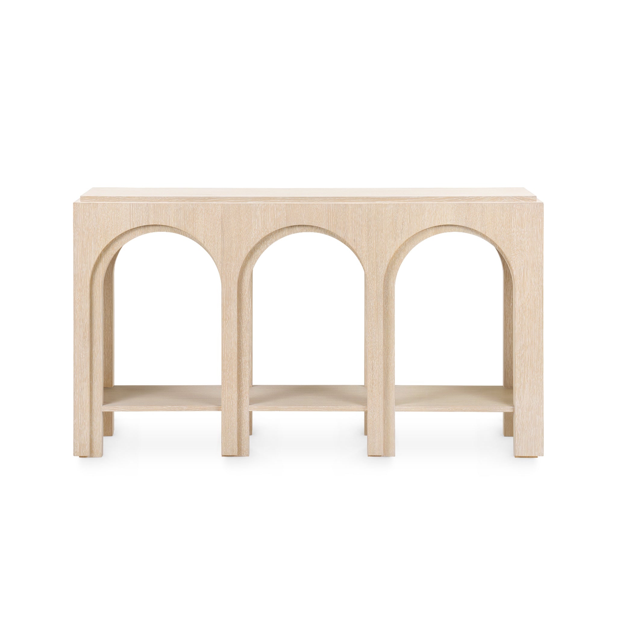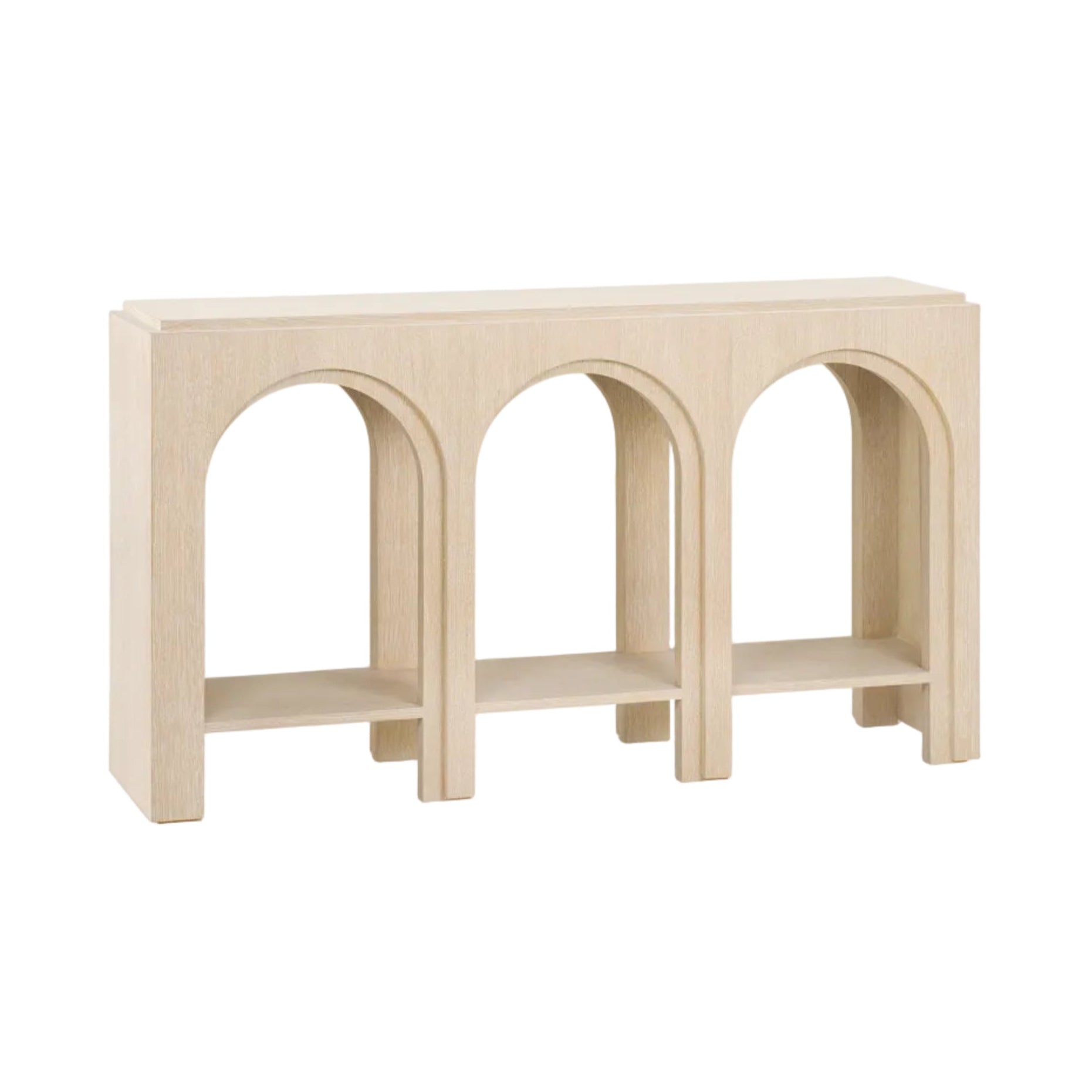 The Dario Console Table combines clean lines with bold visual impact, featuring a sleek silhouette crafted from bleached cerused oak. Its signature tessellated arch detailing adds depth and graphic character, making it a striking yet versatile statement piece for modern interiors.