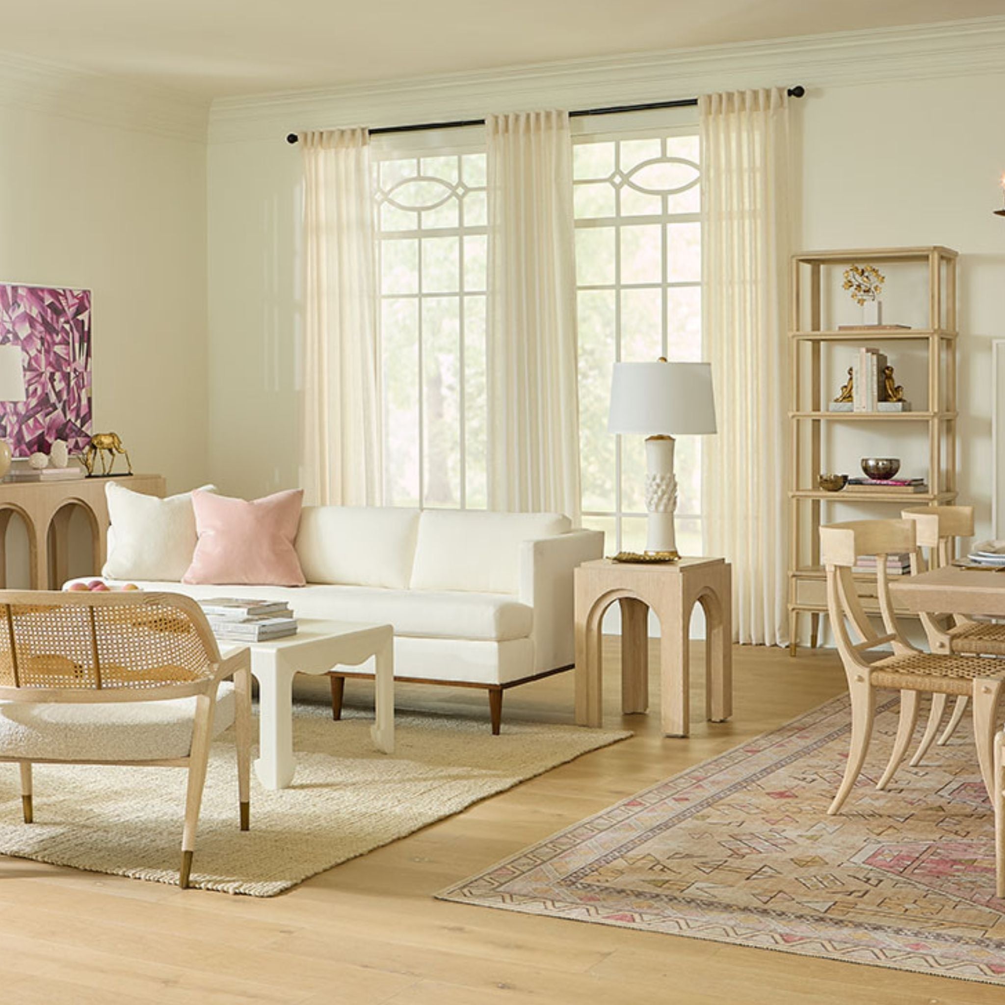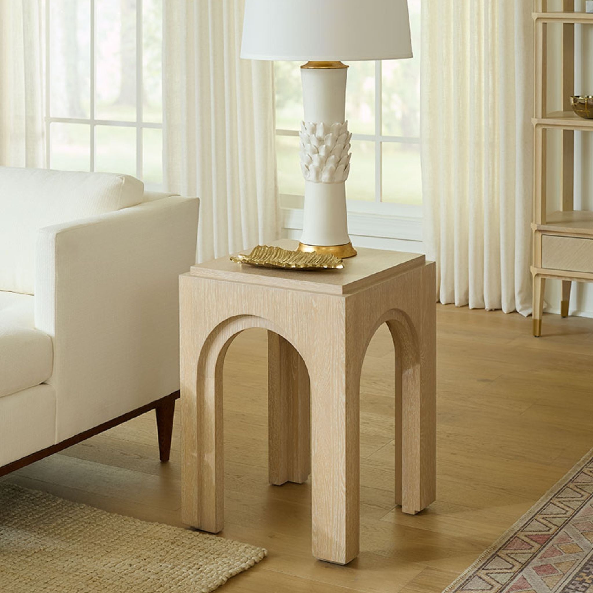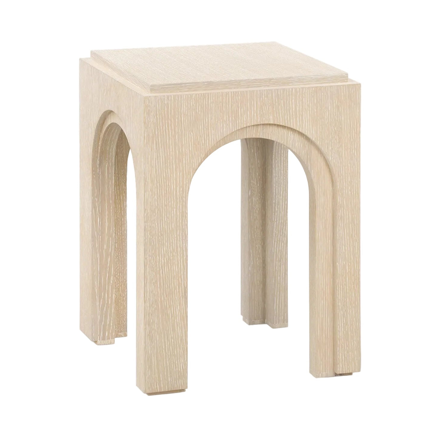The Dario Side Table brings sculptural presence to any space with its clean square silhouette and striking tessellated arch detailing on all sides. Crafted from clear-lacquered bleached cerused oak, it showcases rich wood grain and a subtly elevated top that adds a refined, modern touch.