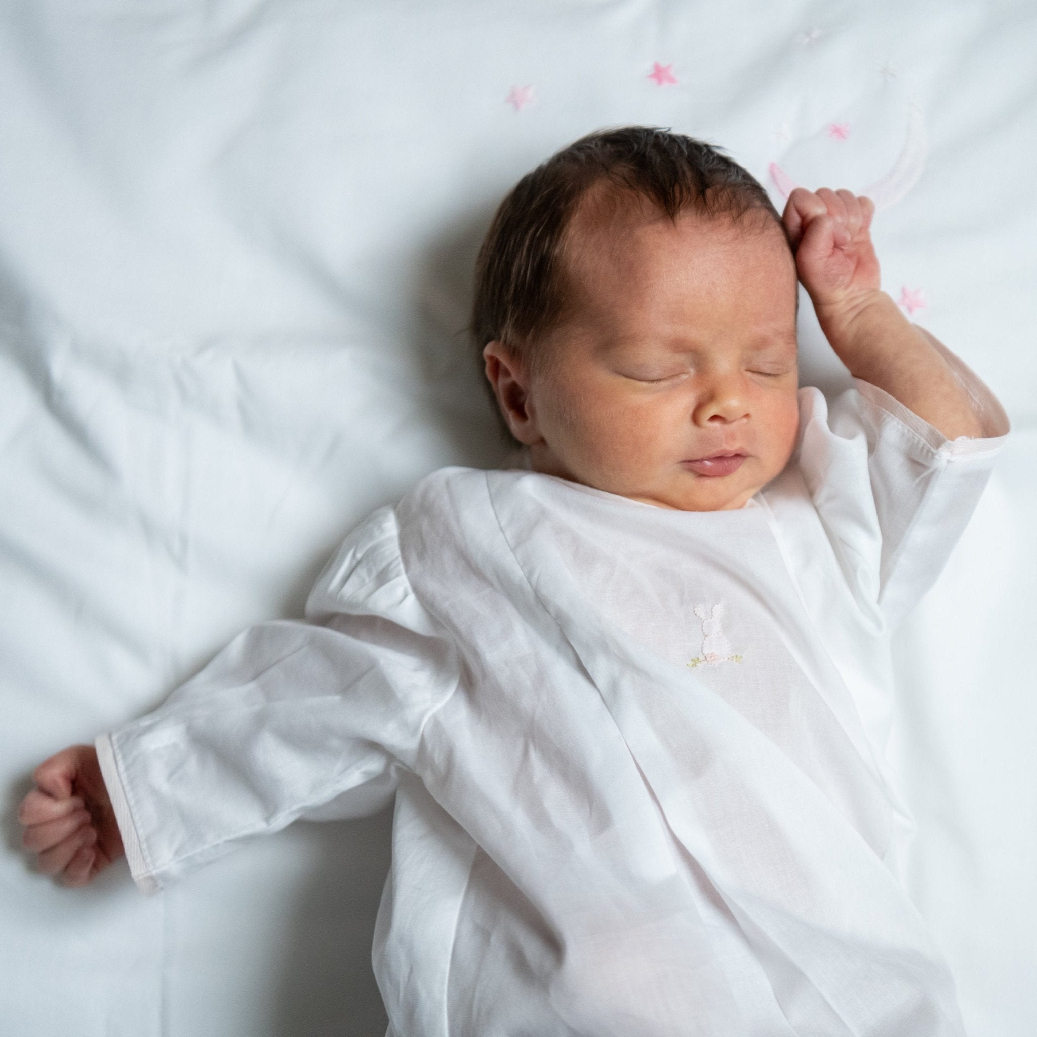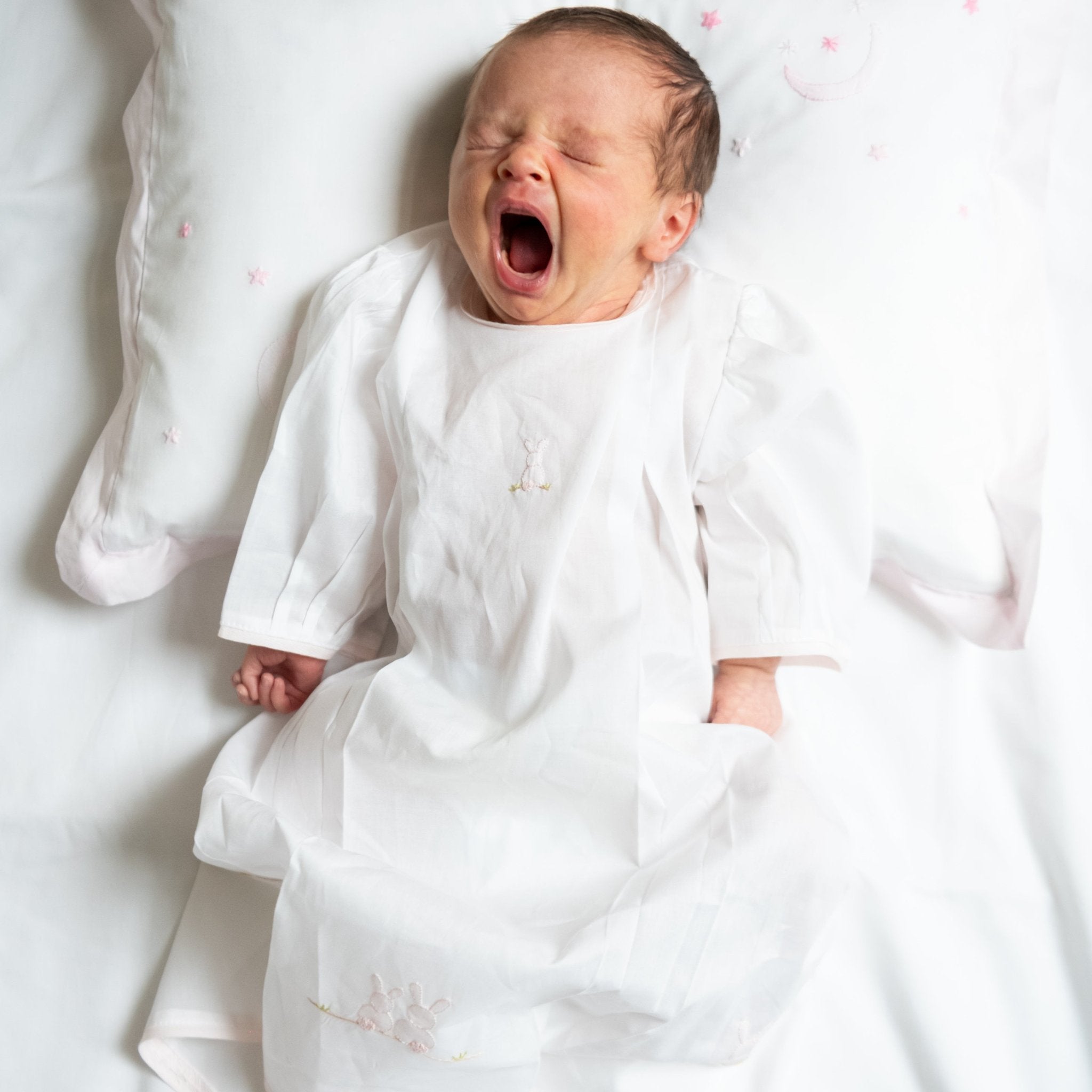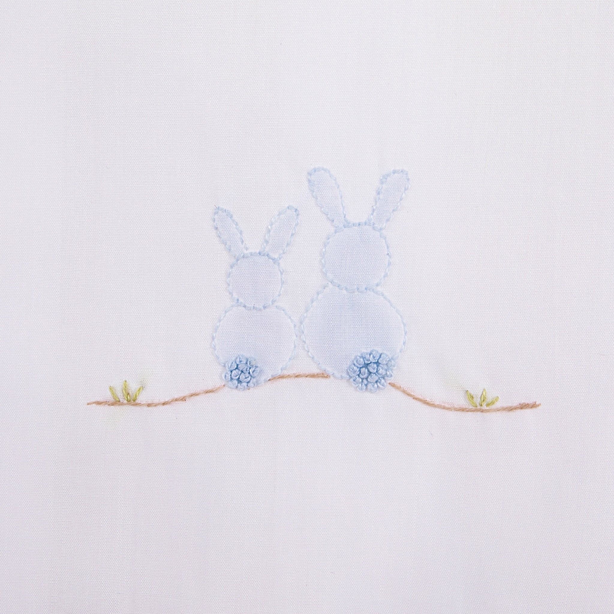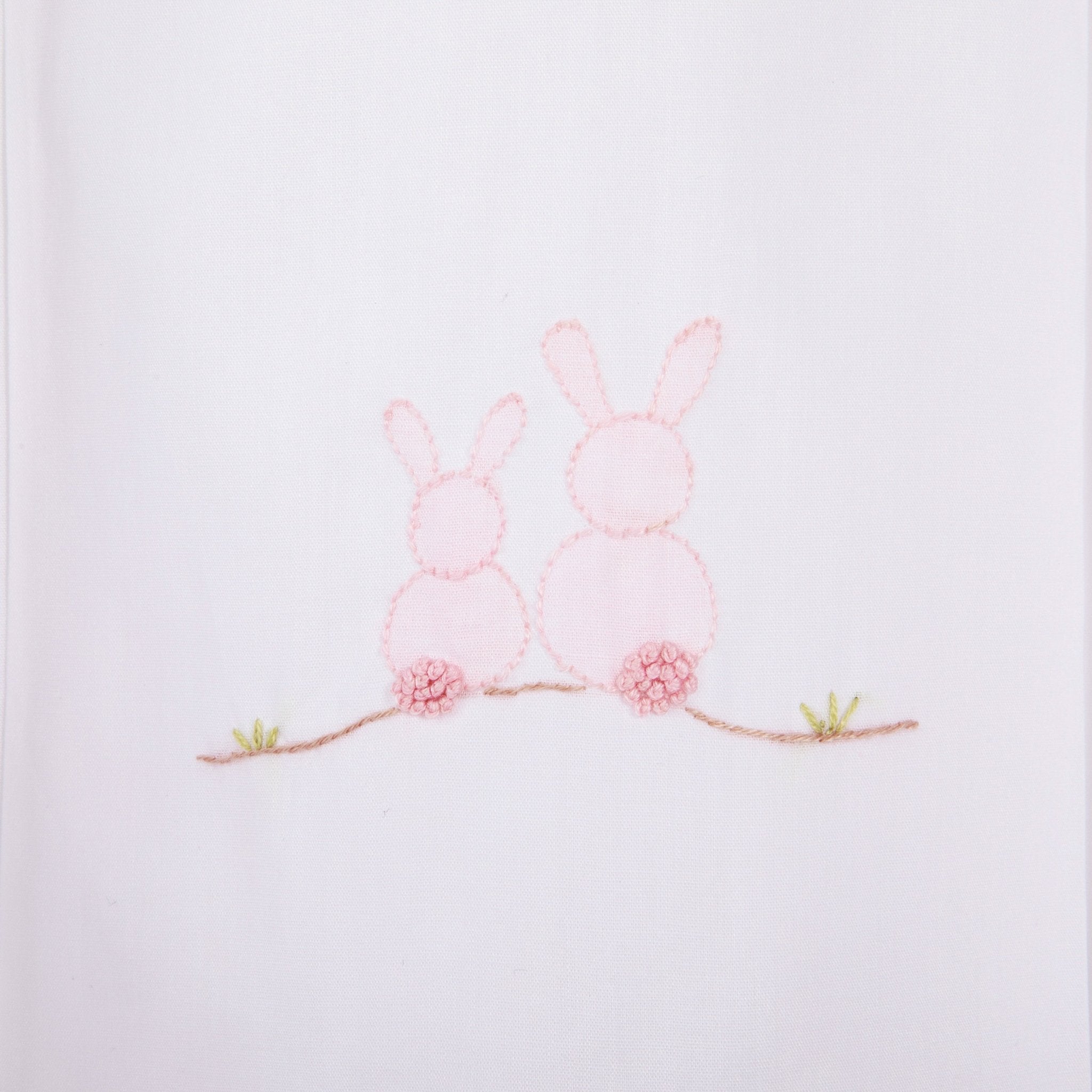 Our Baby Bunny Daygown is made with lightweight, Batiste Cotton. The mother of pearl button back gown features pintuck, ragland sleeves and is trimmed with a brushed cotton straight trim at the neck, sleeve, hem and matching diaper cover.  The front bodice has 2 inverted box pleats adorned with hand embroidered french knot and shadow work bunnies. Darling Details.
