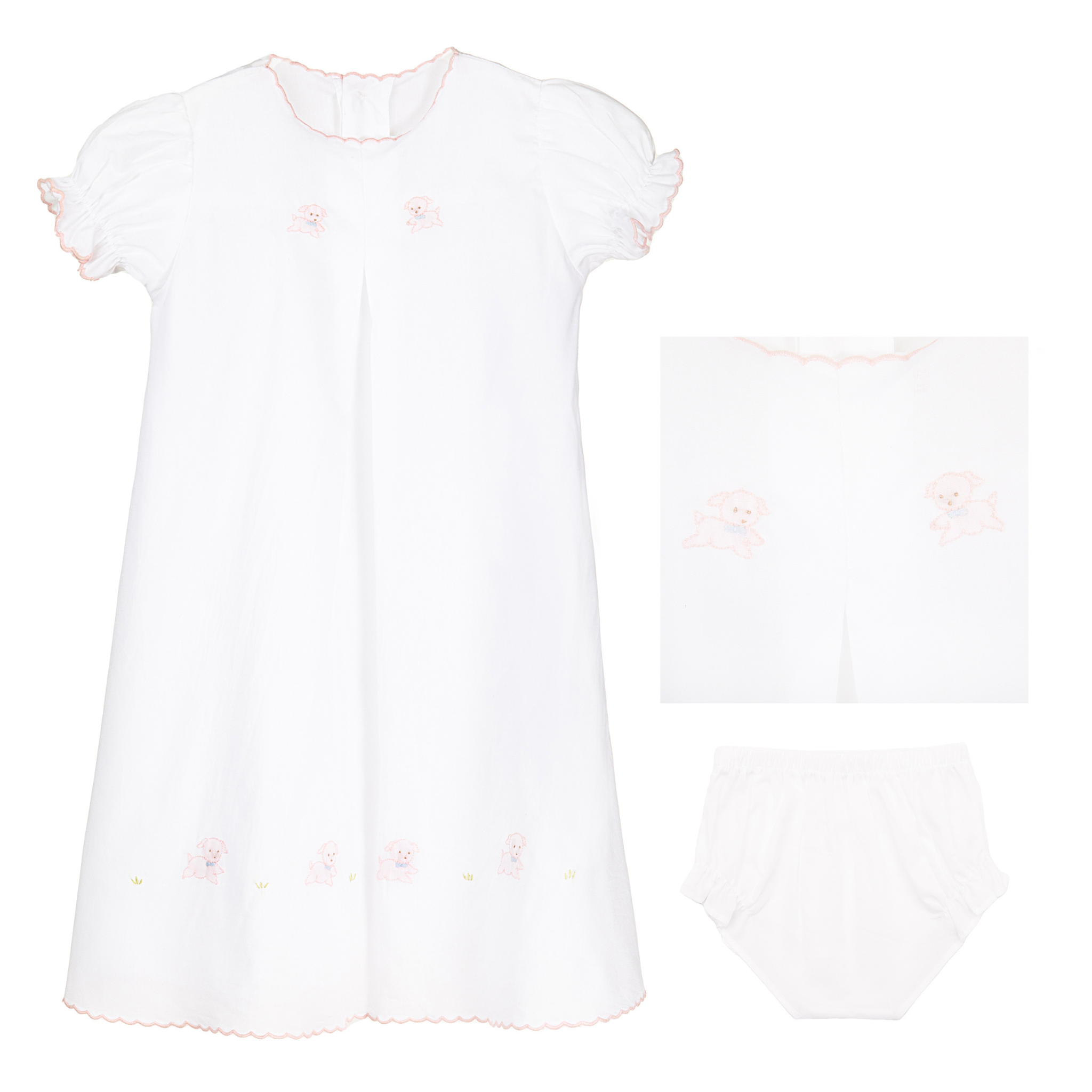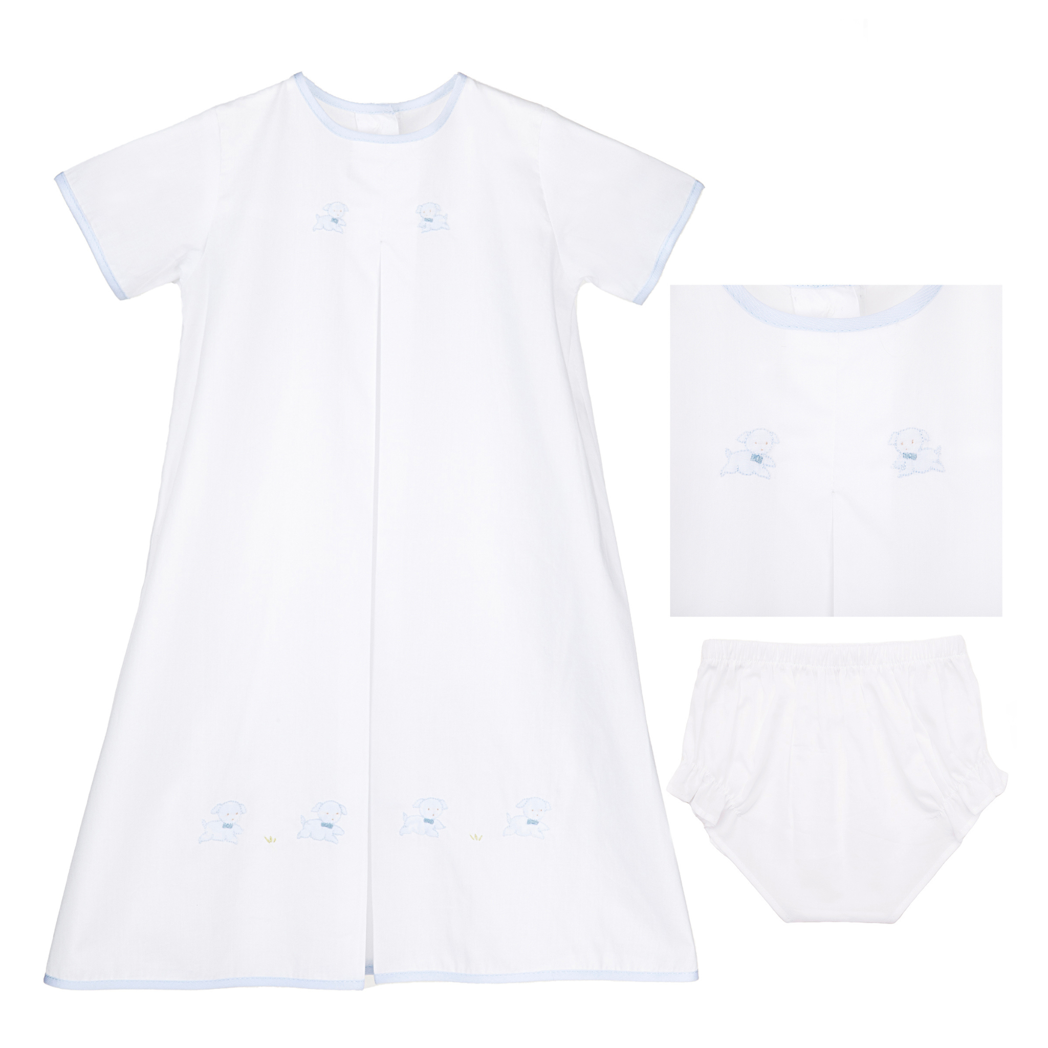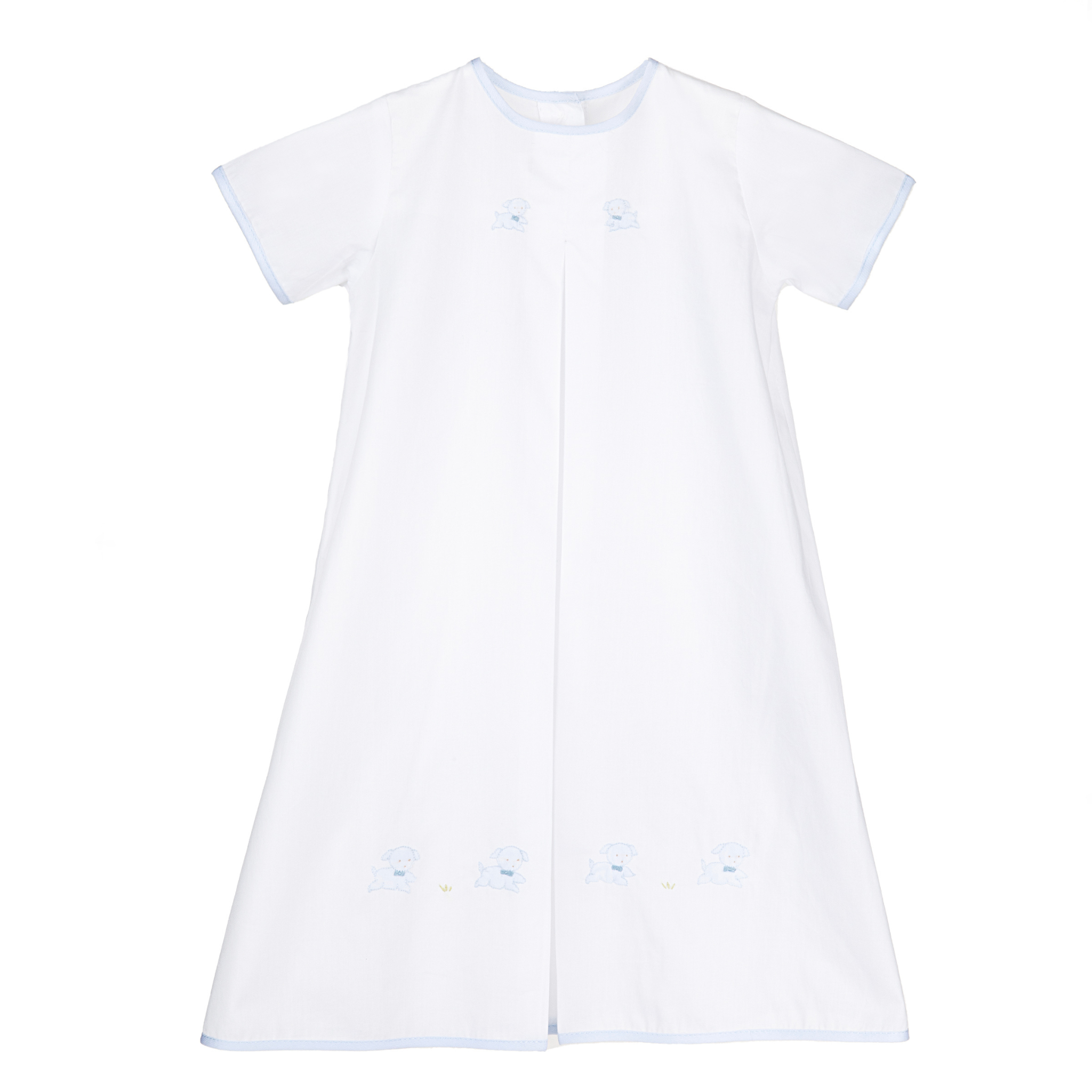 Our Puppy Daygown is made with a beautiful Batiste Cotton. The mother of pearl button back design has an inverted box pleat down the front and is embellished with hand embroidered shadow work puppies on the bodice and hemline. The girl gown has a scalloped thread embroidered neckline, hemline and on the gathered sleeve. The boy version has a straight tape trim along the neck, hem and the ragland sleeves. Hand Embroidered Puppy Love.