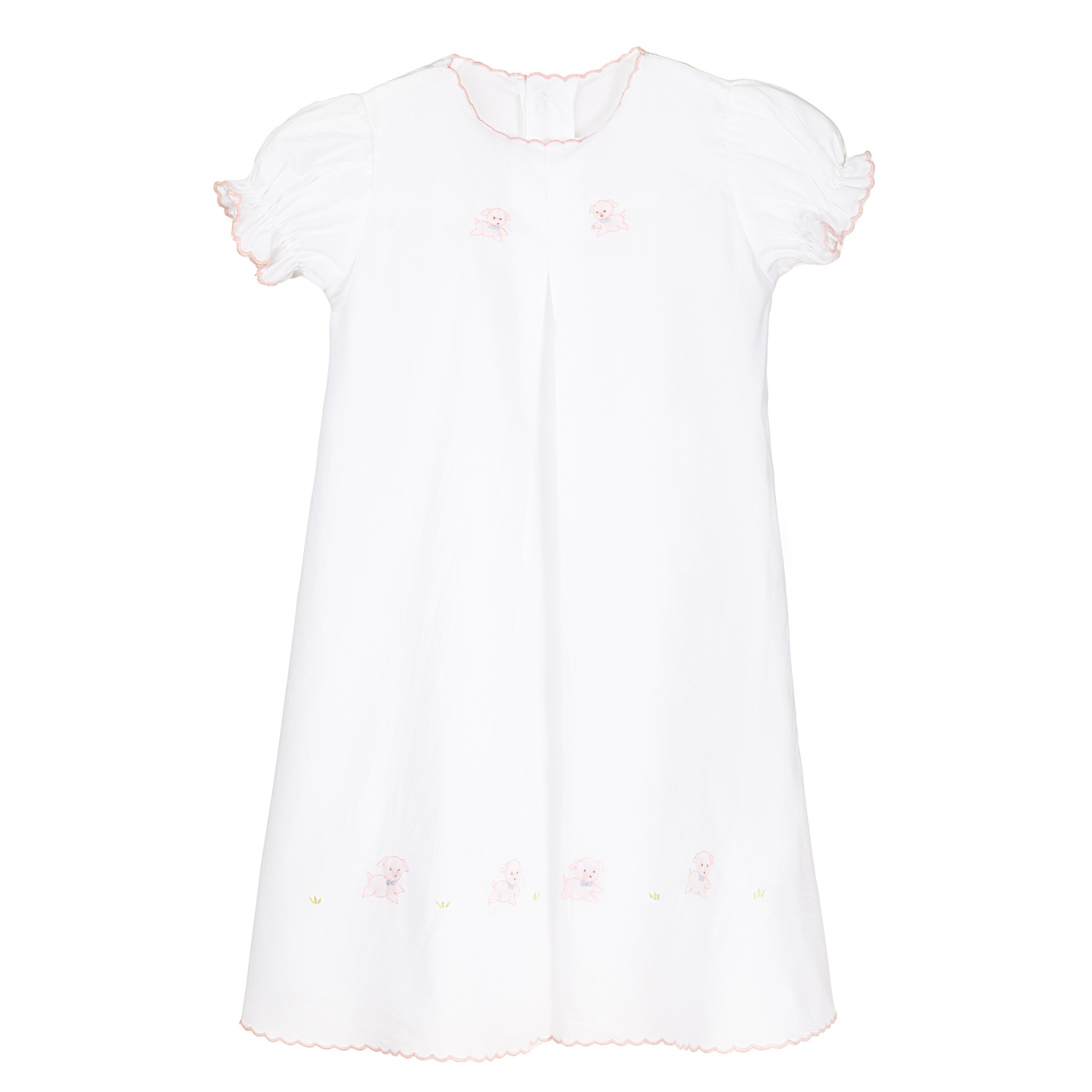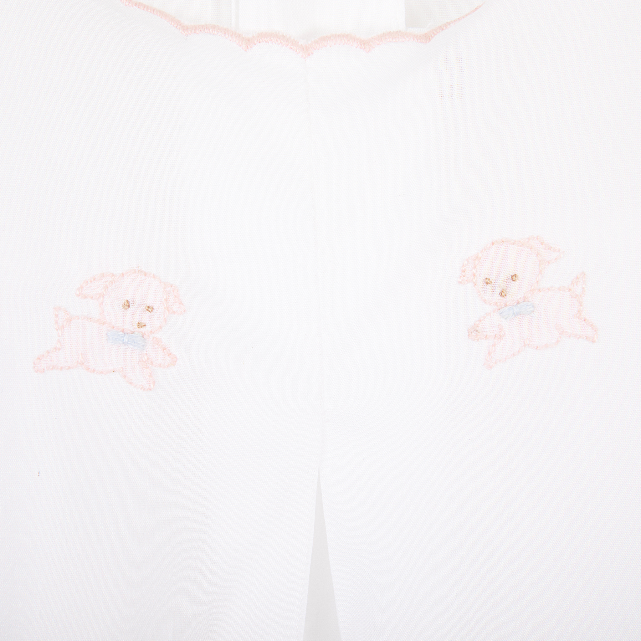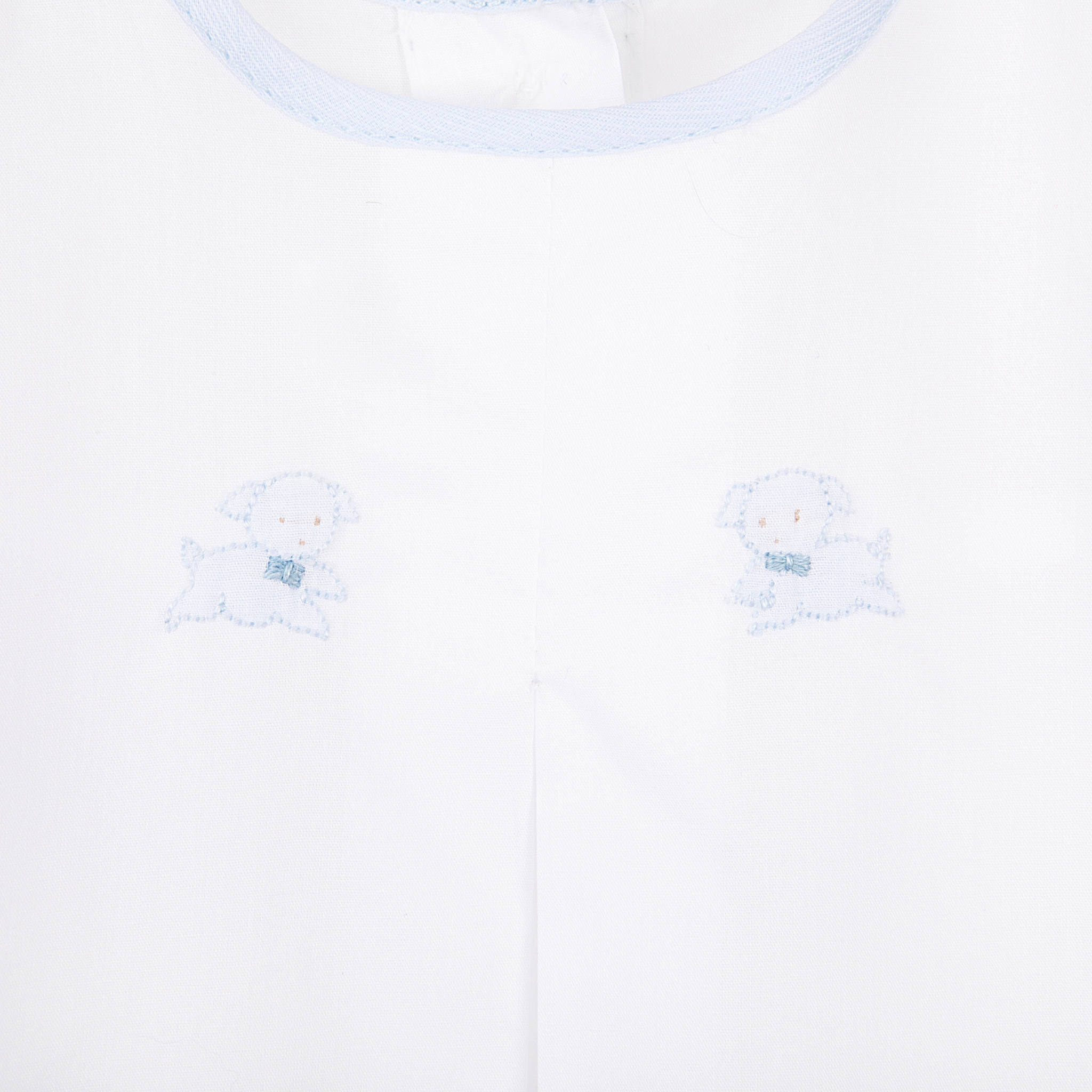 Our Puppy Daygown is made with a beautiful Batiste Cotton. The mother of pearl button back design has an inverted box pleat down the front and is embellished with hand embroidered shadow work puppies on the bodice and hemline. The girl gown has a scalloped thread embroidered neckline, hemline and on the gathered sleeve. The boy version has a straight tape trim along the neck, hem and the ragland sleeves. Hand Embroidered Puppy Love.