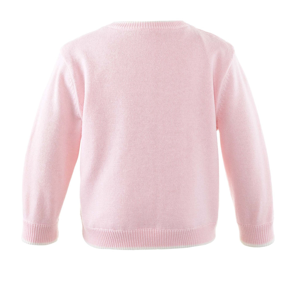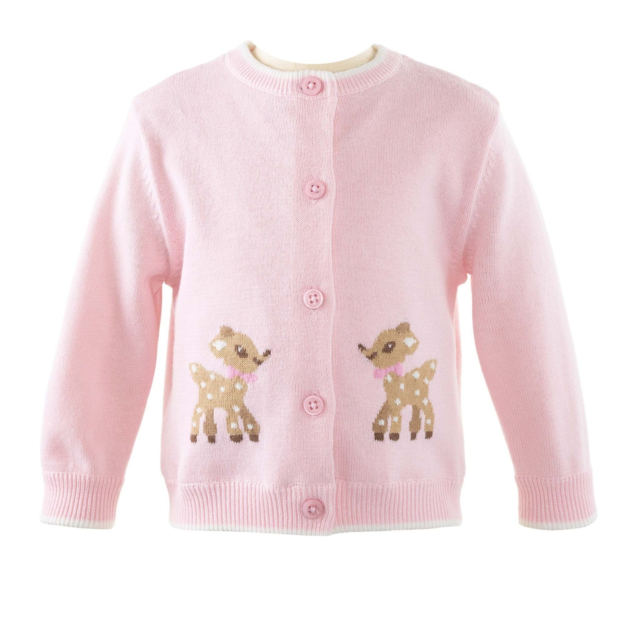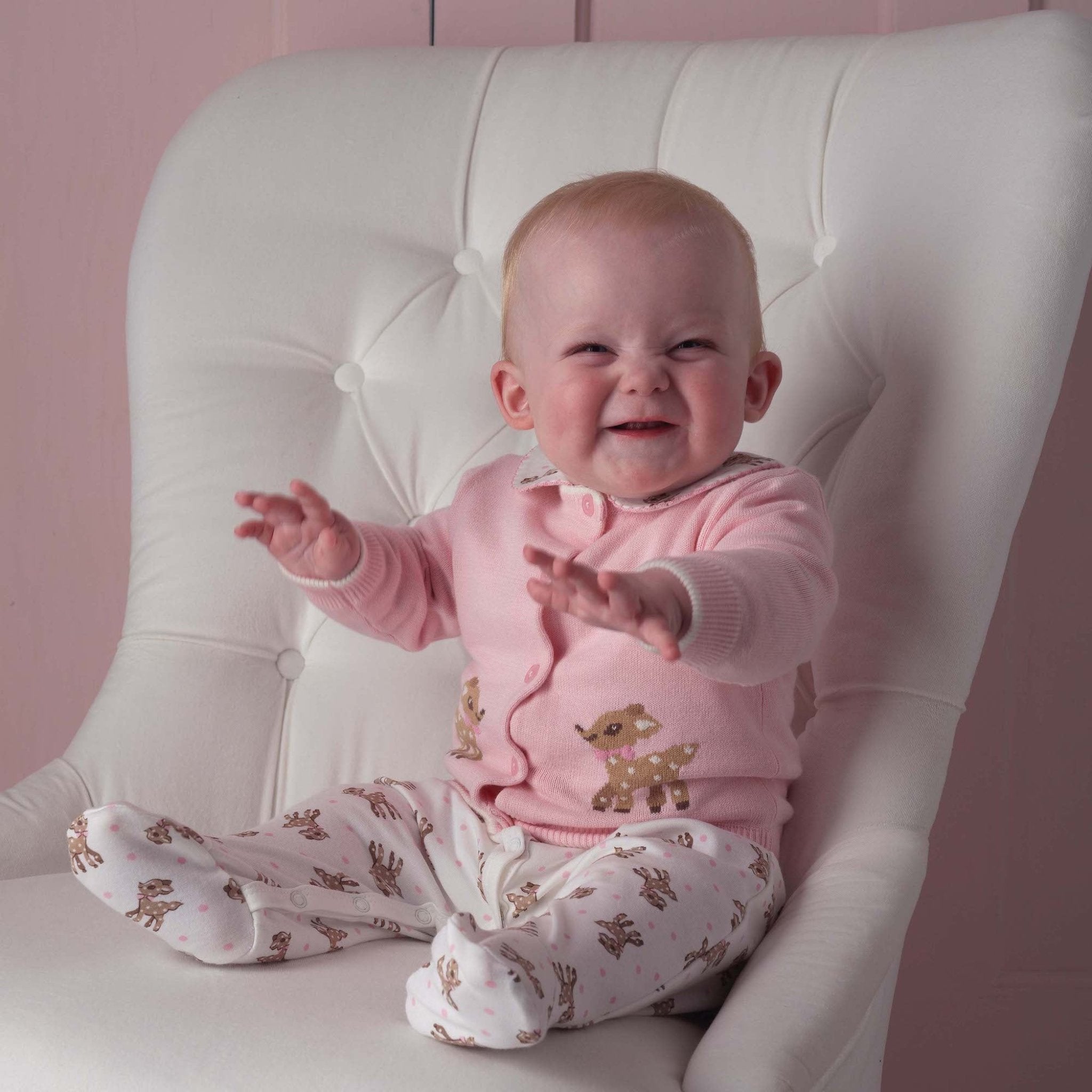 Soft cotton knitted cardigan with fawn intarsia in a soft shade of pink, with ivory tipping. Lined in the body with soft cotton jersey for comfort and extra warmth.