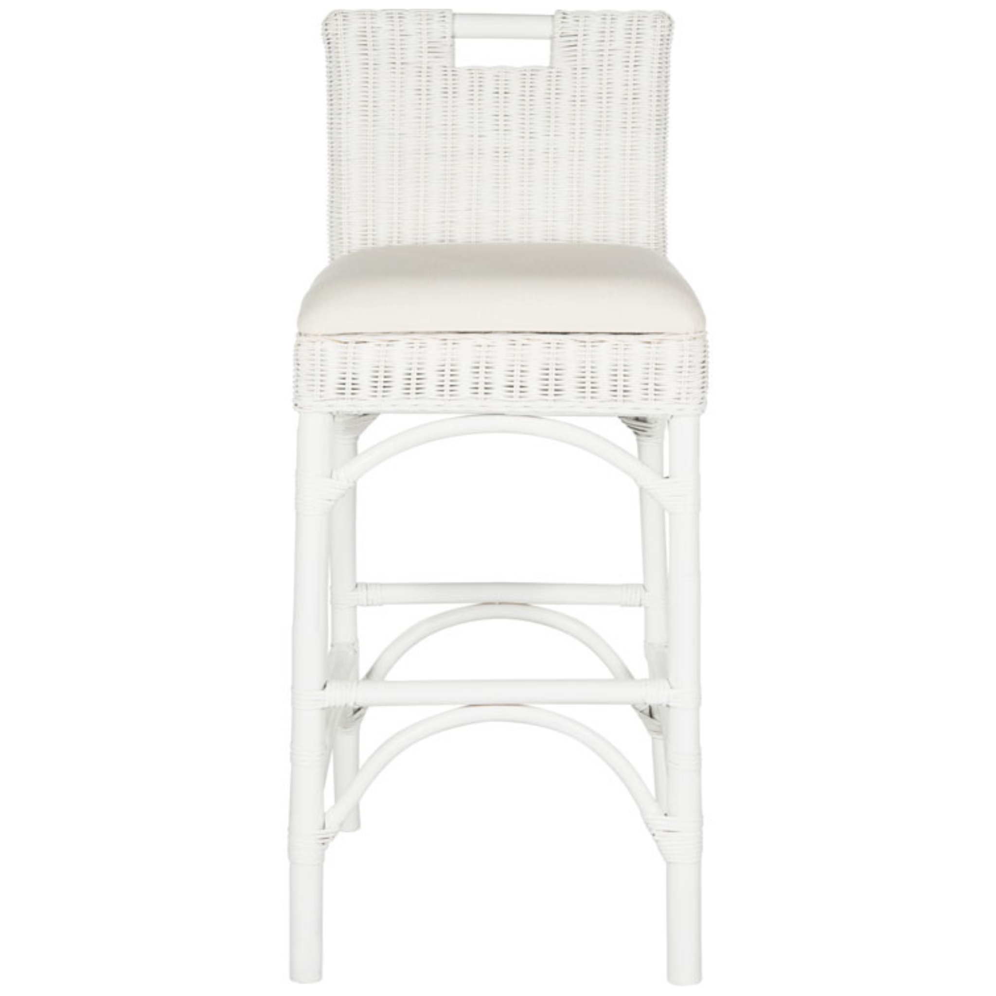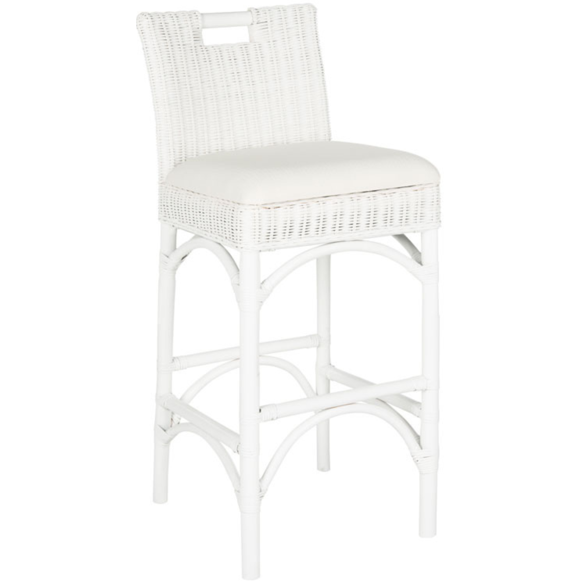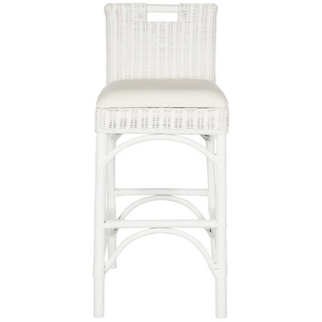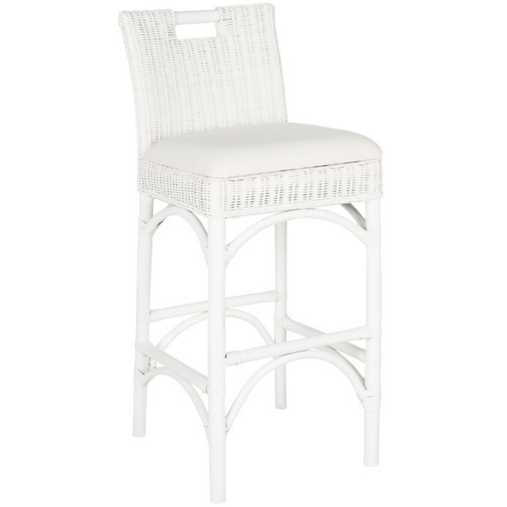 A modern take on classic Thonet design, this white rattan bar stool blends a contemporary seat back with the graceful bentwood curves of traditional European bistro chairs. Finished with a soft white poly-cotton cushion, it offers inviting comfort—perfect for long, relaxed conversations in the kitchen. Click on images for greater detail.