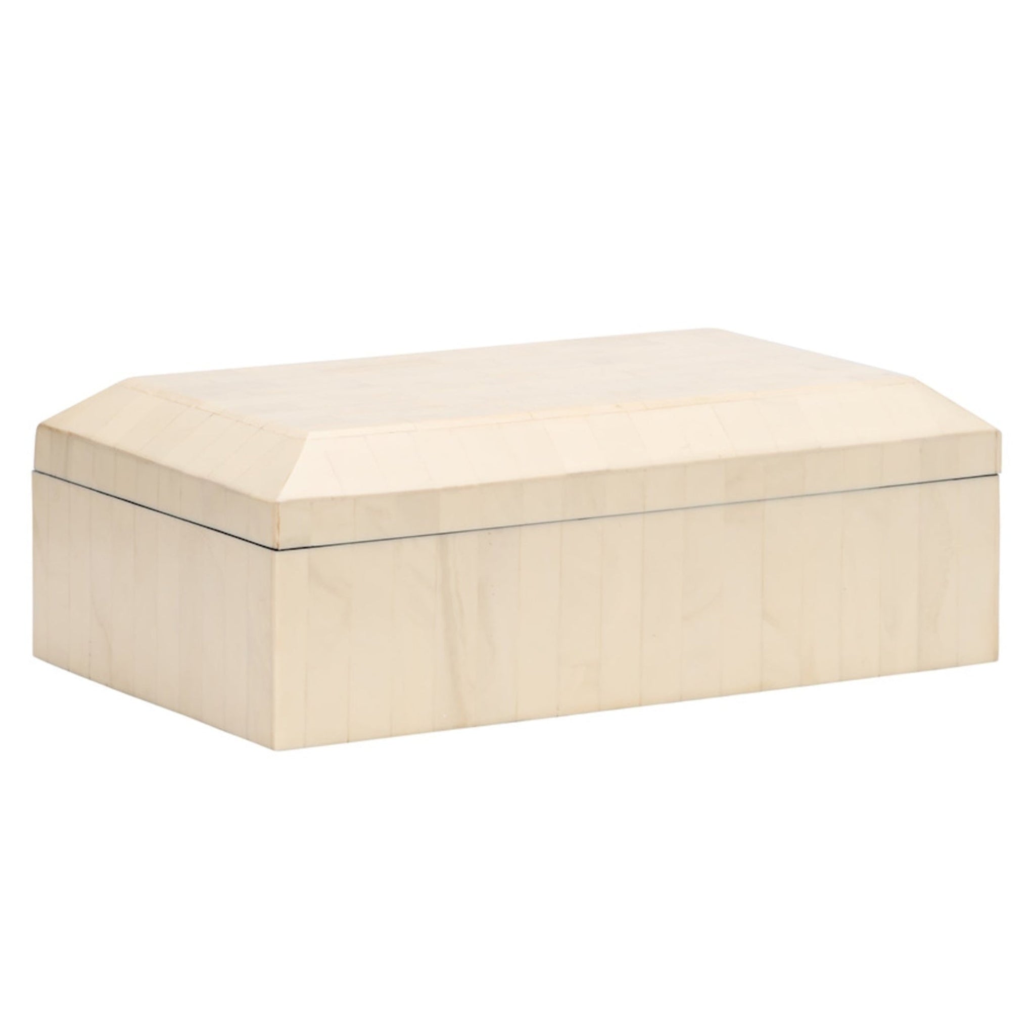 The Natural Bone Inlay Box features a sophisticated white geometric pattern on a warm, natural background, offering timeless charm and style. Its hinged lid makes it perfect for storing keepsakes, jewelry, or small treasures while enhancing any tabletop or shelf.