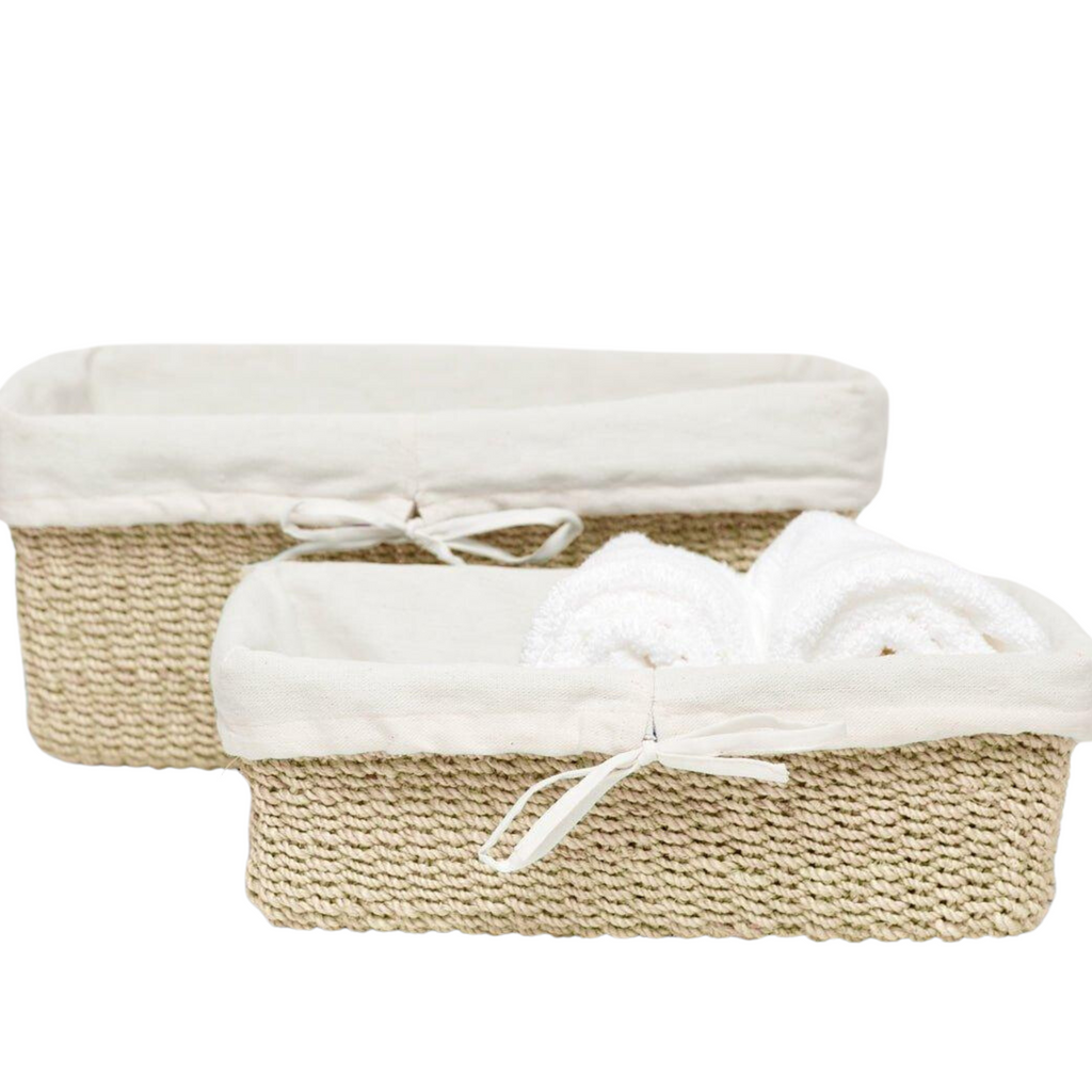 Sweet woven abaca trays or baskets. Lined with a removable linen cover. Sold as a set of two.