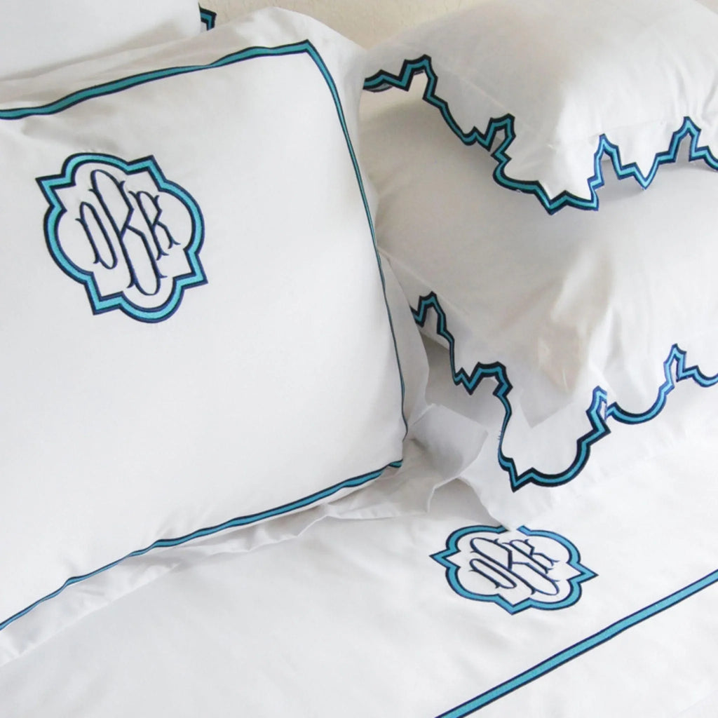 Our Ibiza Scalloped Sham comes in a crisp white 100% Egyptian Cotton with a preppy and fun two-tone blue scalloped border. Featuring a luxurious 330 thread count, this bedding collection is sure to give you a wonderful yet stylish night's sleep.