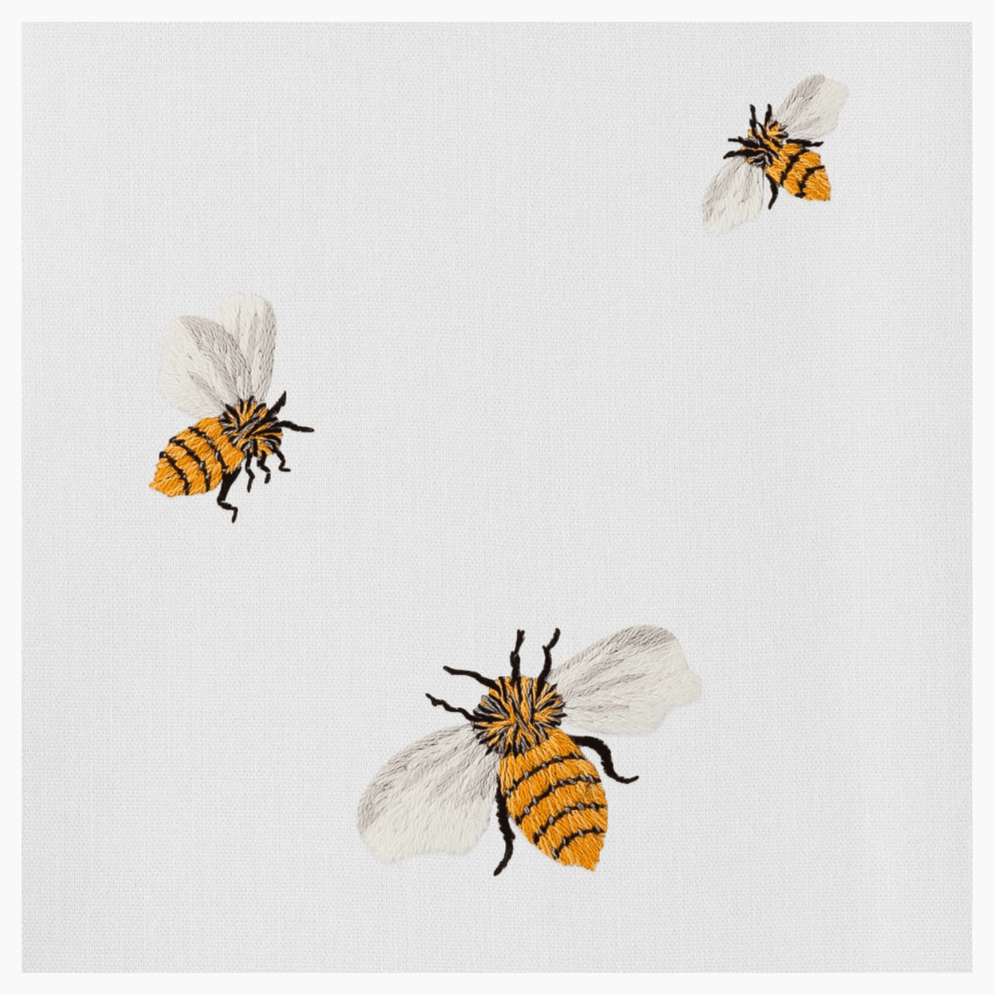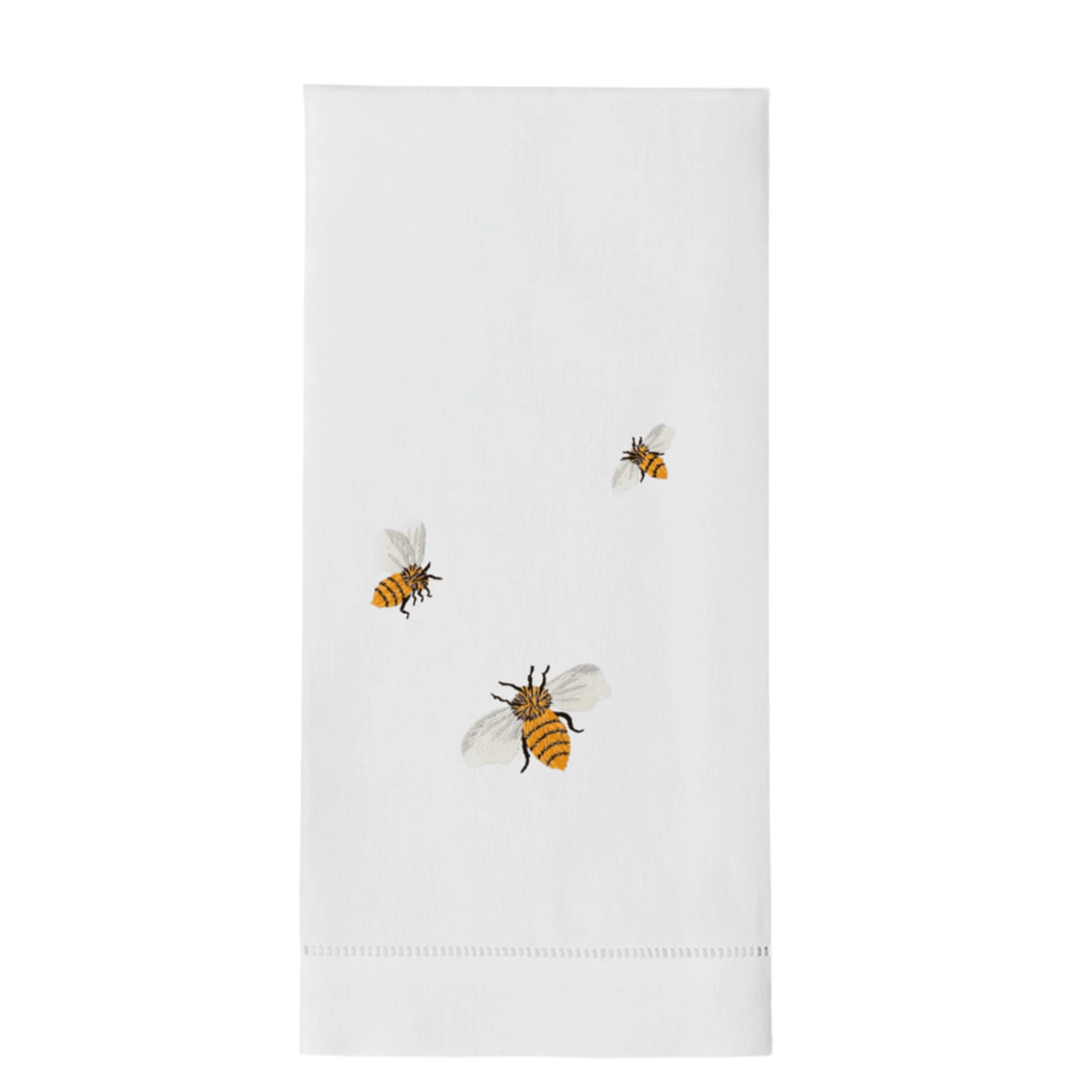 A band of three intricately and realistically embroidered bees is looking for a place to land. Meanwhile, they're delicately and artfully arranged on a ground of white cotton. Hand embroidered towel on 100% cotton, finished and hemstitched by hand. Please note this item is sold as a set of two. Click on images for greater detail.