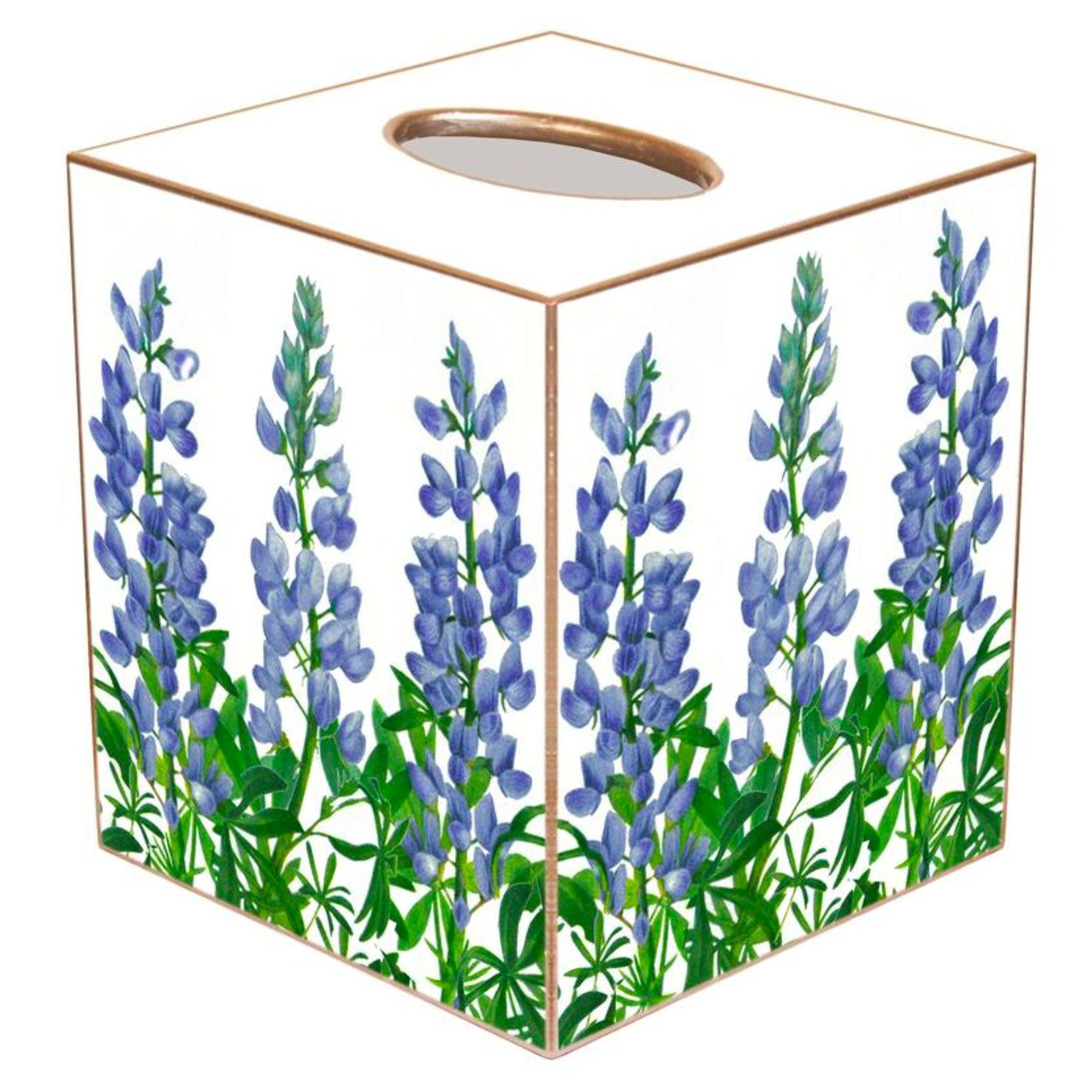 This is a handmade decoupage tissue box cover featuring blue bonnet flowers.