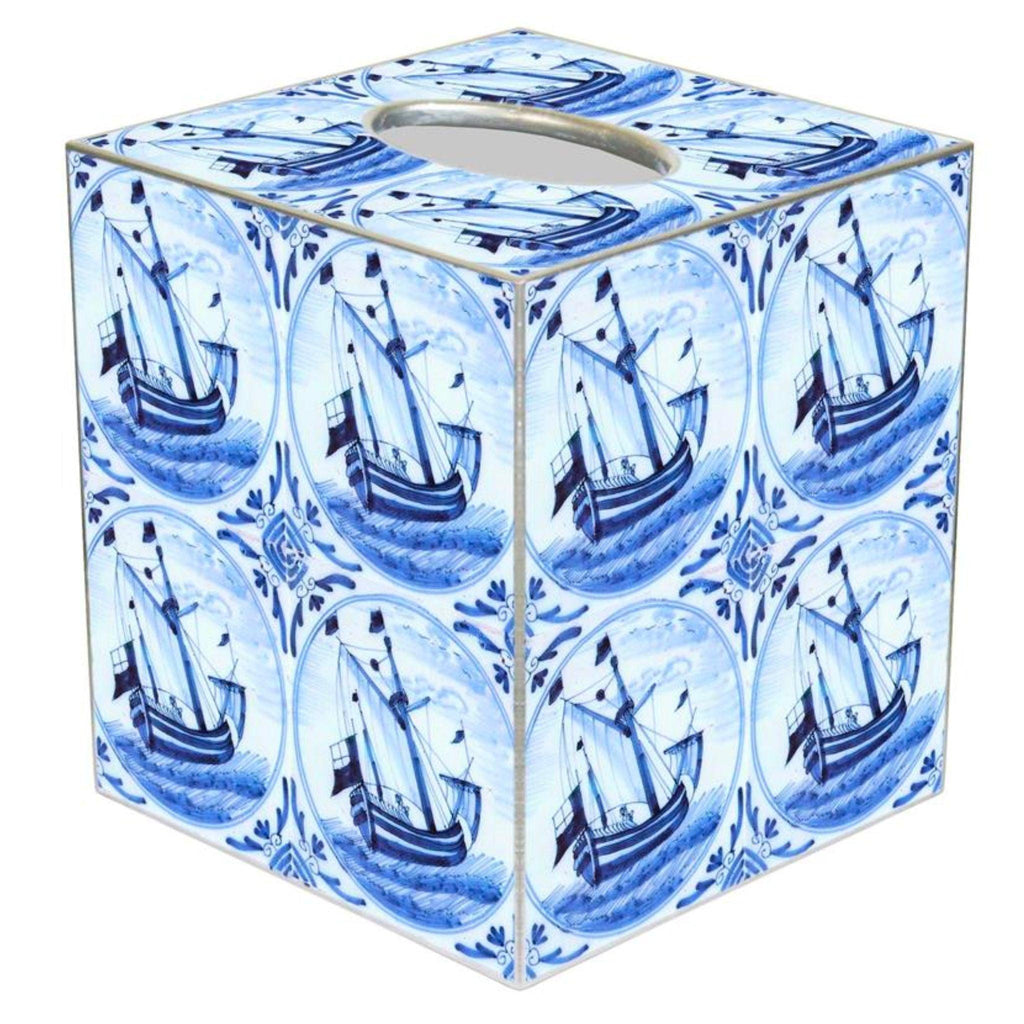 This is a handmade decoupage tissue box cover featuring blue sailboats.