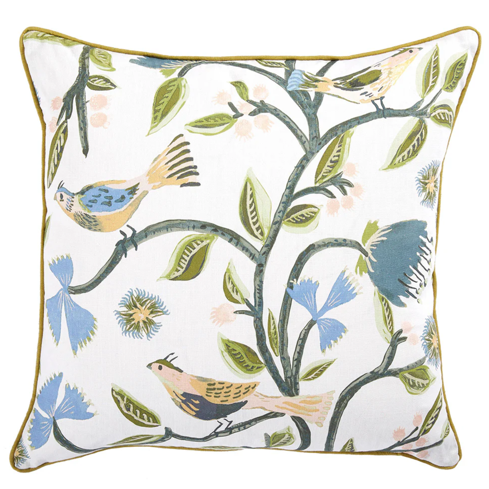 The Bird of Eden decorative throw pillow features a floral design with birds and a cilantro green piped edge.