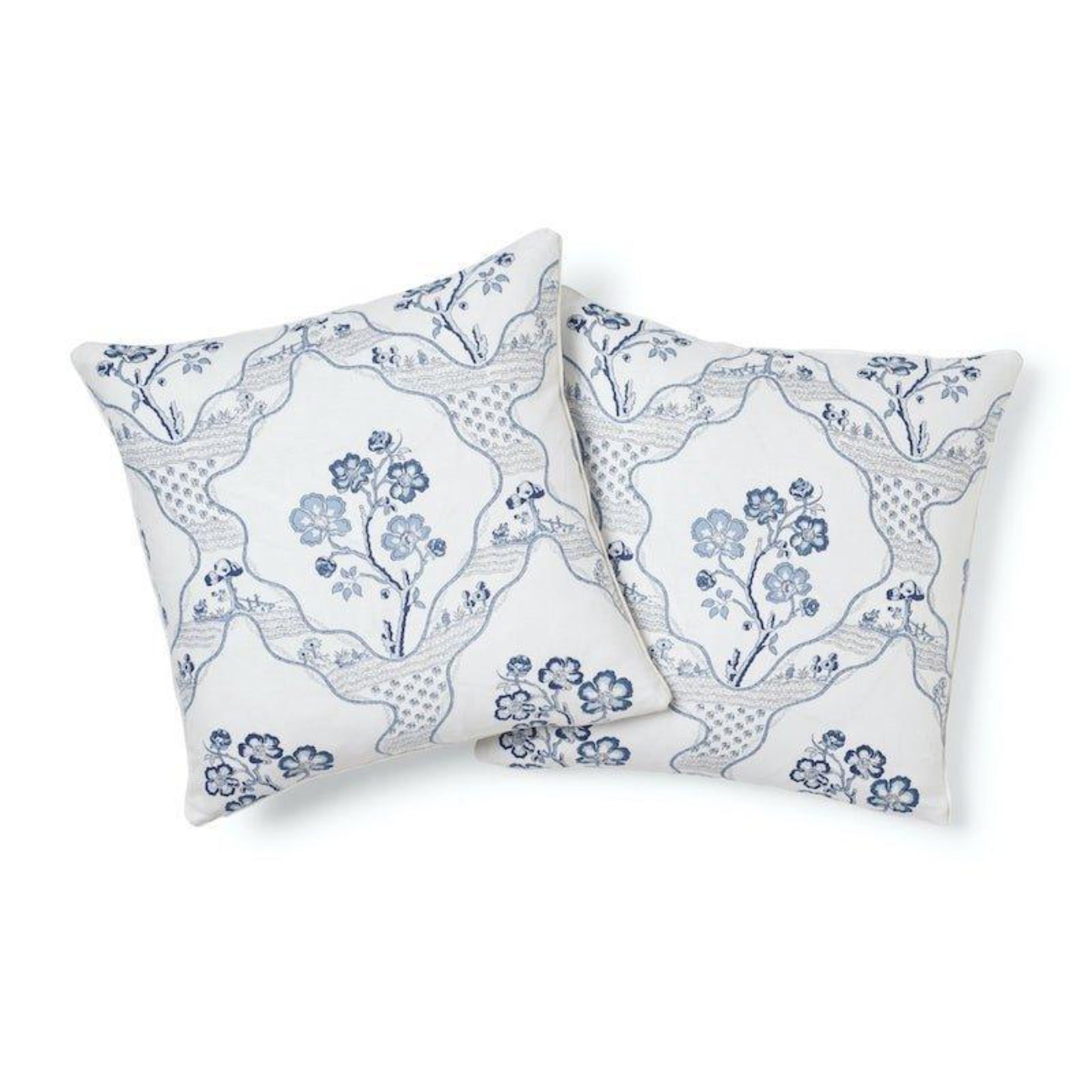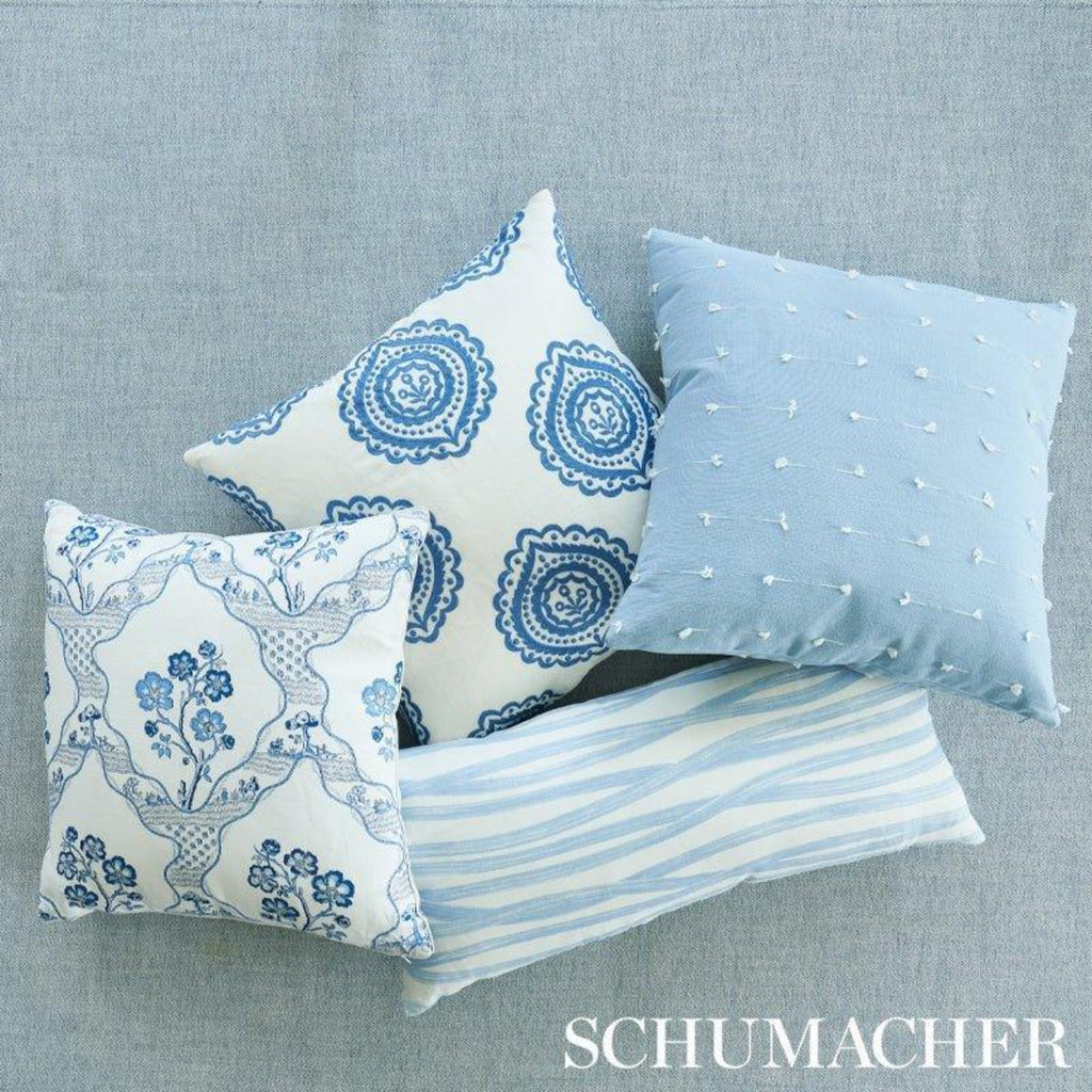 This blue and white pillow features Marella by Vogue Living for Schumacher. An eccentric, wavy trellis pattern, Marella is enlivened by charming botanical motifs.