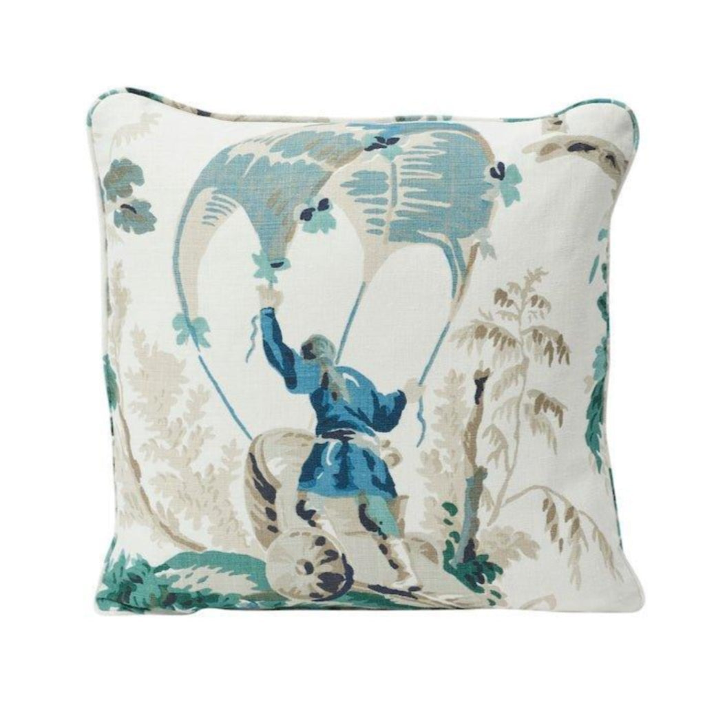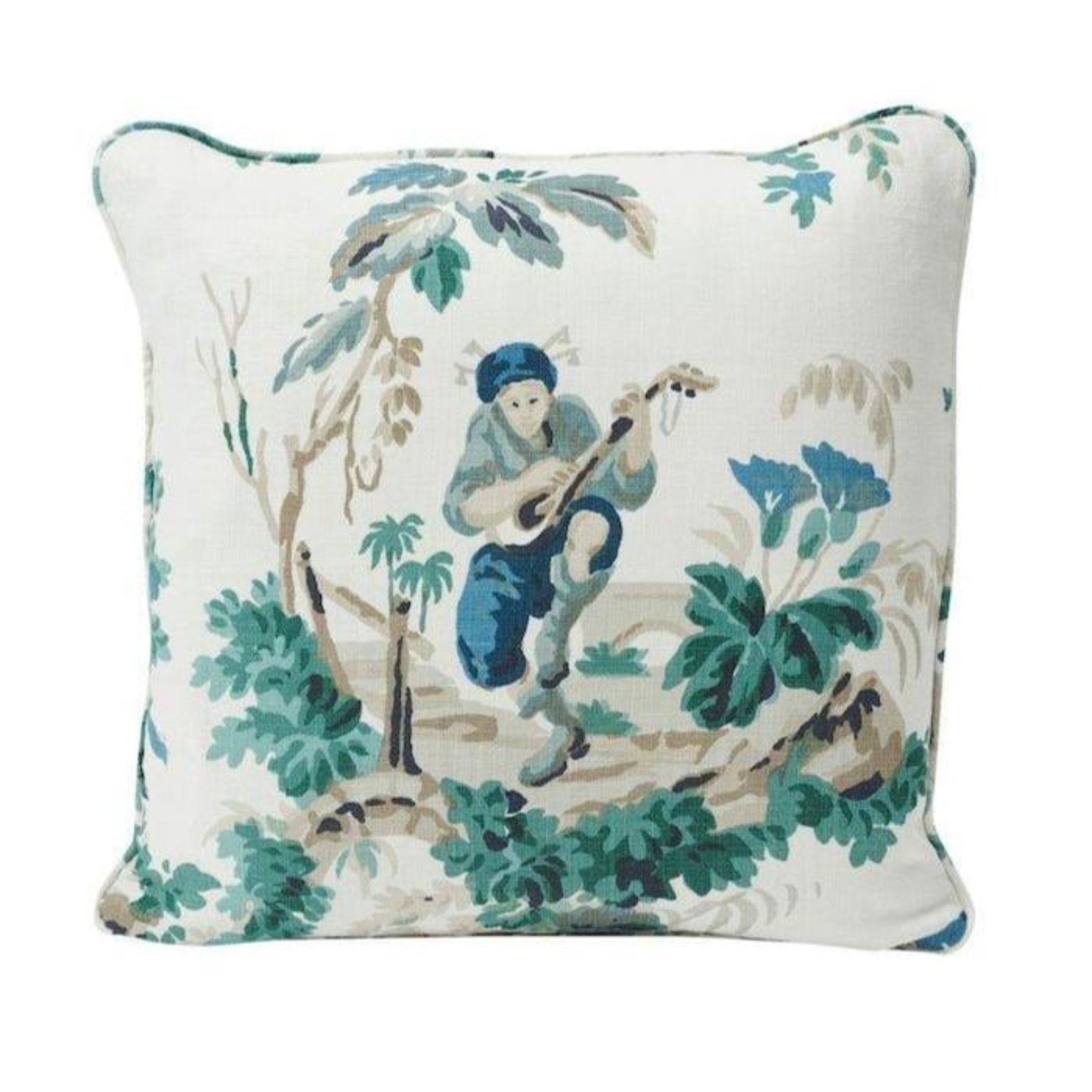 This pillow features Schumacher Plaisirs de la Chine with a Self-Welt finish. Thanks to an artisanal table print technique, this fanciful, large-scale pastoral-based on a 1930s document-has a layered, painterly look.
