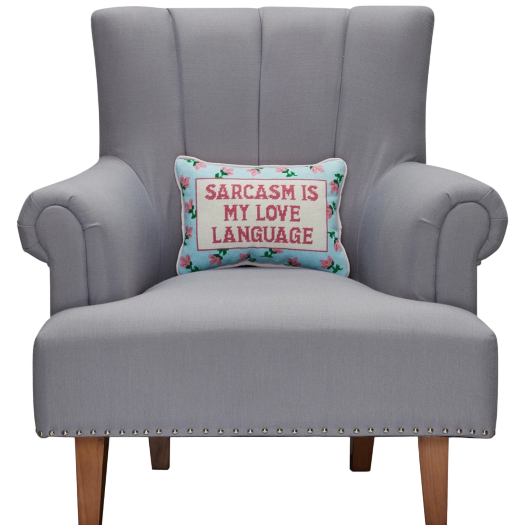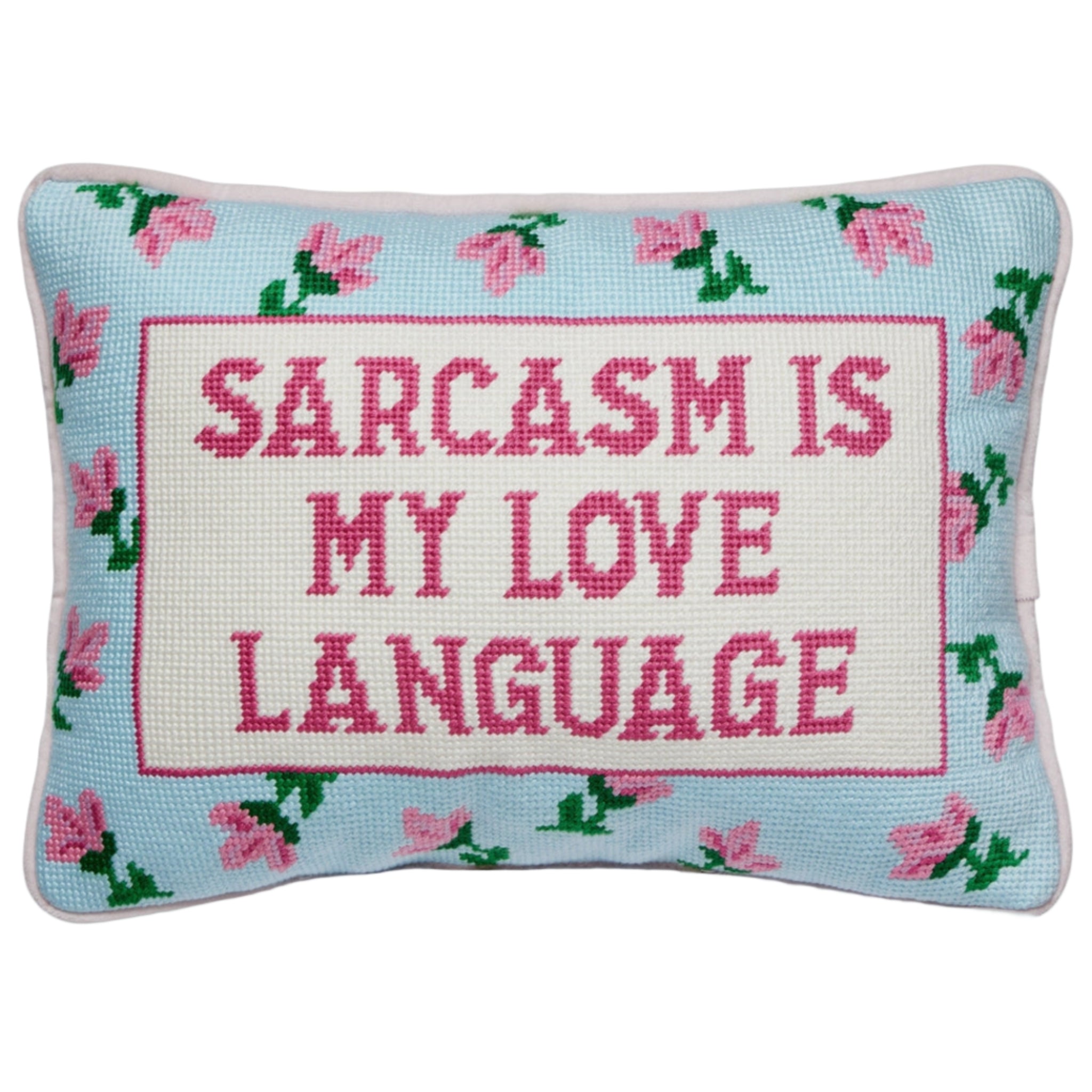 Add a dash of humor and charm to your space with this beautifully detailed embroidered pillow. Featuring the cheeky phrase “Sarcasm’s My Love Language” surrounded by delicate pink floral accents, it perfectly blends wit with elegance. This pillow brings both comfort and personality to your sofa, chair, or bedroom décor.