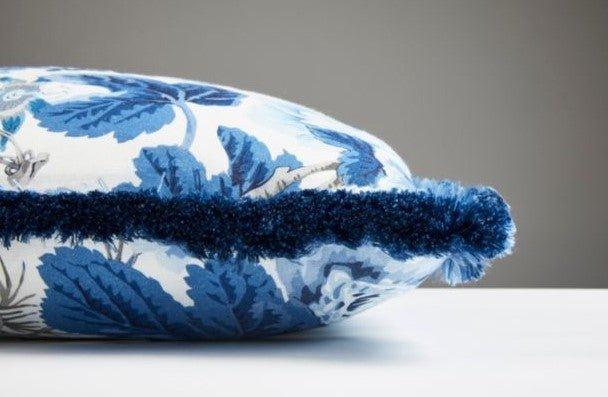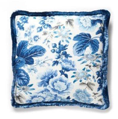 This blue and white 100% linen decorative throw pillow was thoughtfully curated and sewn together using the finest Scalamandre fabric and trim with care in the USA.The beautiful blue floral design and lush fringe featured on this pillow, make it a must have! This pillow has a hidden zipper and luxurious feather down insert. This decorative pillow measures 22" x 22" and is dry clean only. This item is custom made to order and may not be returned. Click images for greater details.