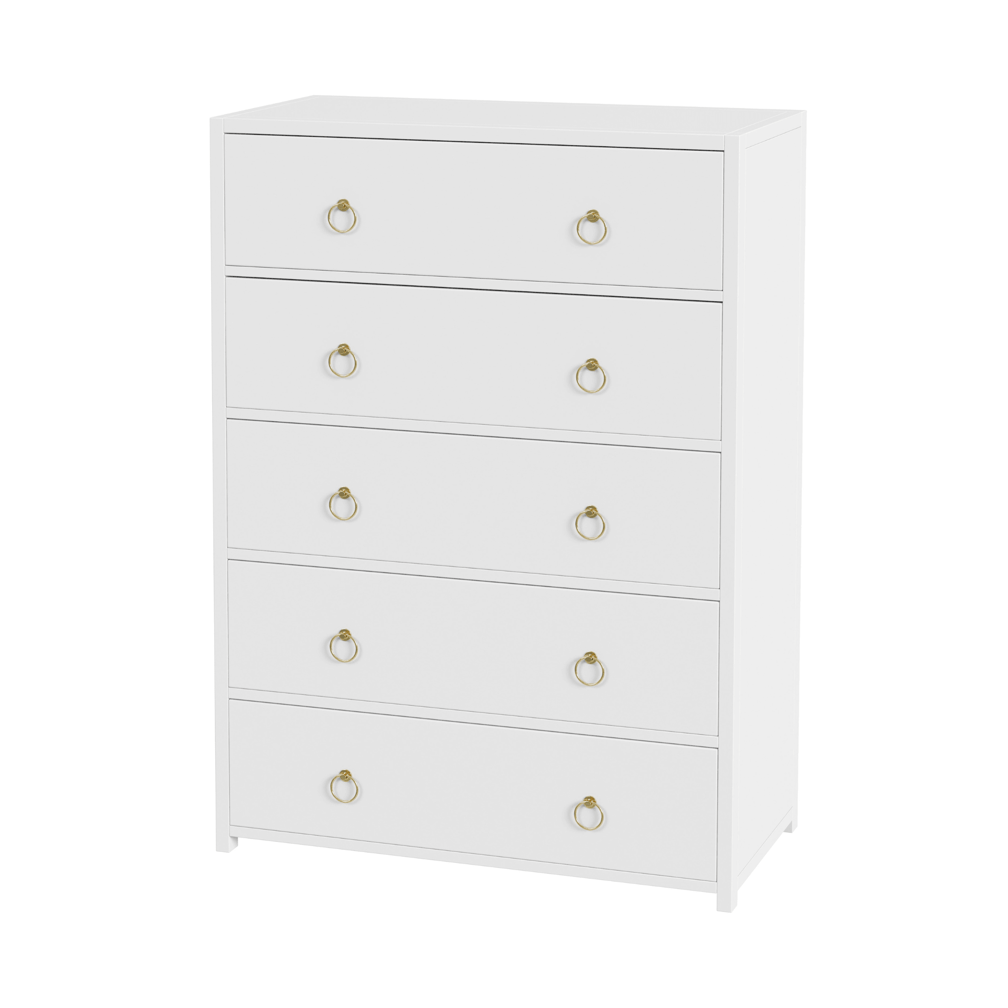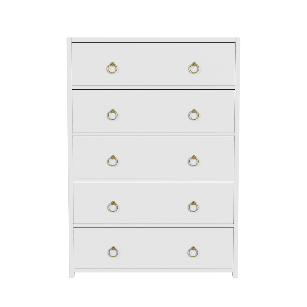 Crafted from Acacia wood and engineered wood, this five drawer dresser features gold ring pulls, ball bearing glides, tongue and groove joinery. The contemporary design of this dresser makes it a great choice for your bedroom or guestroom. Some assembly required. Click images for greater detail.