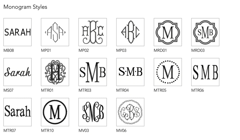 *Monograms will match trim color and have standard placement unless otherwise requested. Please enter your monogram how you would like it to read/appear (from left to right). Please make any special requests in the notes section below.*