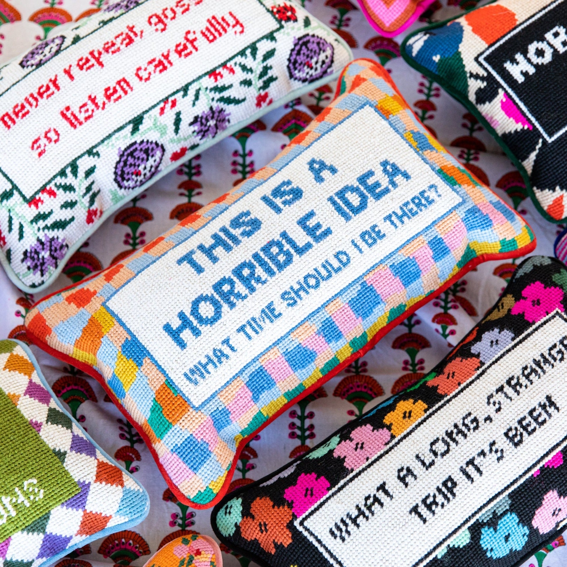 - Each of our needlepoint pillows take approximately 20 hours to hand stitch creating a very unique and special accessory for your home. They are guaranteed to spark joy and make the perfect gift!