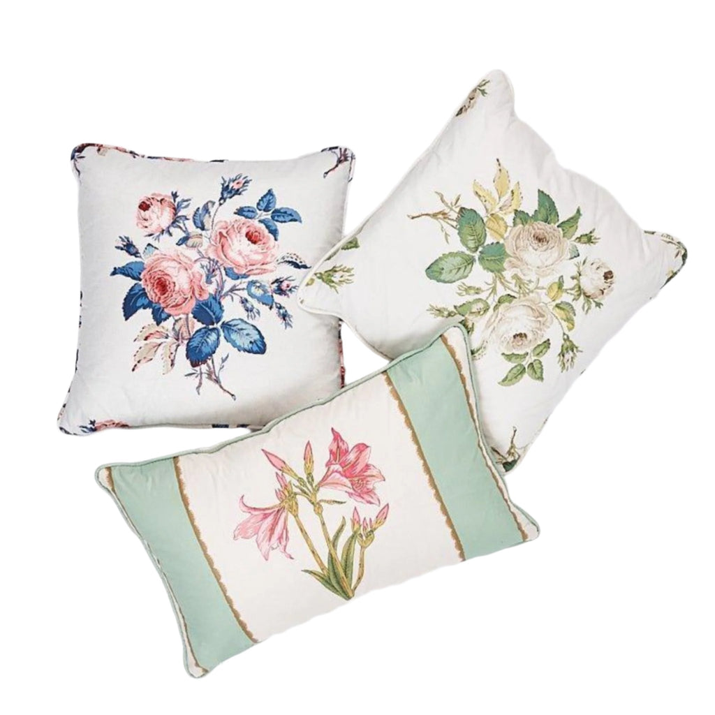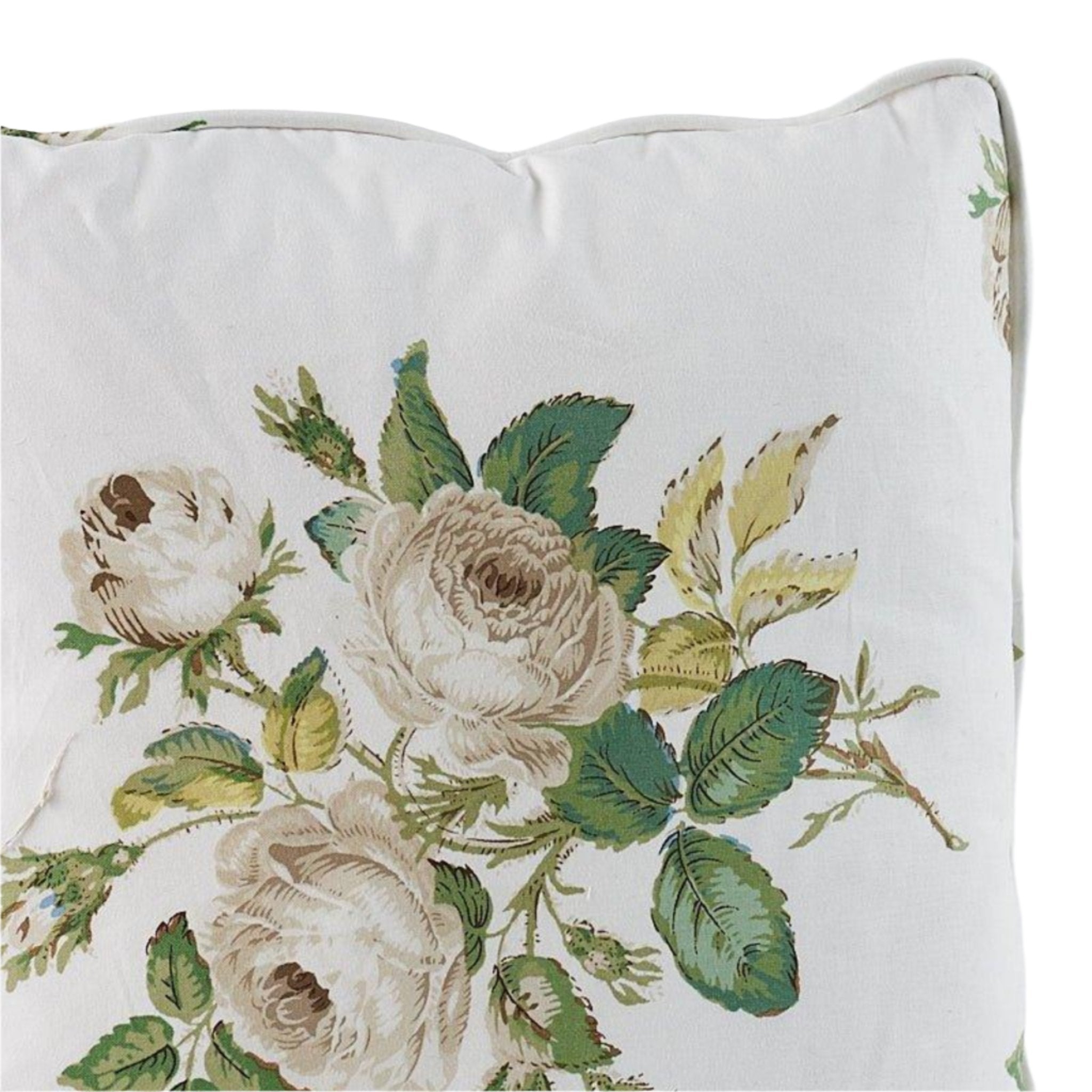 This Schumacher pillow features Loudon Rose with a self-welt finish. A romantic, painterly quality infuses this rose bouquet with an unmistakably feminine beauty. The blooms are wonderfully detailed, yet the petals and leaves display a lovely looseness.