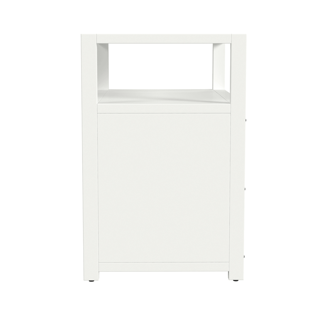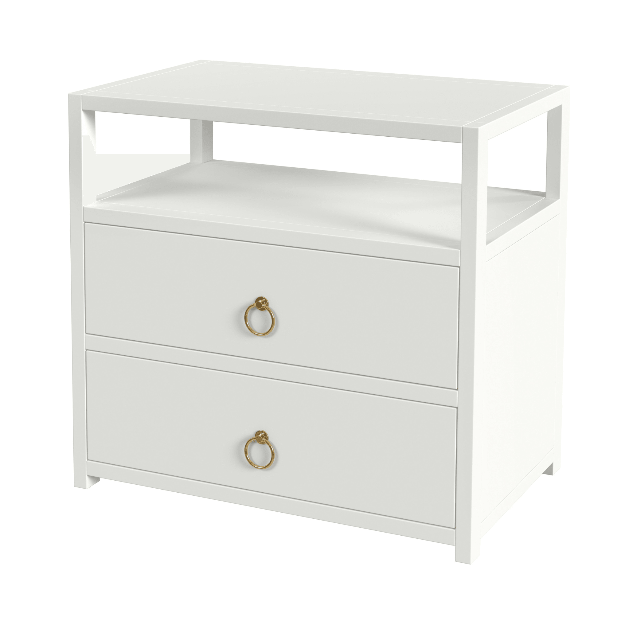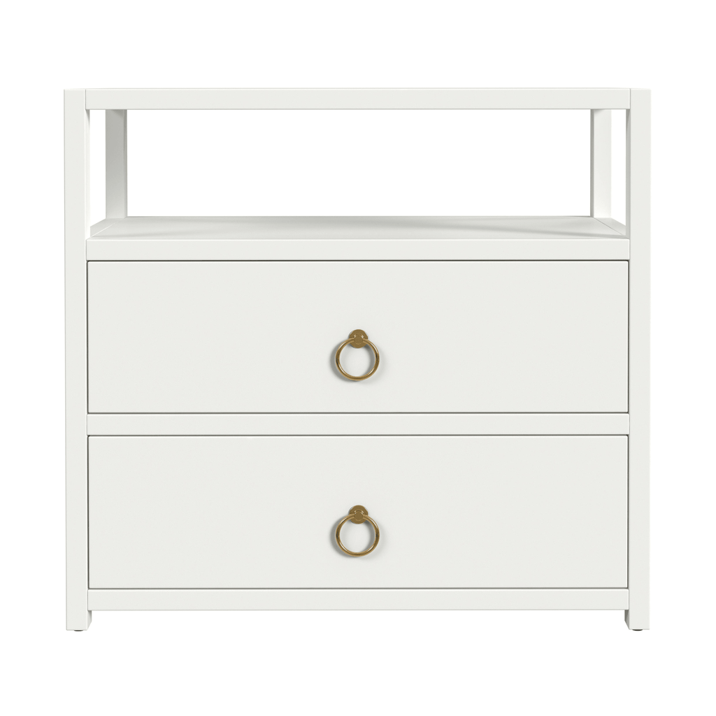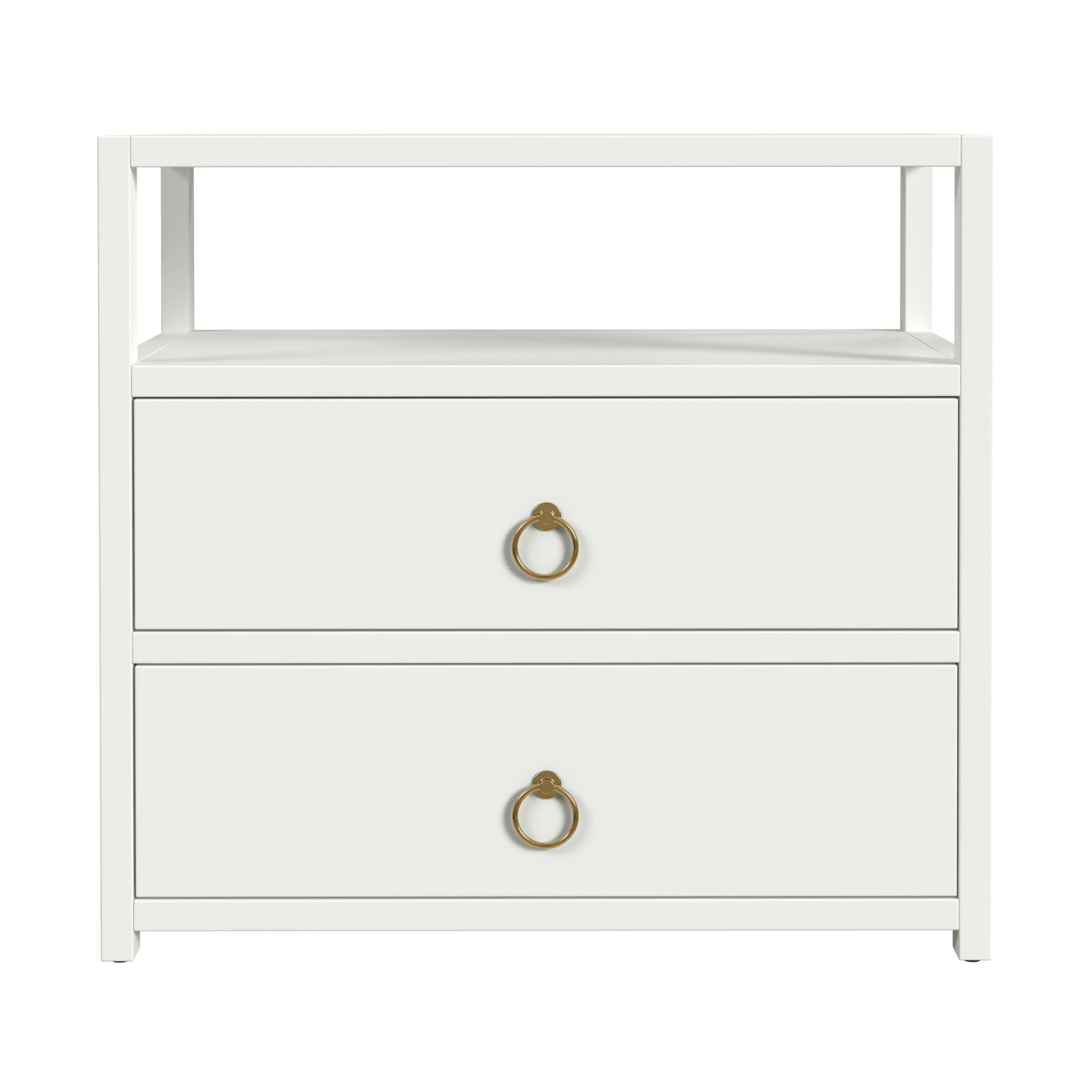 Crafted from Acacia wood and pine wood solids this two drawer nightstand features gold ring pulls, ball bearing glides, tongue and groove joinery. The minimalist design of this oversized nightstand makes it a great choice for contemporary spaces. Just below the top is an open shelf to keep essentials within reach. Some assembly required. Click images for greater detail.