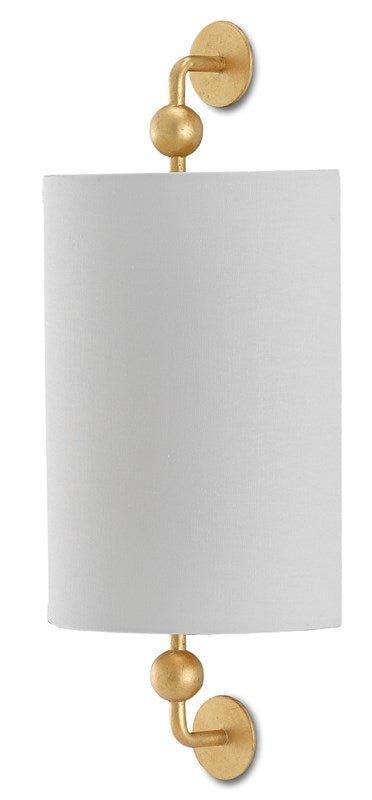 Tiny globes ornament the arms that affix the off-white linen shade to this gold wall sconce. Made of wrought iron in a contemporary gold leaf finish, the stylish gold sconce meets ADA requirements.