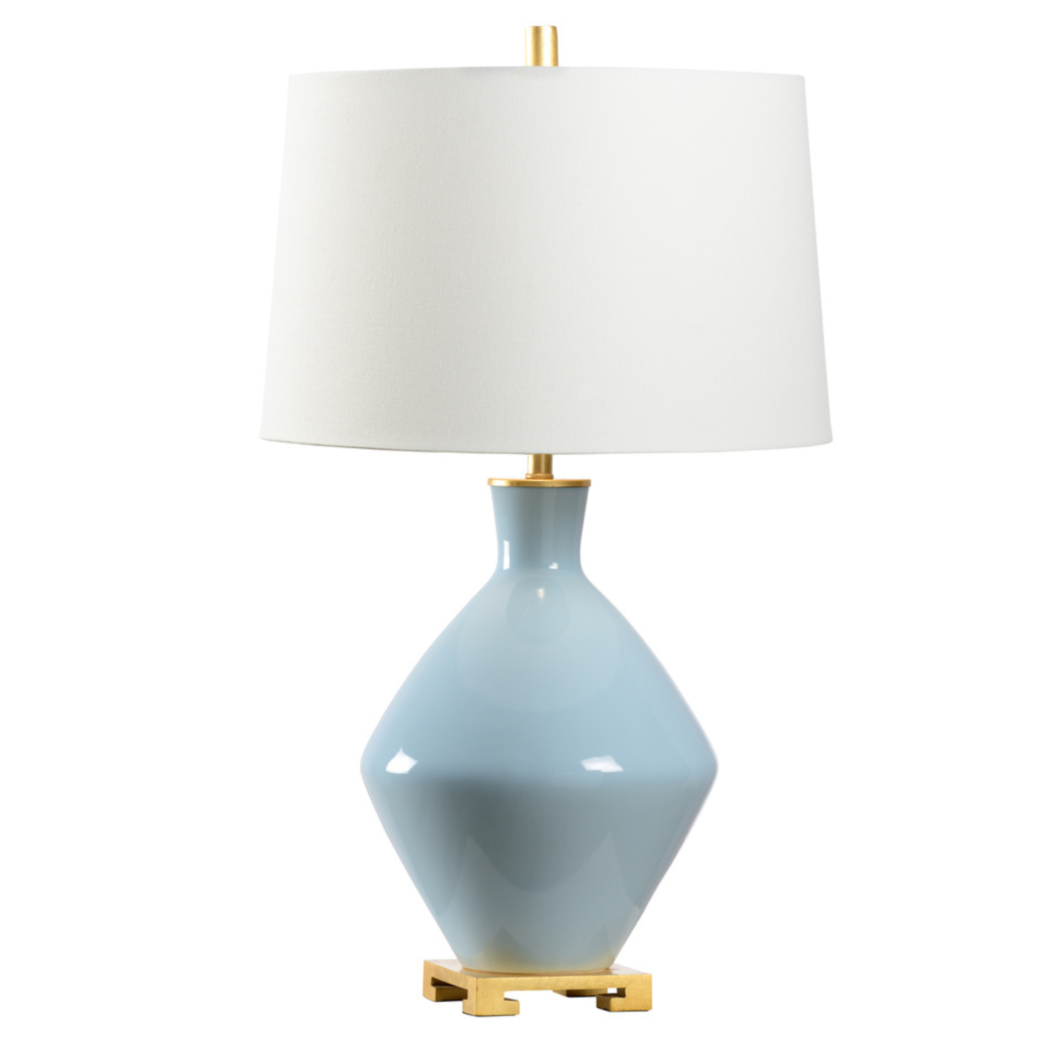 Introducing the Skylar Ceramic Lamp in Sky Blue. This lamp boasts a stunning sky blue glaze on its ceramic base, elevating any space with its charming color. The antique gold leaf mounting adds a touch of luxury, making it the perfect addition to your sophisticated home decor.