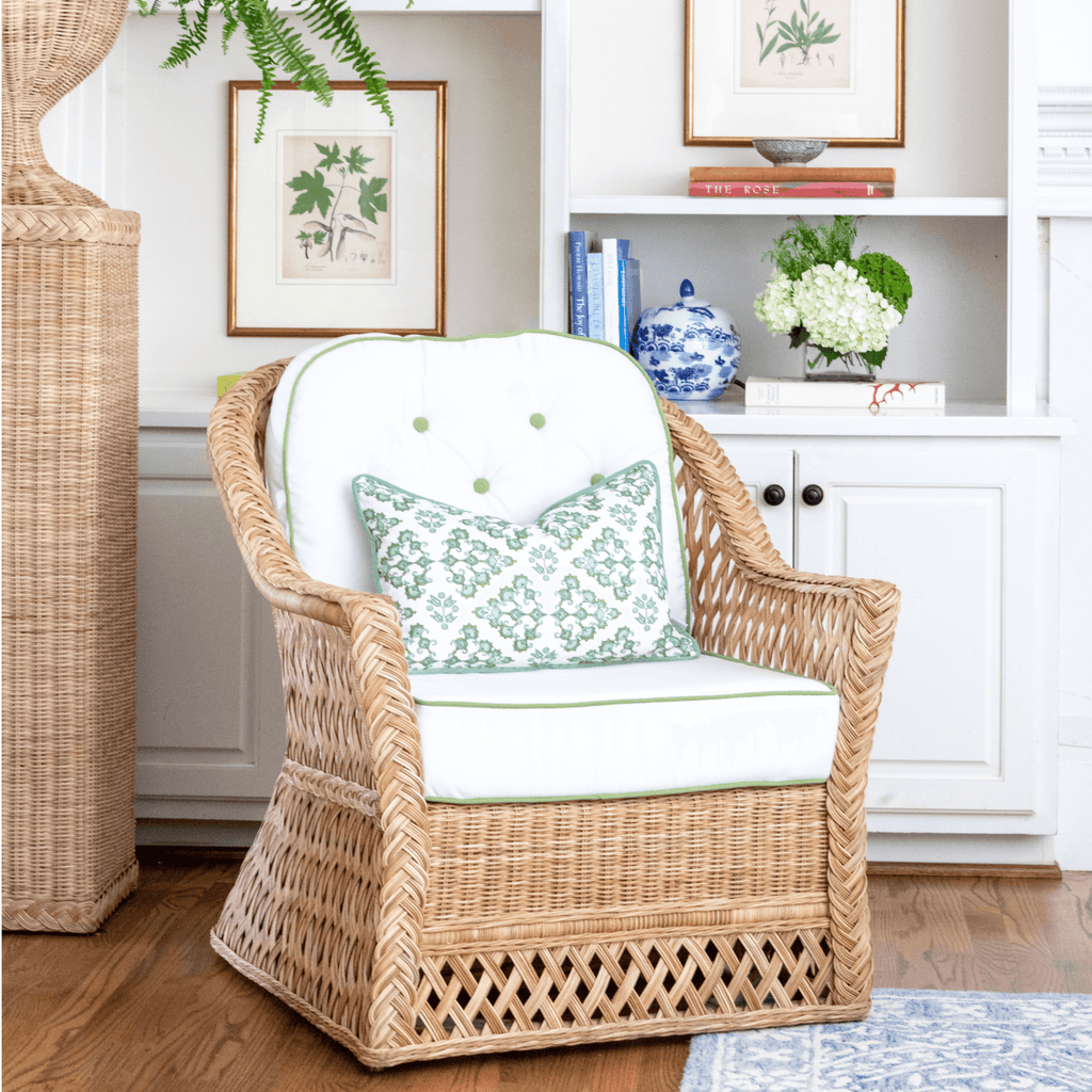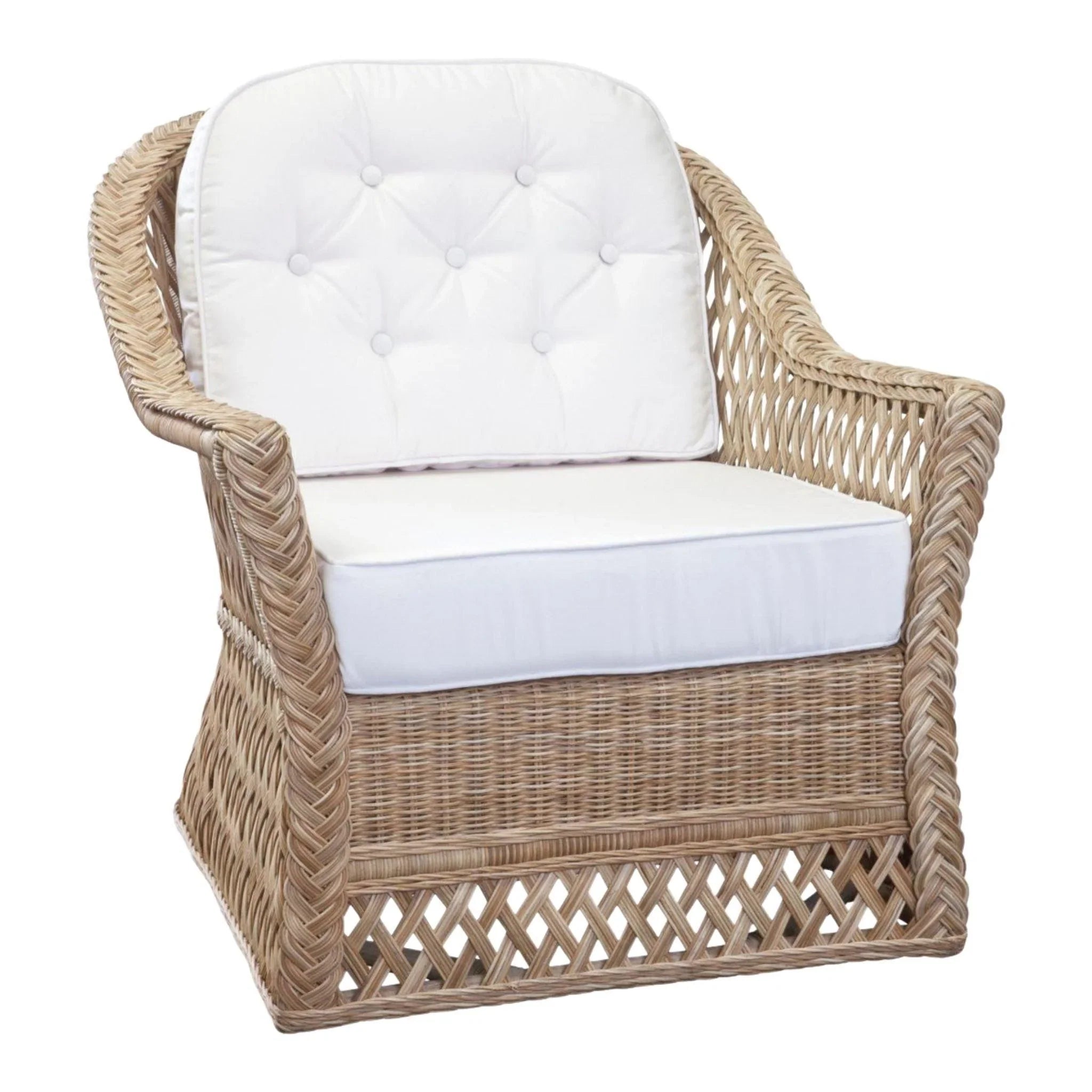 This trellis-aproned lounge chair is a wonderful and comfortable accent to your patio or home. The rattan piece comes from the Sarah Bartholomew Garden Collection.