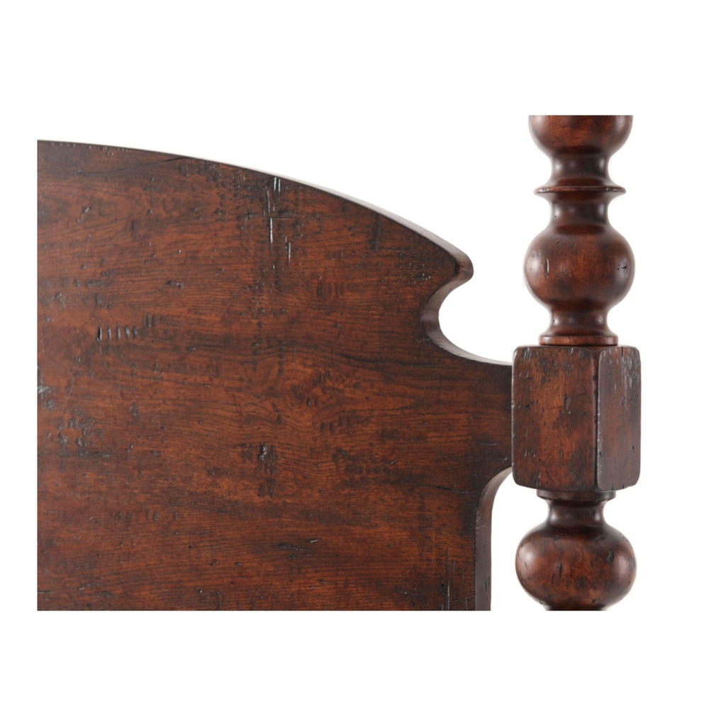 A reclaimed oak veneered and mahogany King bed, with an arched headboard and four turned columns on a paneled foot rail, on turned legs.