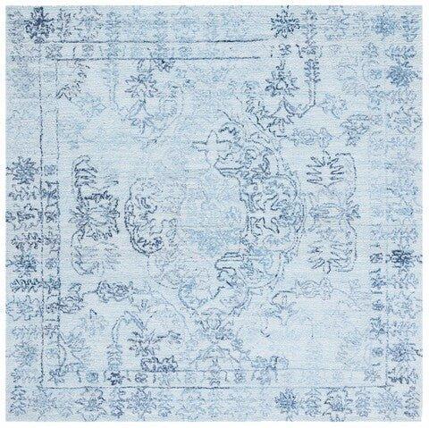 This hand tufted light blue and navy area rug features a faded classic design. This rug is made of 90% Recycled Polyester And 10% Wool with Latex backing and has a pile height of 12mm.
