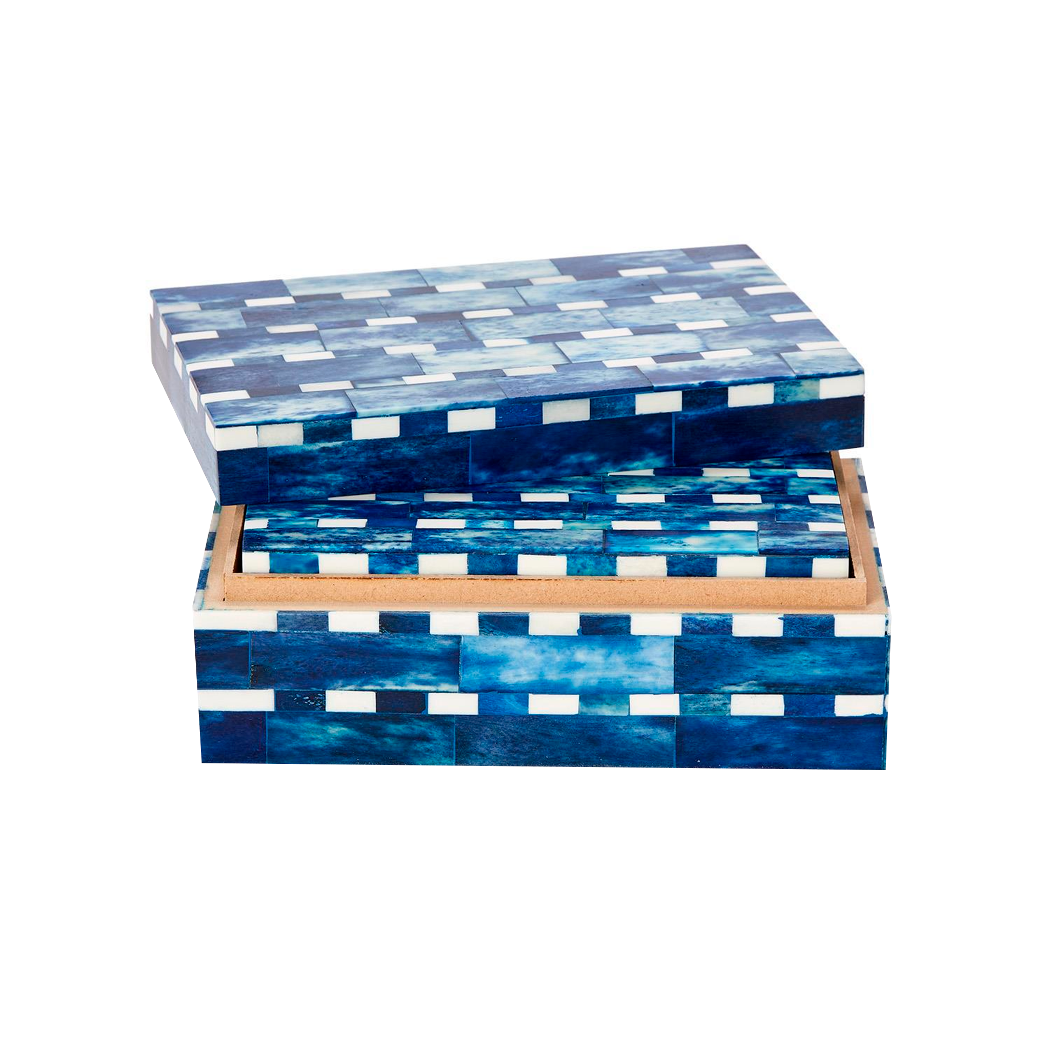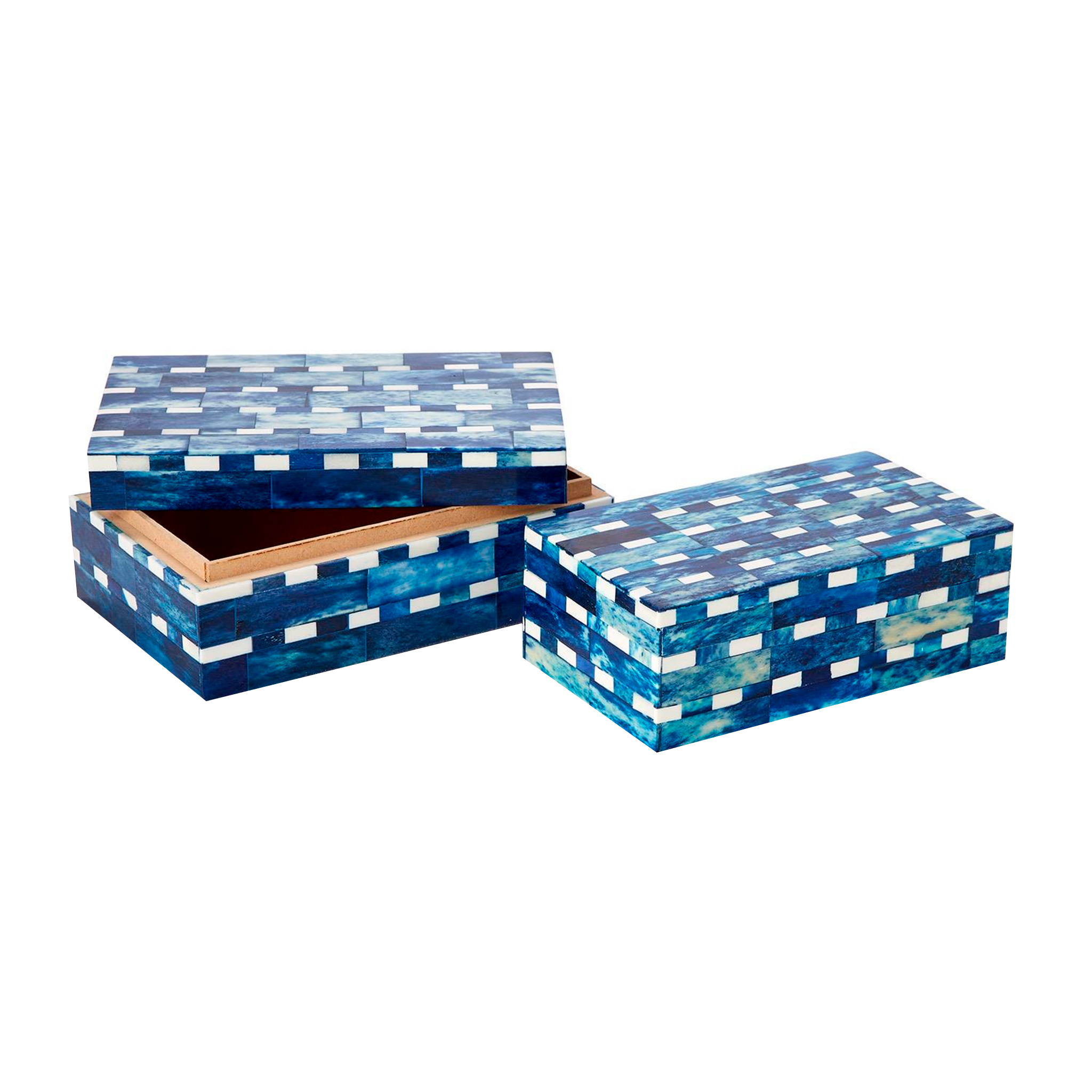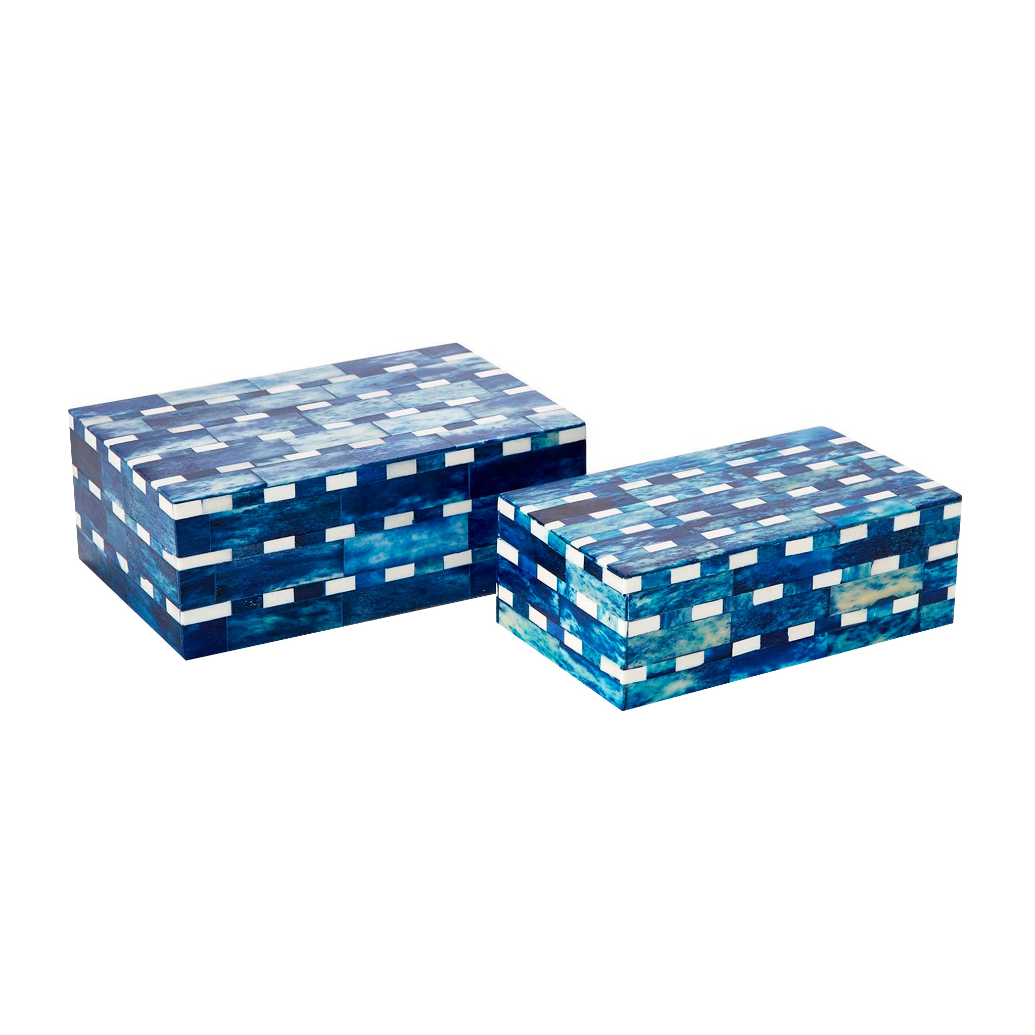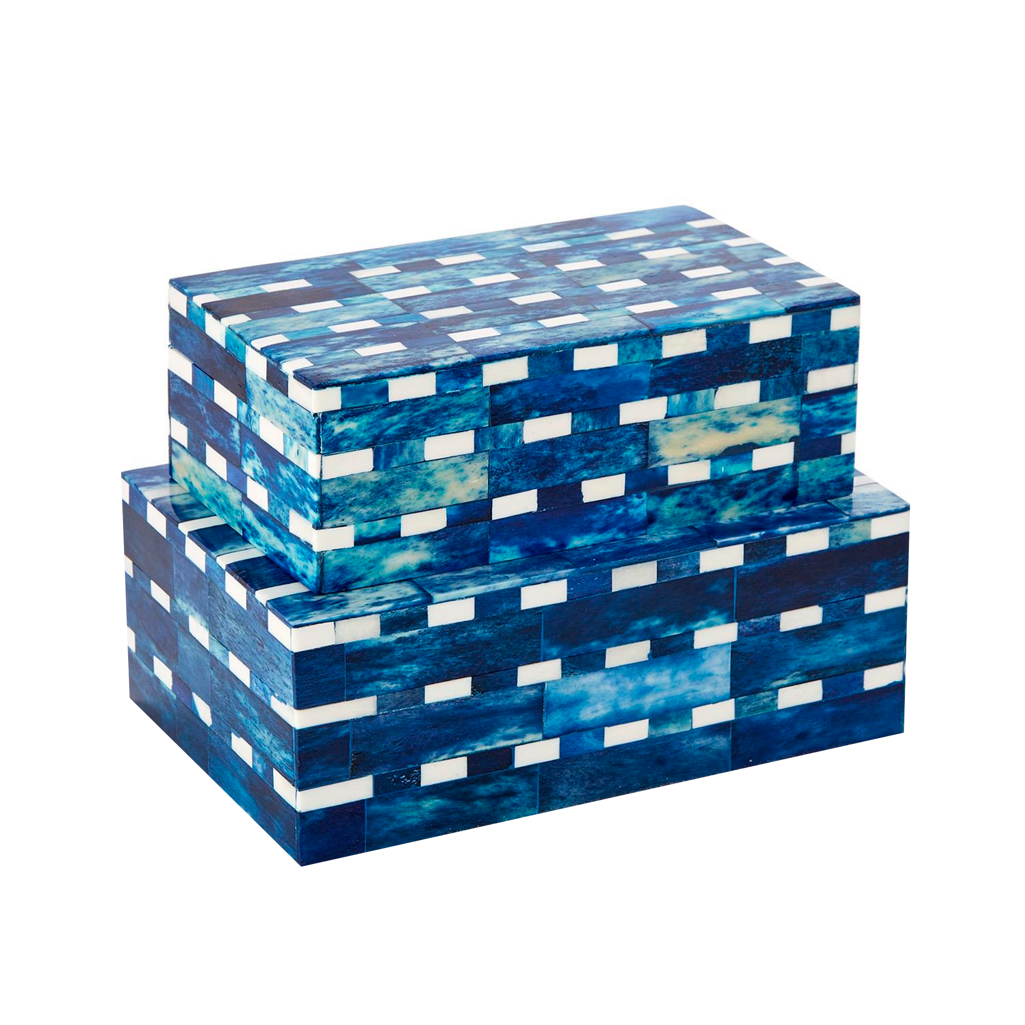 The Hope Bone Inlay Box – Indigo (Set of 2) features slender rectangular lidded boxes in rich indigo and crisp white hues. Crafted with bone-inlay over composite, these elegant storage pieces pair clean lines with decorative flair — ideal for freestanding or stacked display to keep keepsakes stylishly stowed.