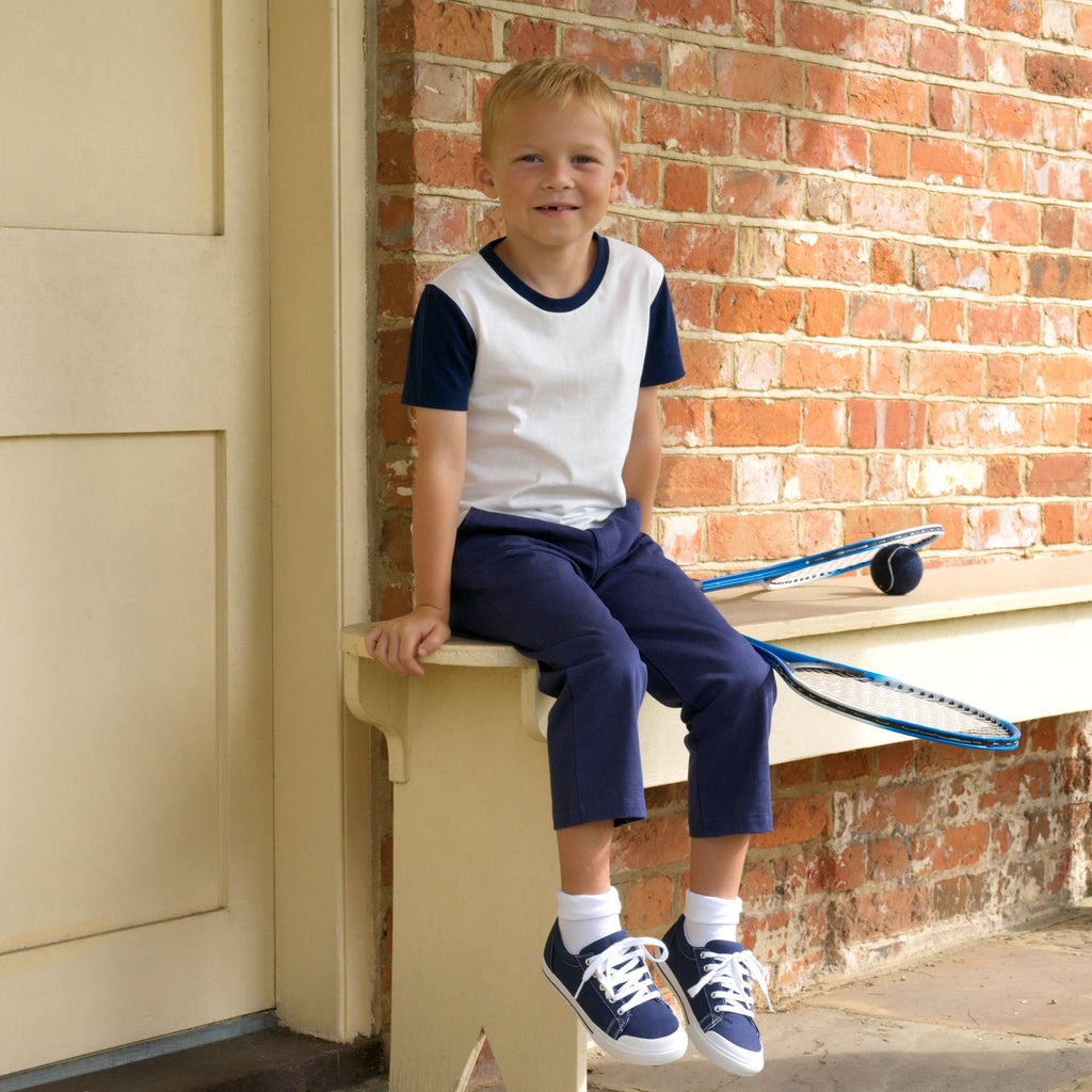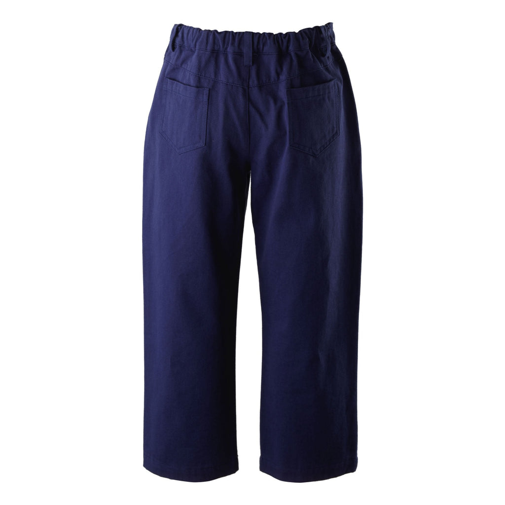 Tailored slim-fitting trousers in navy with side and back pockets, belt loops, zip fly and button closure.