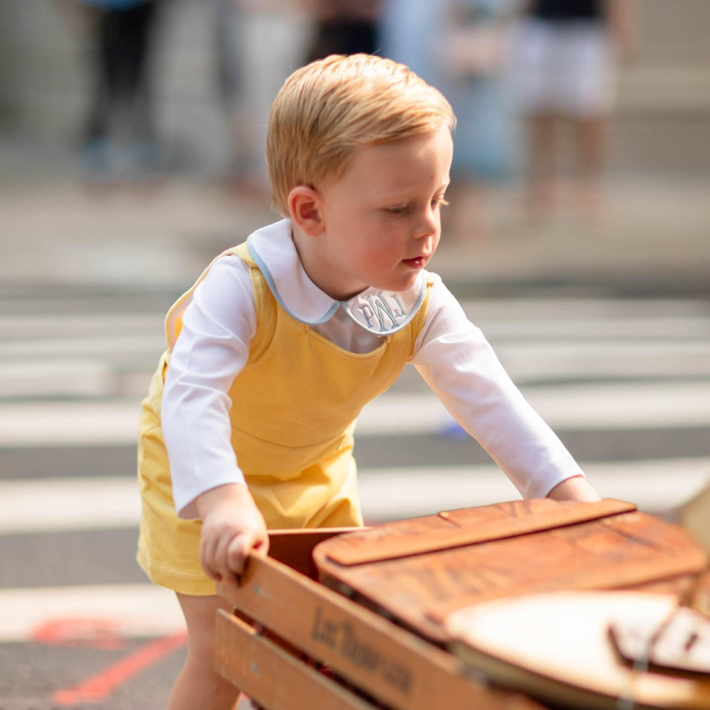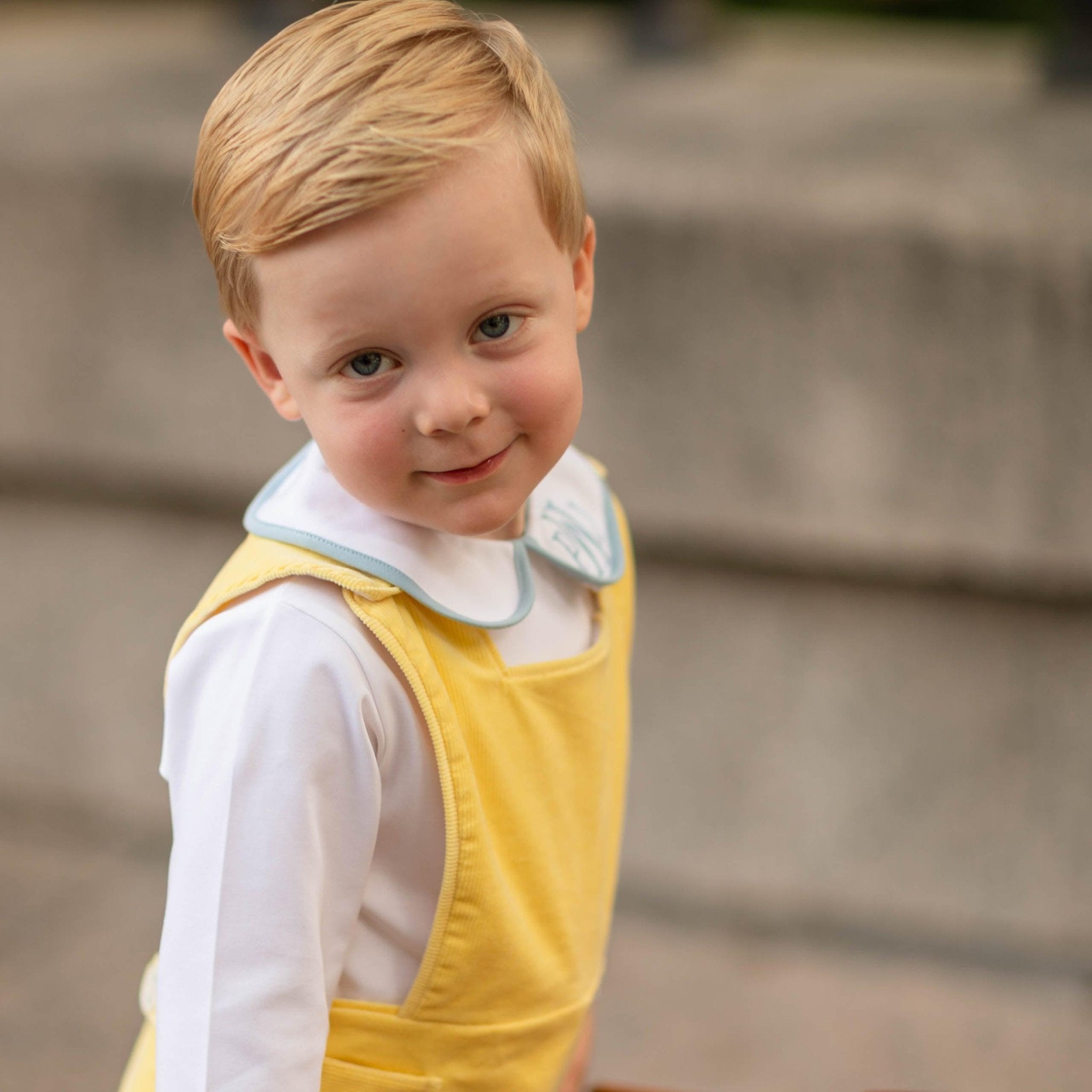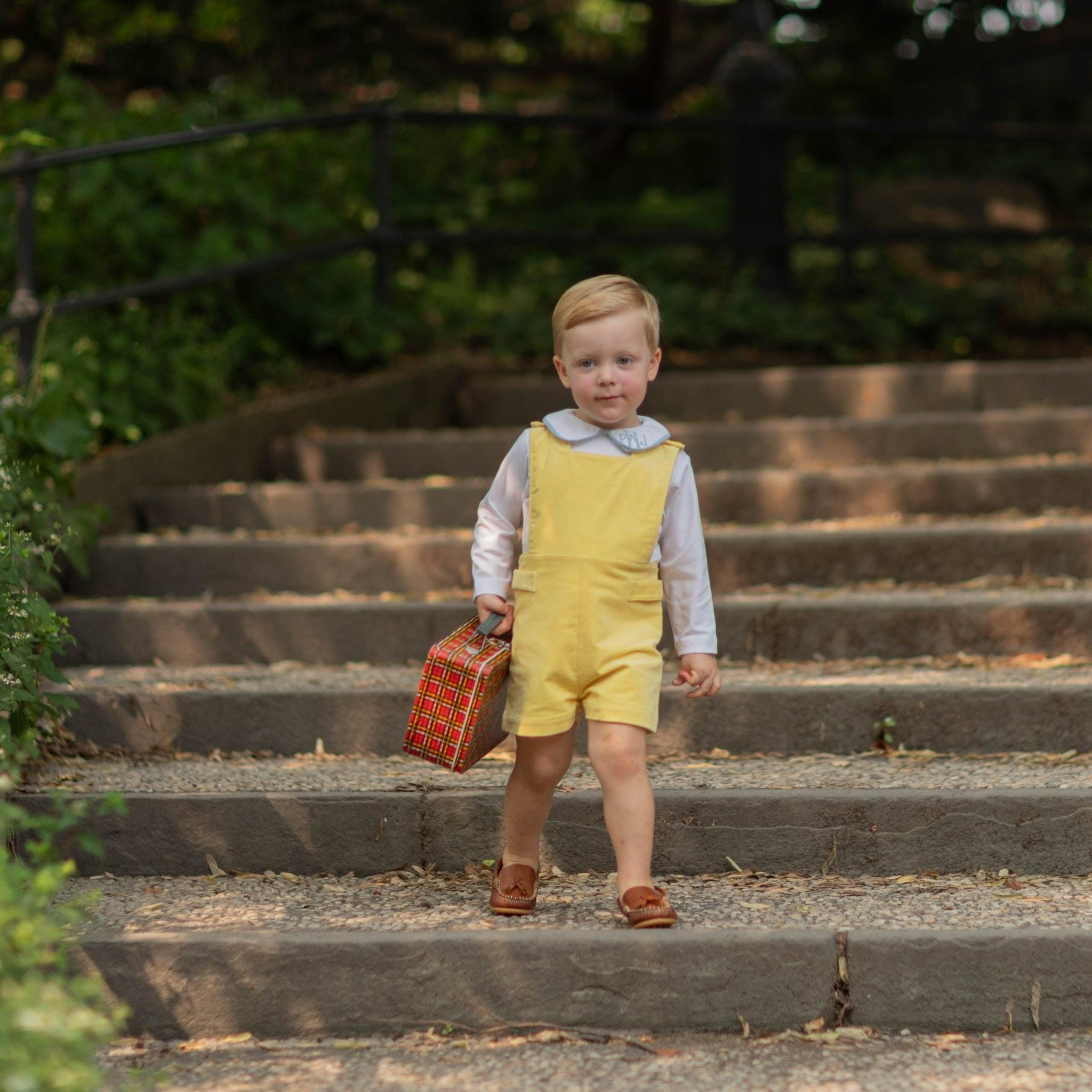 Our James Henry Jon Jon is classic and sweet and coordinates perfectly with all our brother shorts and pants. Featuring our large branded buttons at the shoulders and tabs, and snaps in the stride for easy diaper changes, pair it with a Teddy Peter Pan for the sweetest fall look for your toddler.