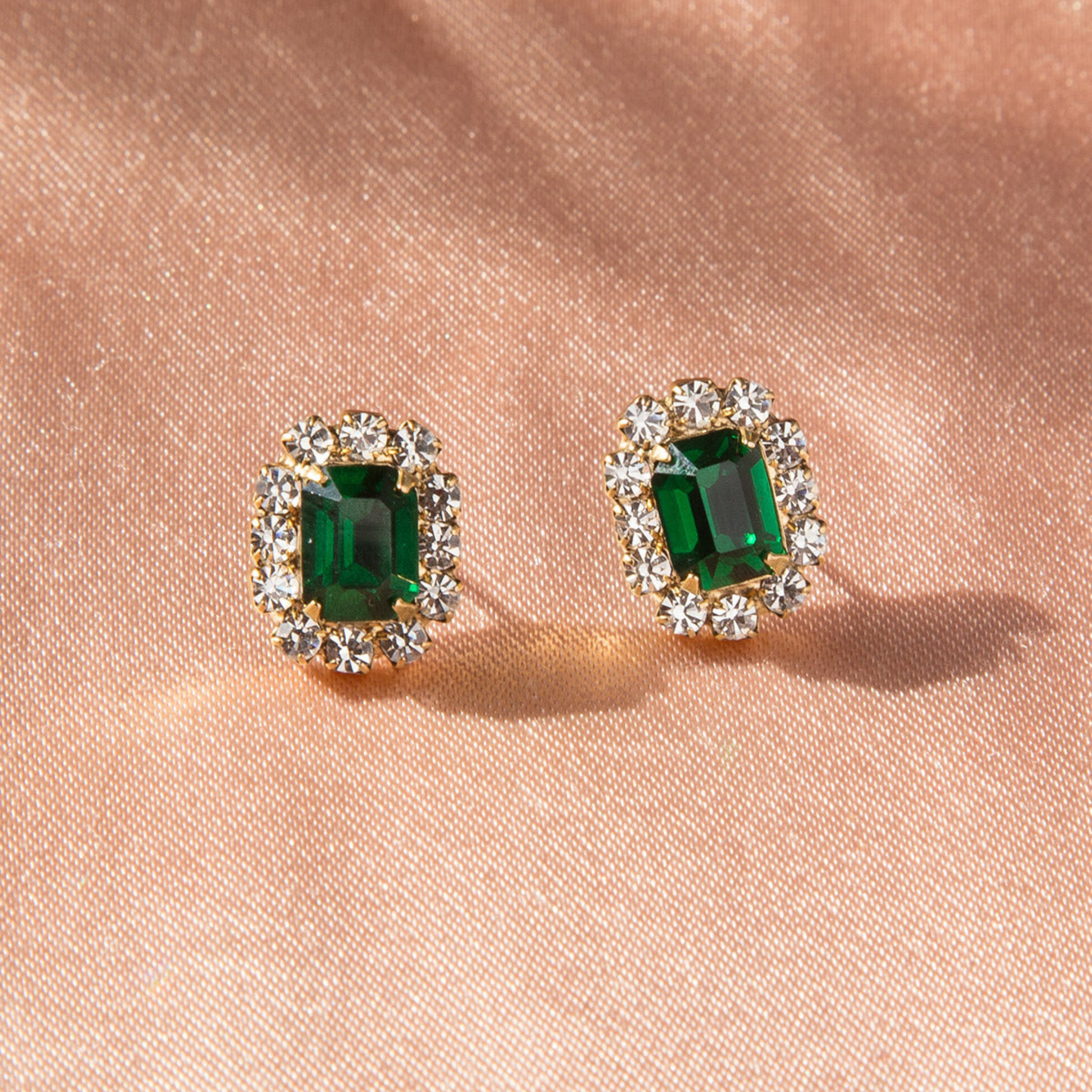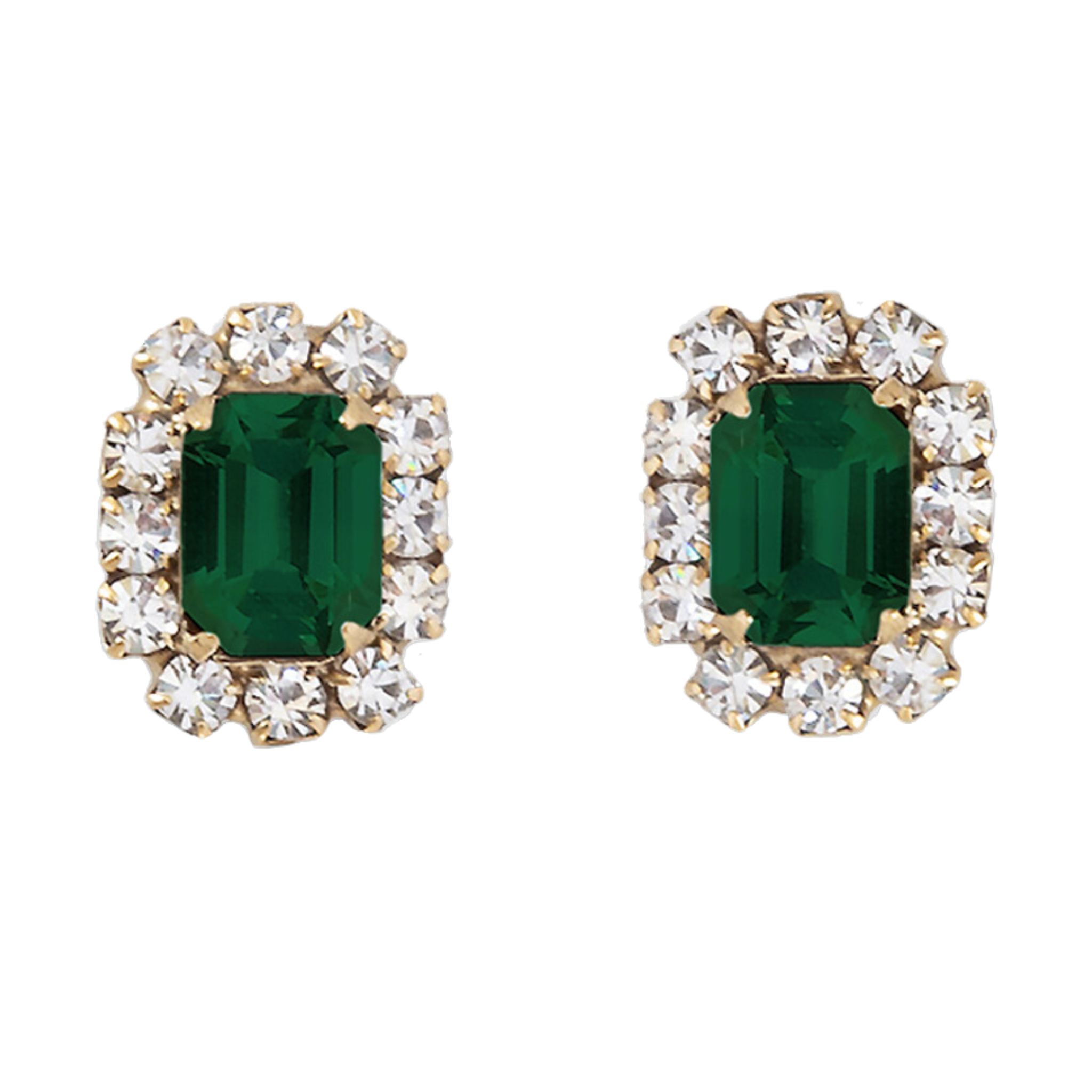 A little sparkle, a little shine, the Tati studs give elegance to any look. Features hand-set emerald crystals, an 18K antiqued gold finish and surgical steel posts. Also available as clip-on.