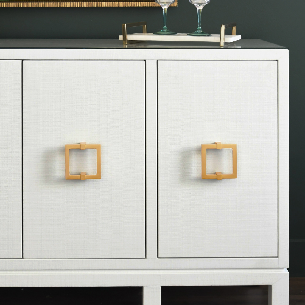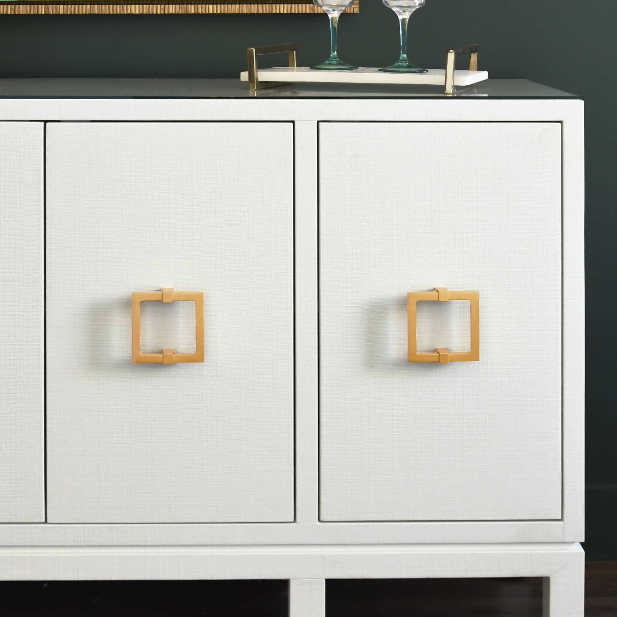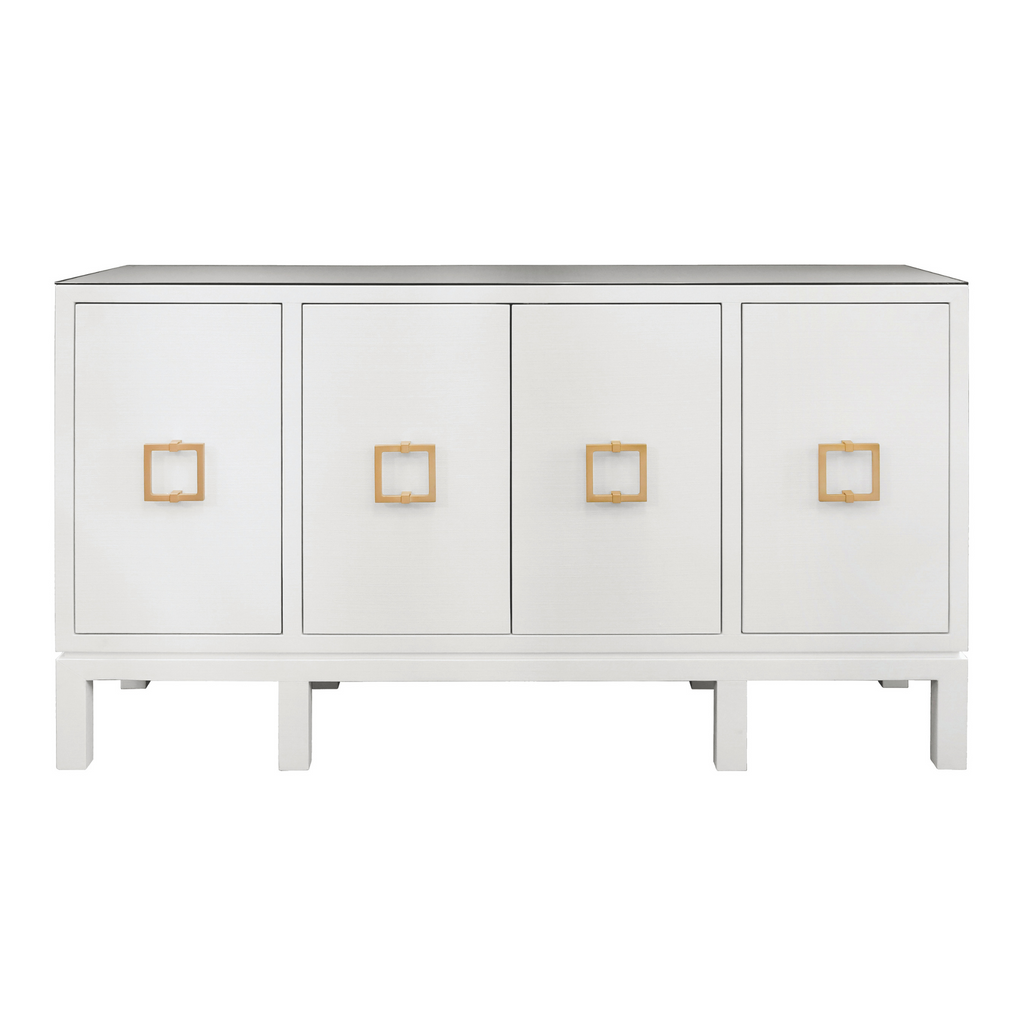 Looking for a versatile piece to liven up your home? You’ve found it! Our Effie is elegant, striking, and practical all in one. With ample storage space concealed behind each of its four doors, the Effie combines elegance with functionality. The buffet is adorned with four square brass handles that open to reveal three adjustable and removable shelves, one in center and two on sides, and a protective glass top.