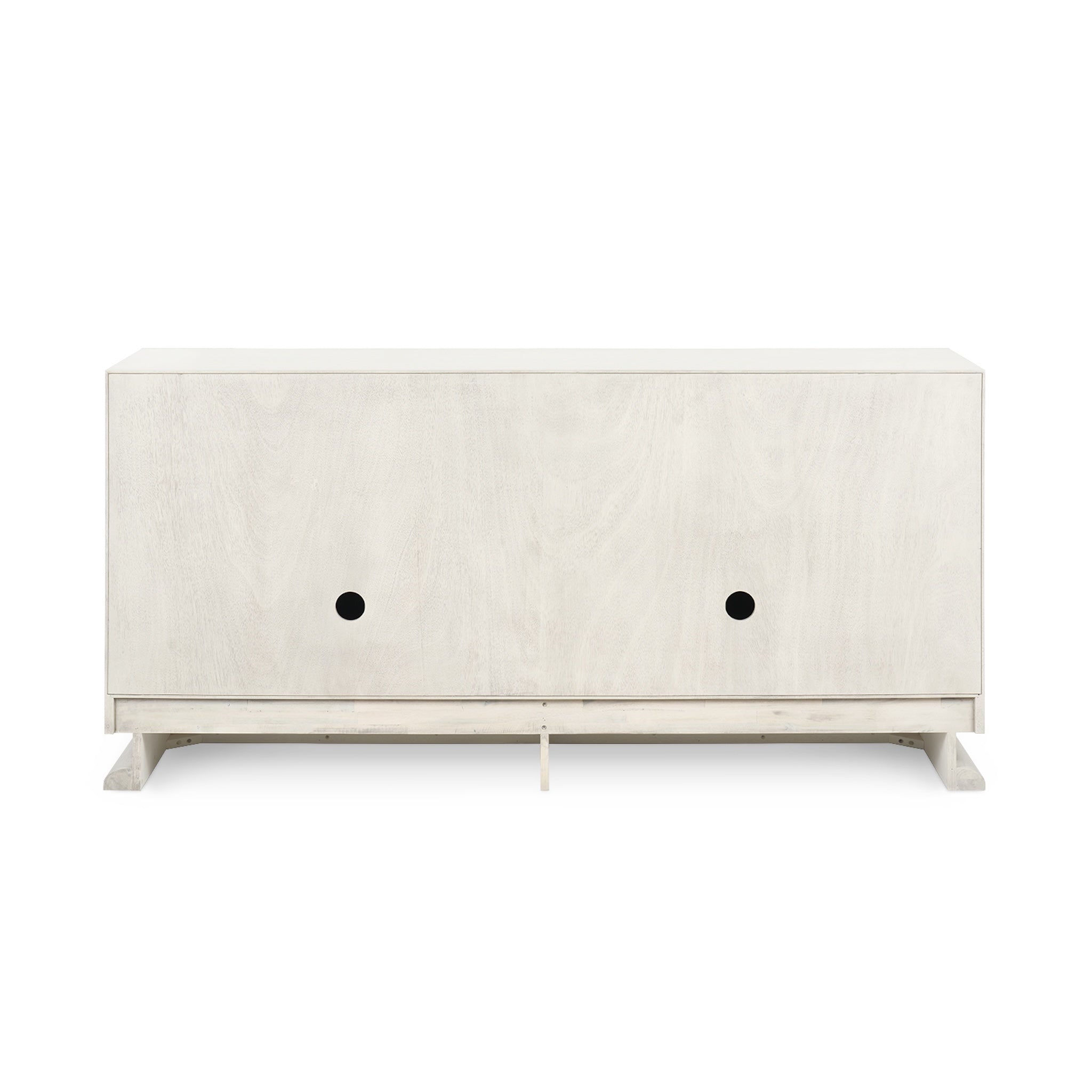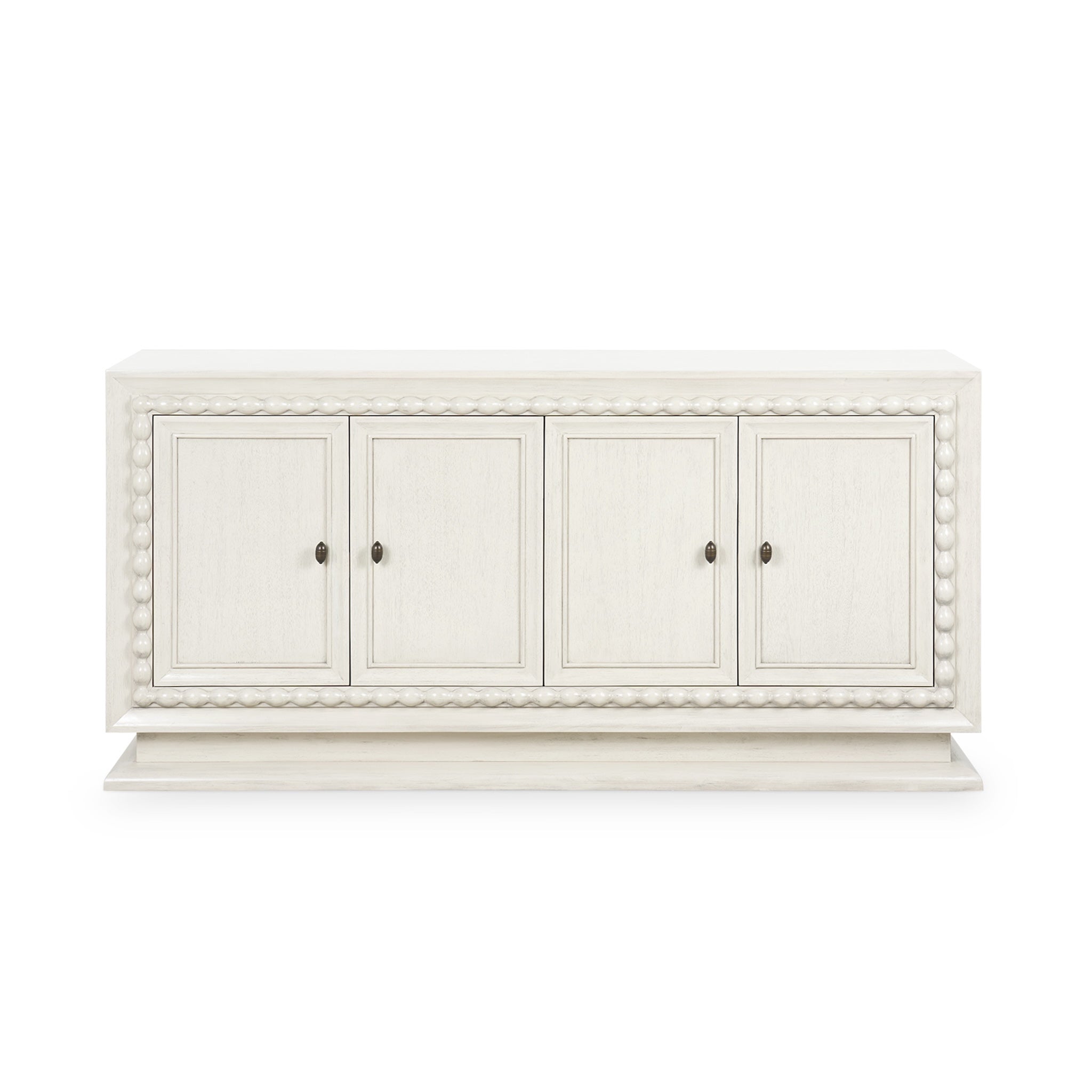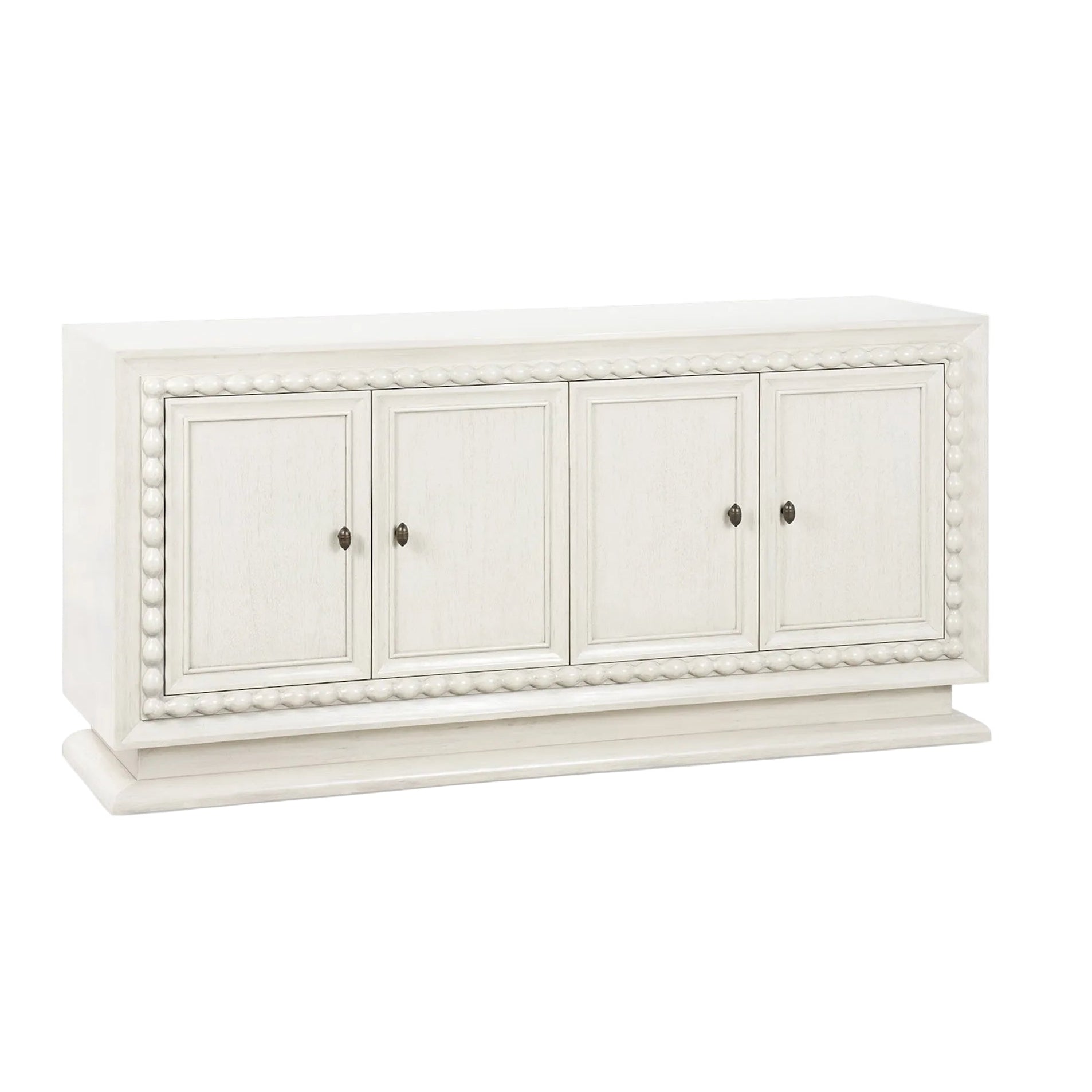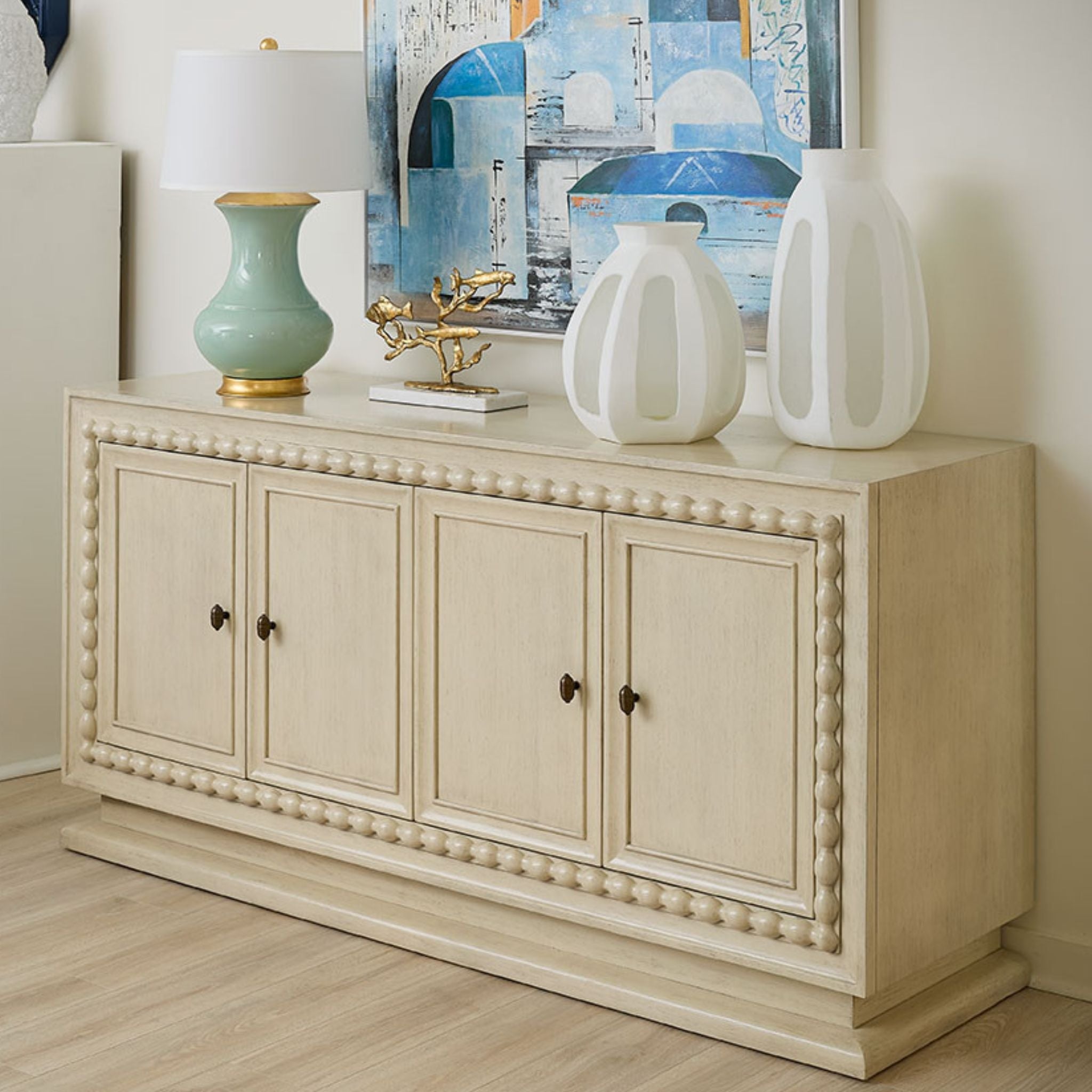 The Maxwell 4-Door Cabinet brings a bold, modern twist to traditional design with its oversized beaded trim, dramatic platform base, and textured sailcloth sheen finish. Behind its four doors, adjustable shelving and a stained interior offer stylish, versatile storage that adds presence to any space.
