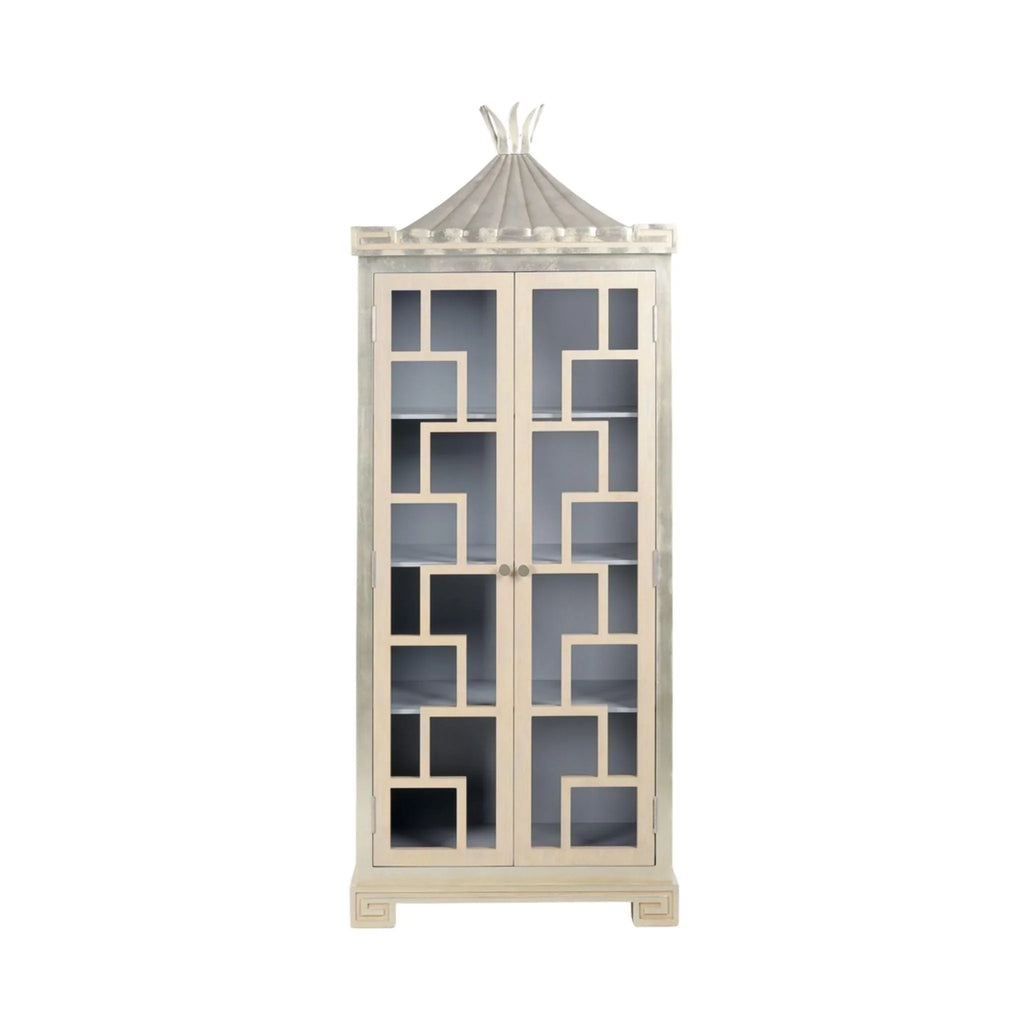 This beautiful fretted cabinet features a limed oak finish, gray interior, silver leaf accents, and clear glass. This piece is not intended for clothes storage.