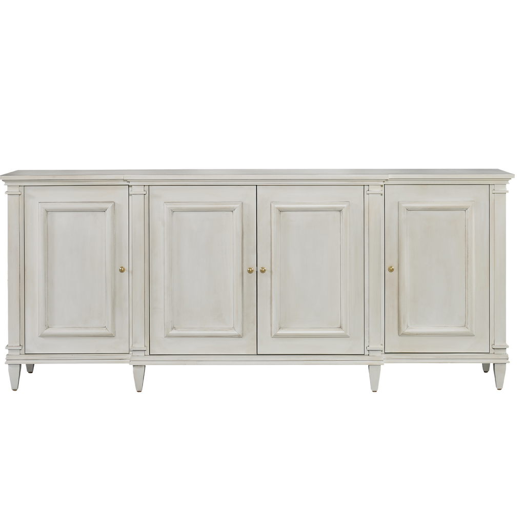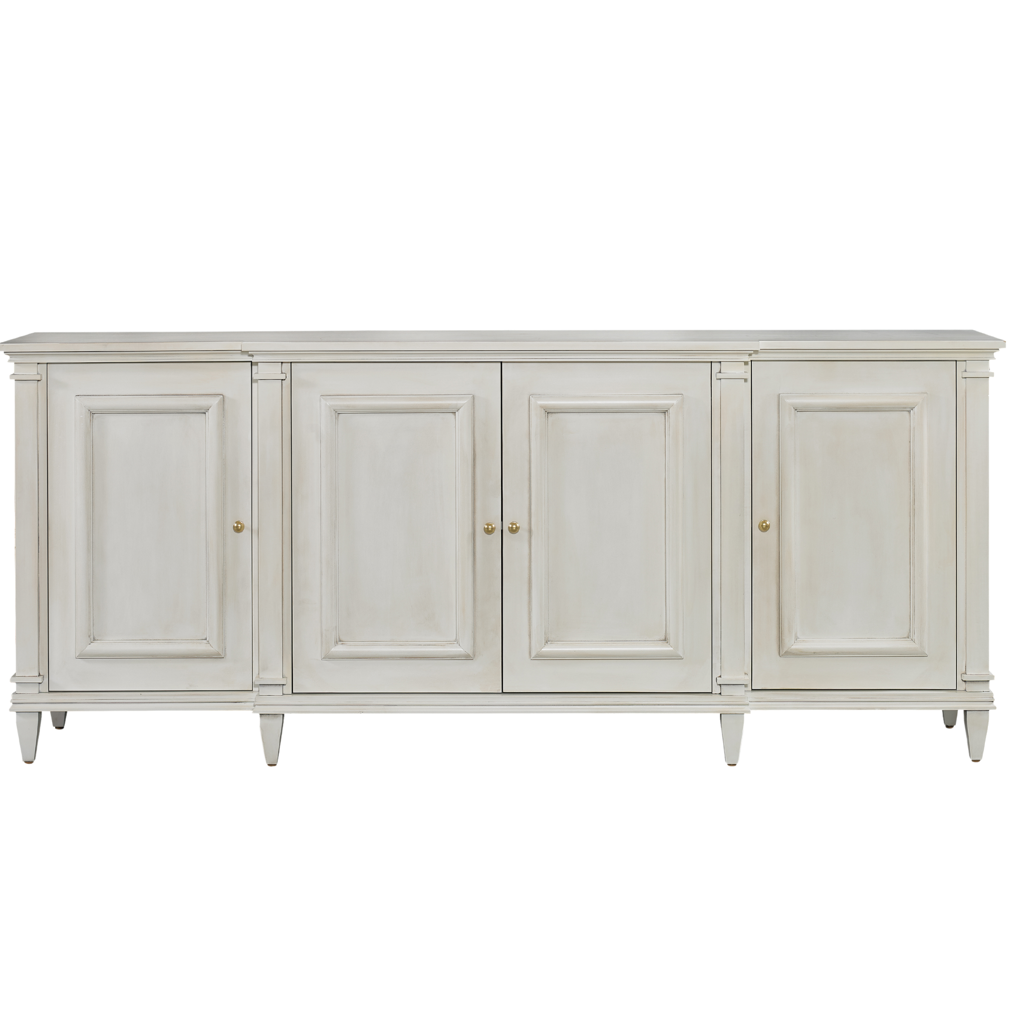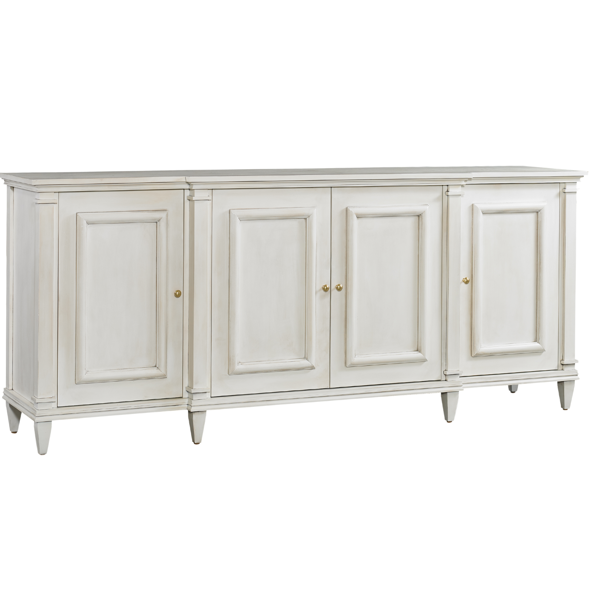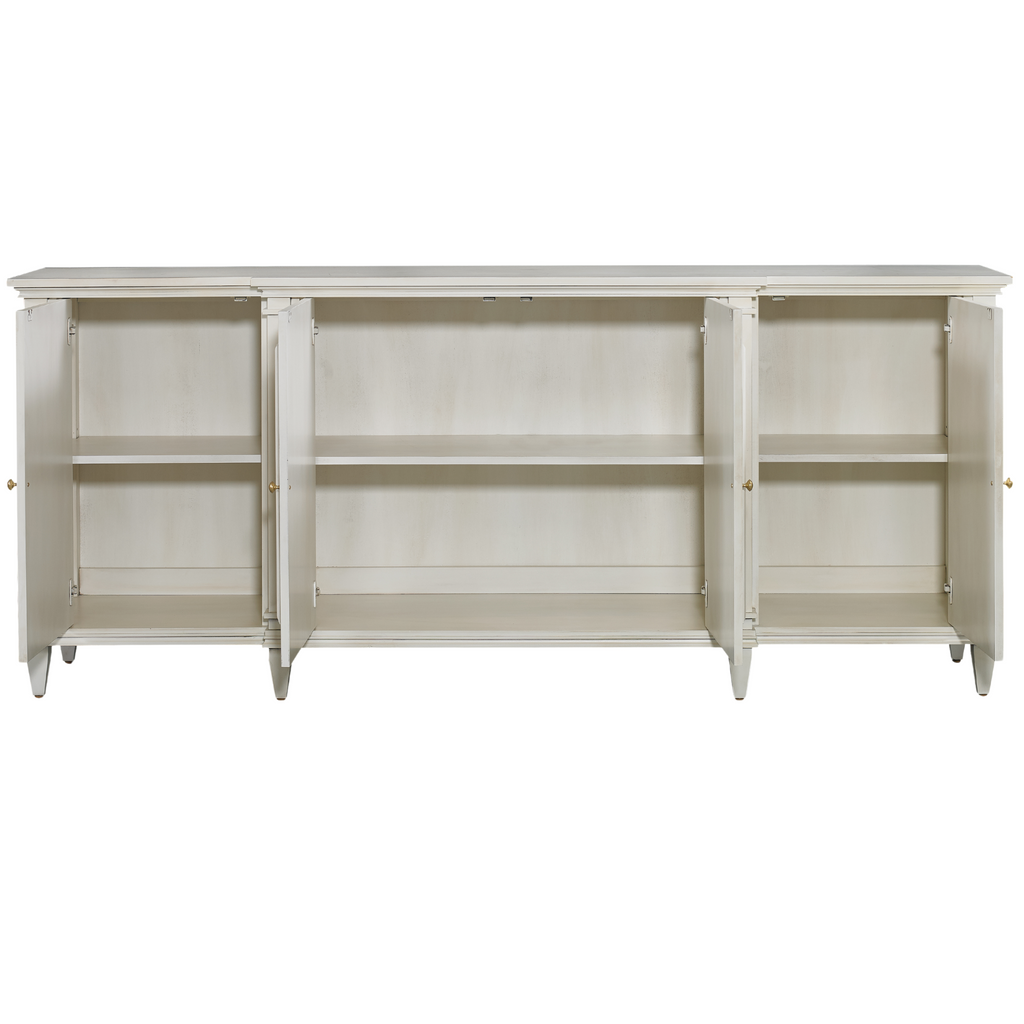If large scale and tremendous storage are your need, the Park Shore Credenza might just be the answer. It offers lots of inner space with four doors and an adjustable shelf behind each. The design detail built into the case provides design opportunity for custom finish combinations or contrast striping with brushed nickel or brass hardware choice. The door hardware is a heavy brass in a slightly aged finish and the inside chamber houses one drawer and one adjustable shelf.