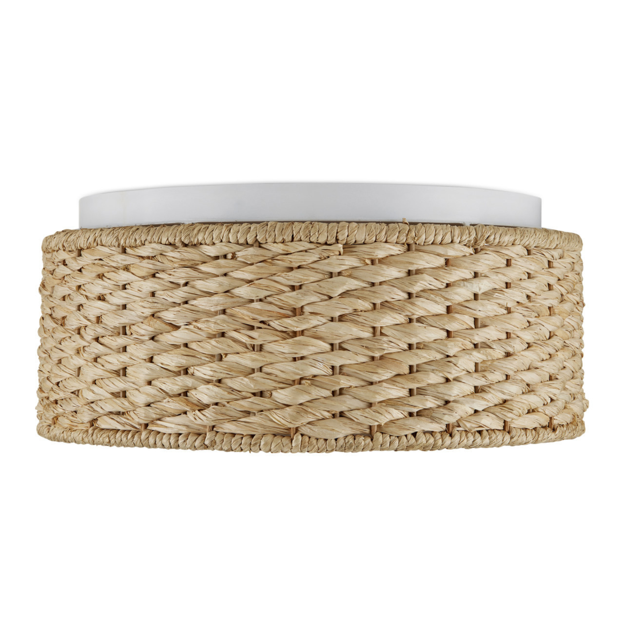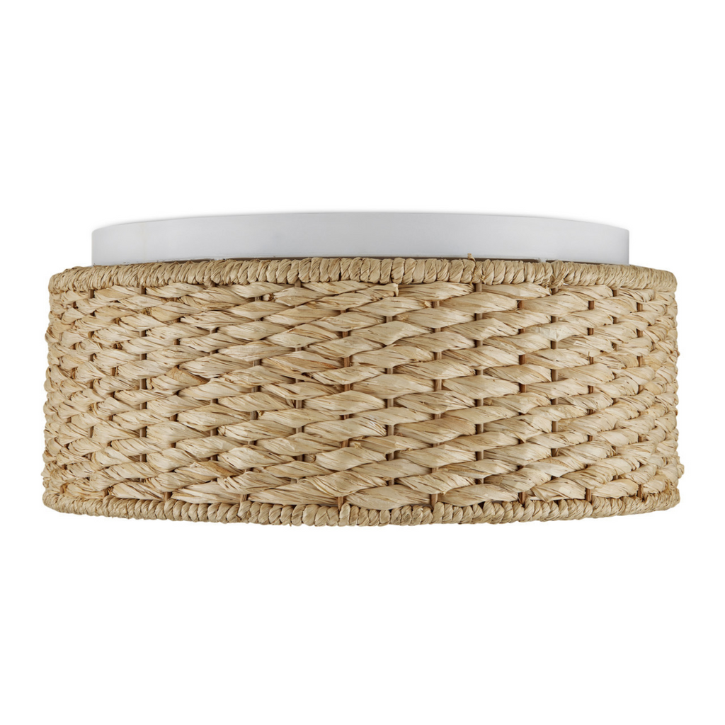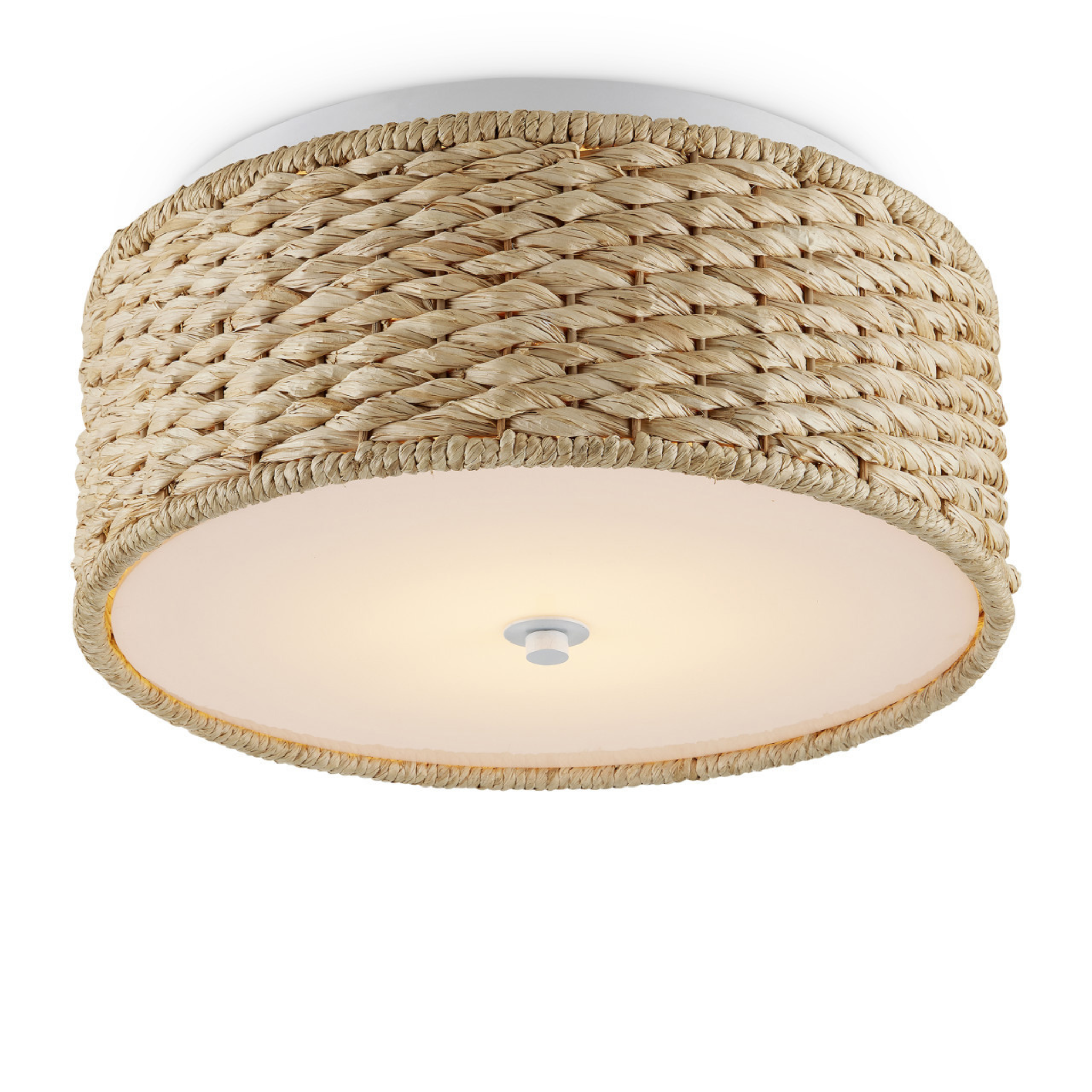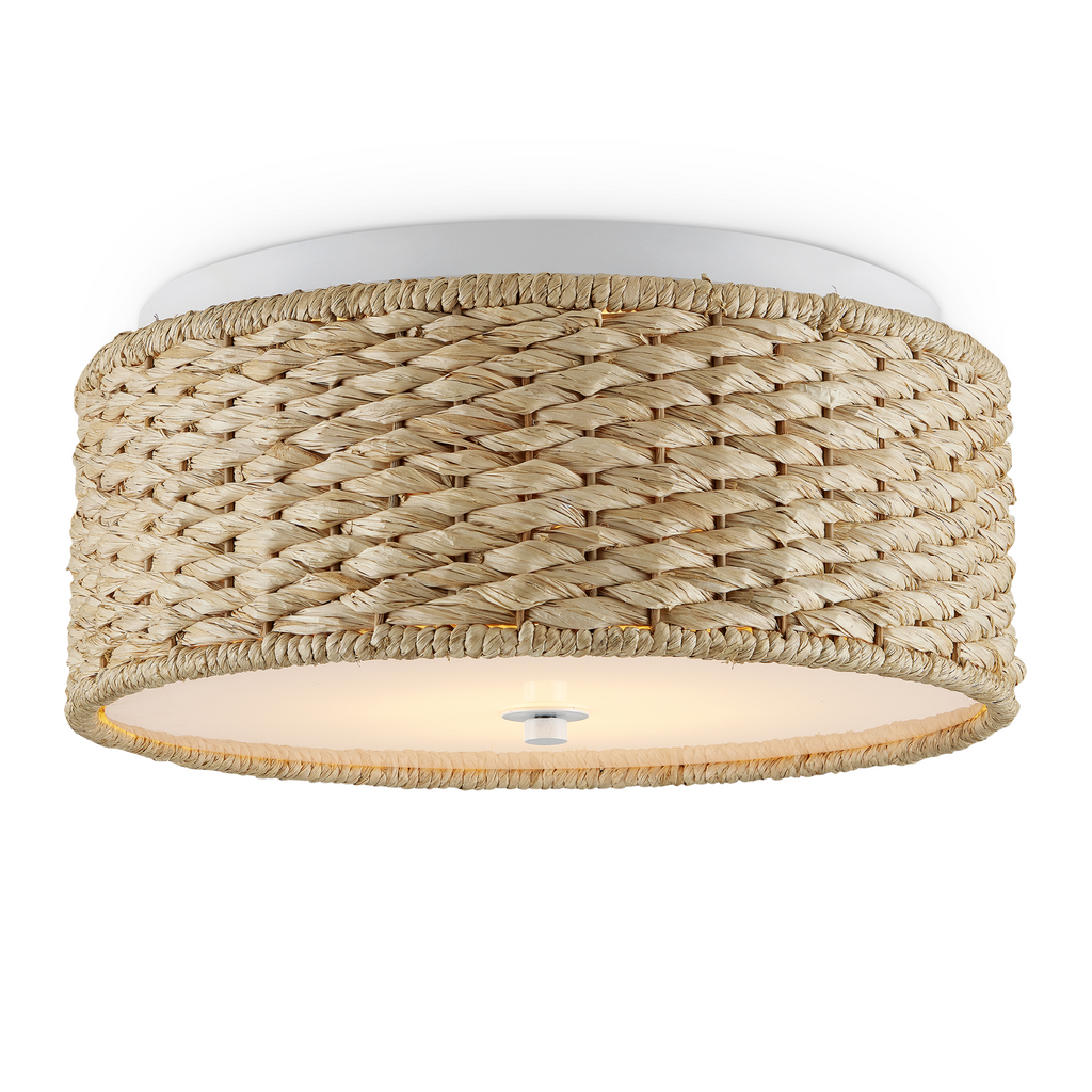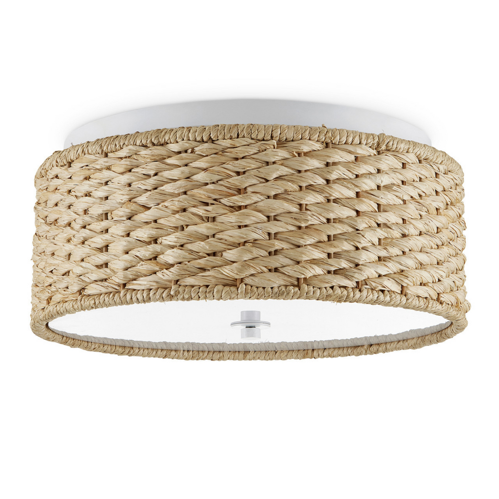 Raffia is densely woven around the circumference of the Colchester Flush Mount. Clarence Mallari designed the rope flush mount to be luminous. Choices that enhance the glow include the sugar white finish, the acrylic diffuser, the way the light flows onto the ceiling, and the weave that allows the light to seep through.