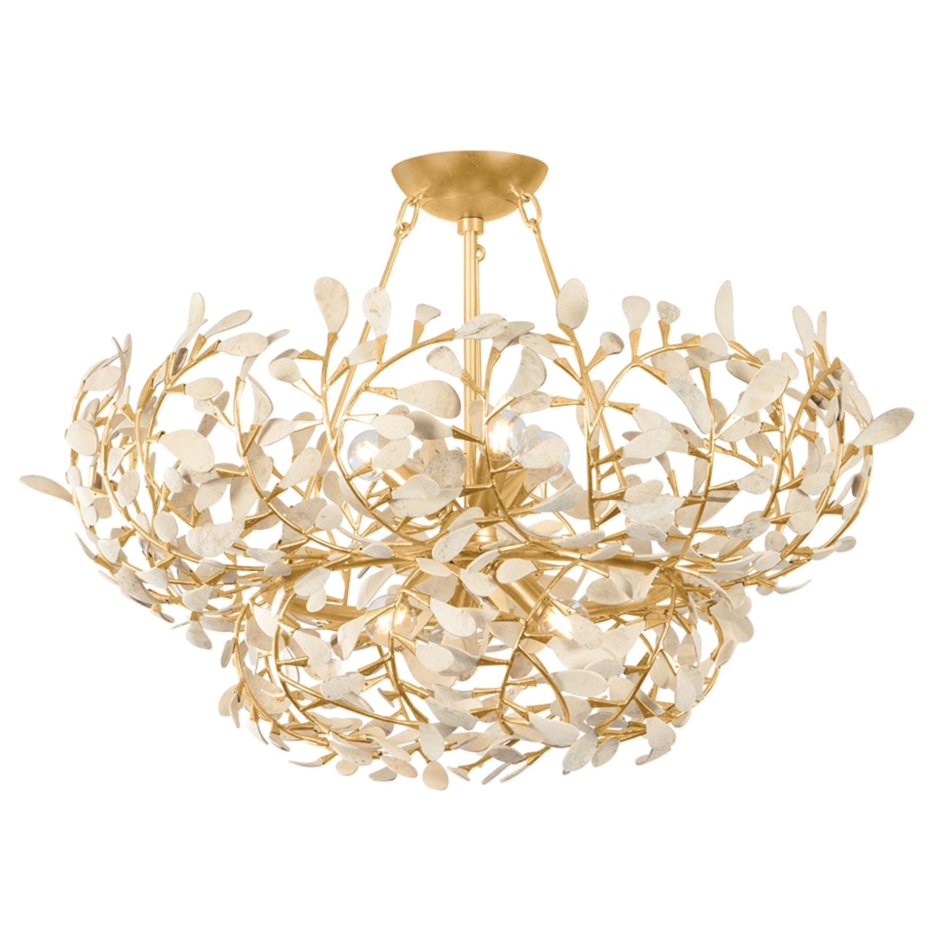 Graceful, scrolling ‘vines’ with delicate coco shell ‘petals’ wisp around to create the nest-like silhouettes of the Maybrook family. The organic beauty of the carved coco shell is paired with a Vintage Gold Leaf finish in this glamorous ode to nature. Maybrook’s silhouette is voluminous and radiant, creating an enchanting focal point.