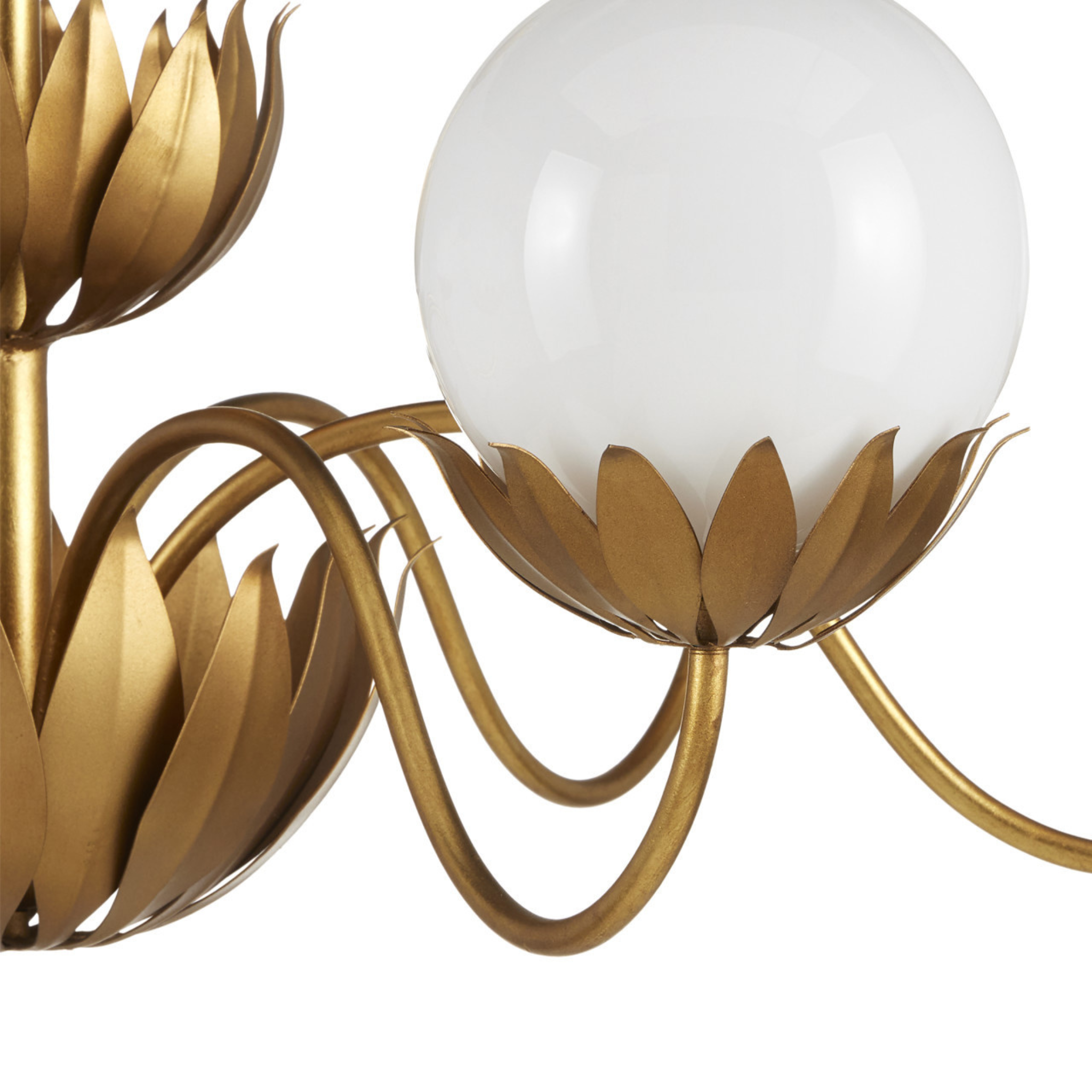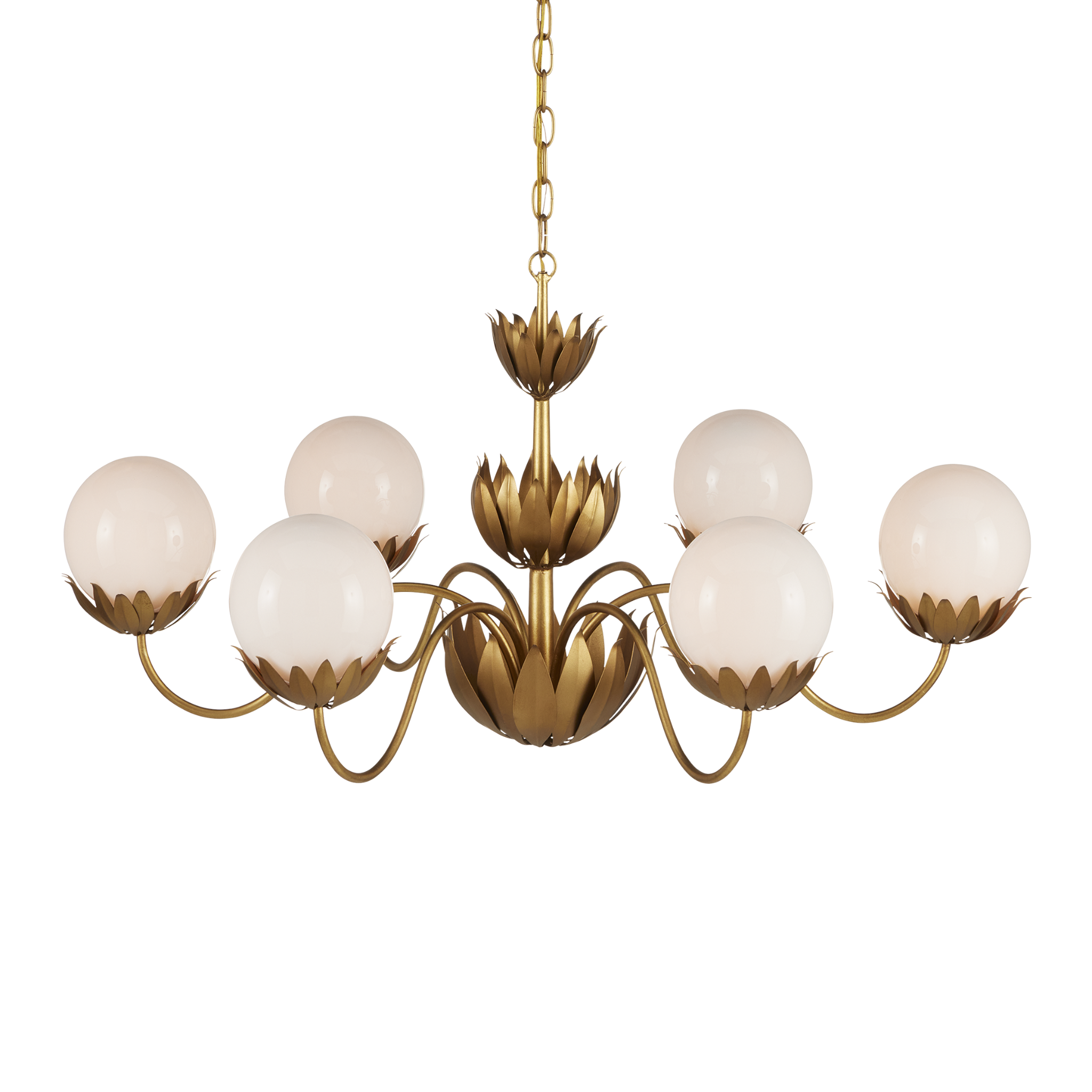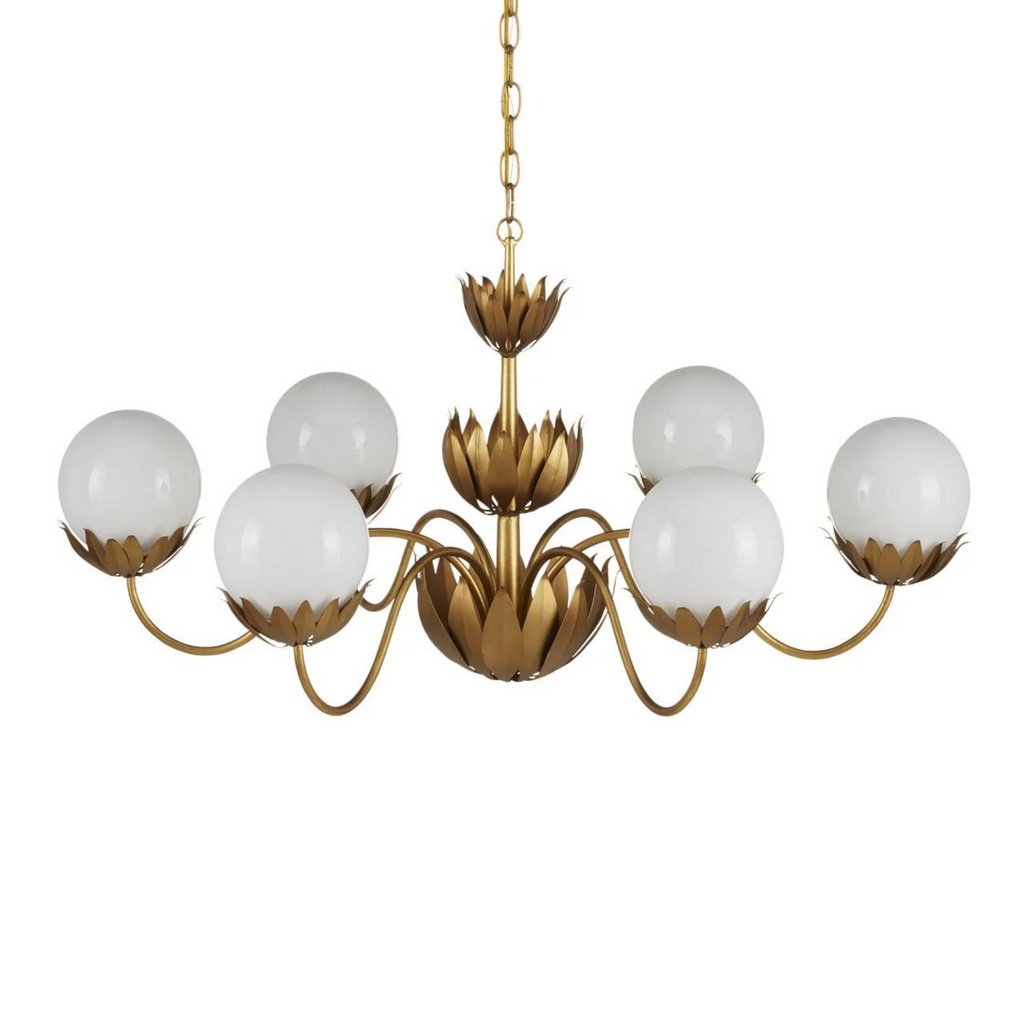 When he designed the Mirasole Gold Chandelier, Tom Caldwell was feeling nostalgic, remembering the décor of ice cream parlors that were staples at one time in America. The milky glass globes are supported on shapely stems in a contemporary gold leaf finish and ornamented with fluted leaf patterns in a darker gold finish to add interest. The globes on the fixture glow brightly when the lights are switched on; the illumination bringing the rich brass finish a high sheen.