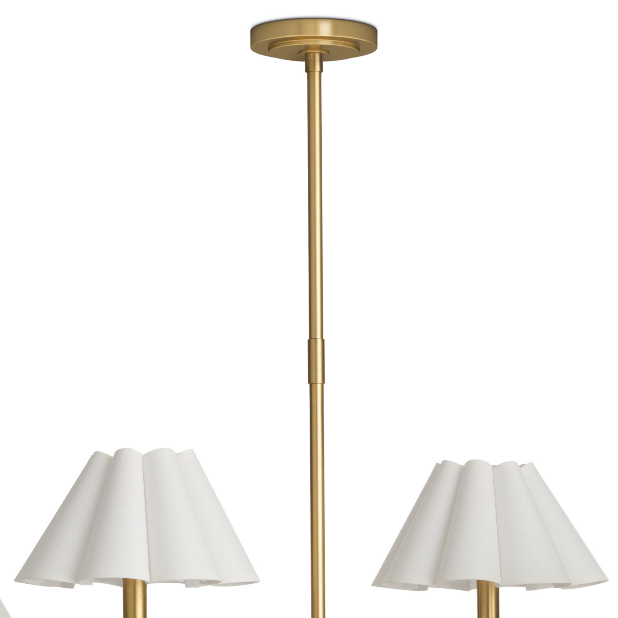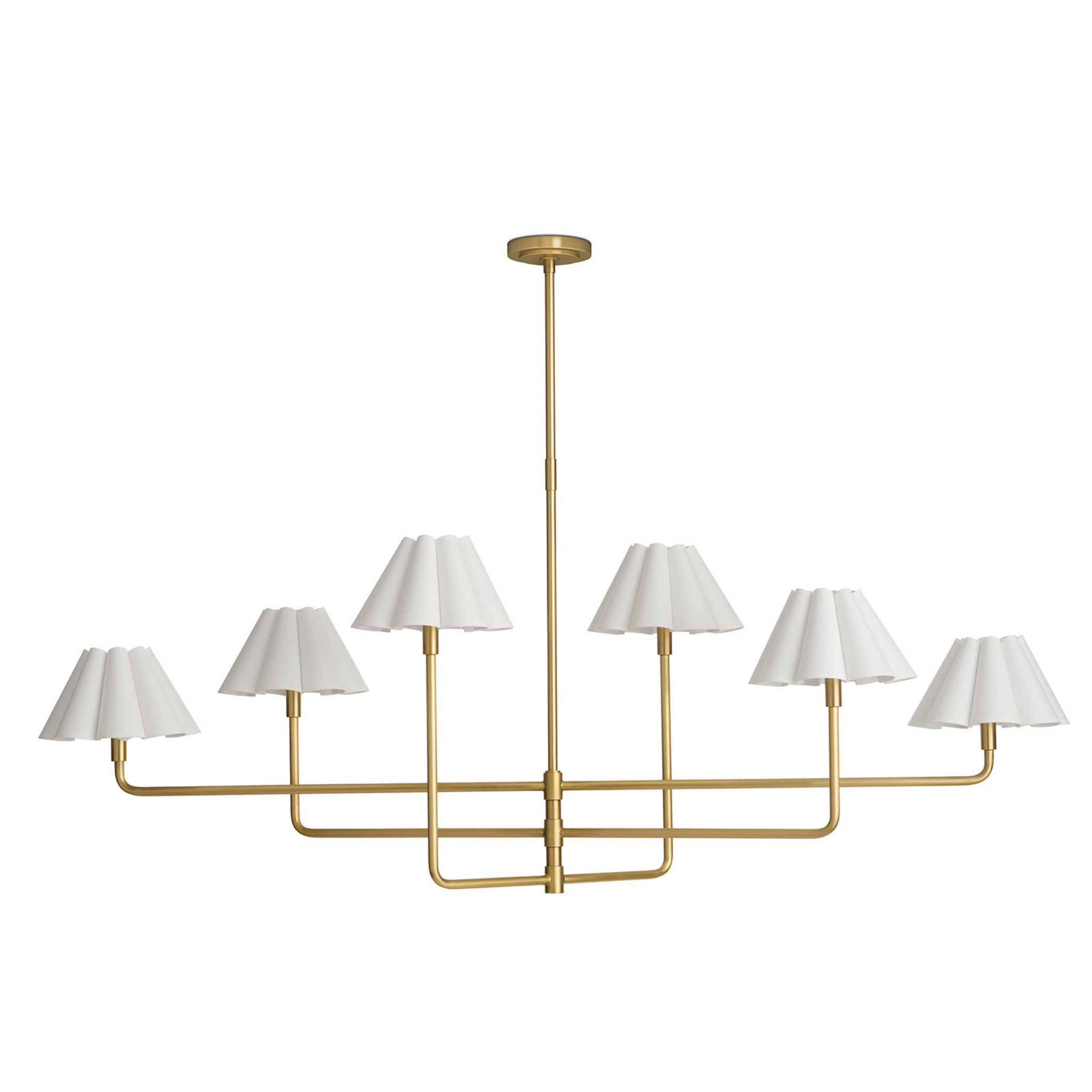The Polly Chandelier embodies grace and versatility with its six shades, delicately crafted from white linen and sewn into a charming scalloped pattern. Its multi-tiered design, coupled with Natural Brass rotatable arms, offers flexibility in configuration, allowing for linear arrangements or coverage over a round dining table.
