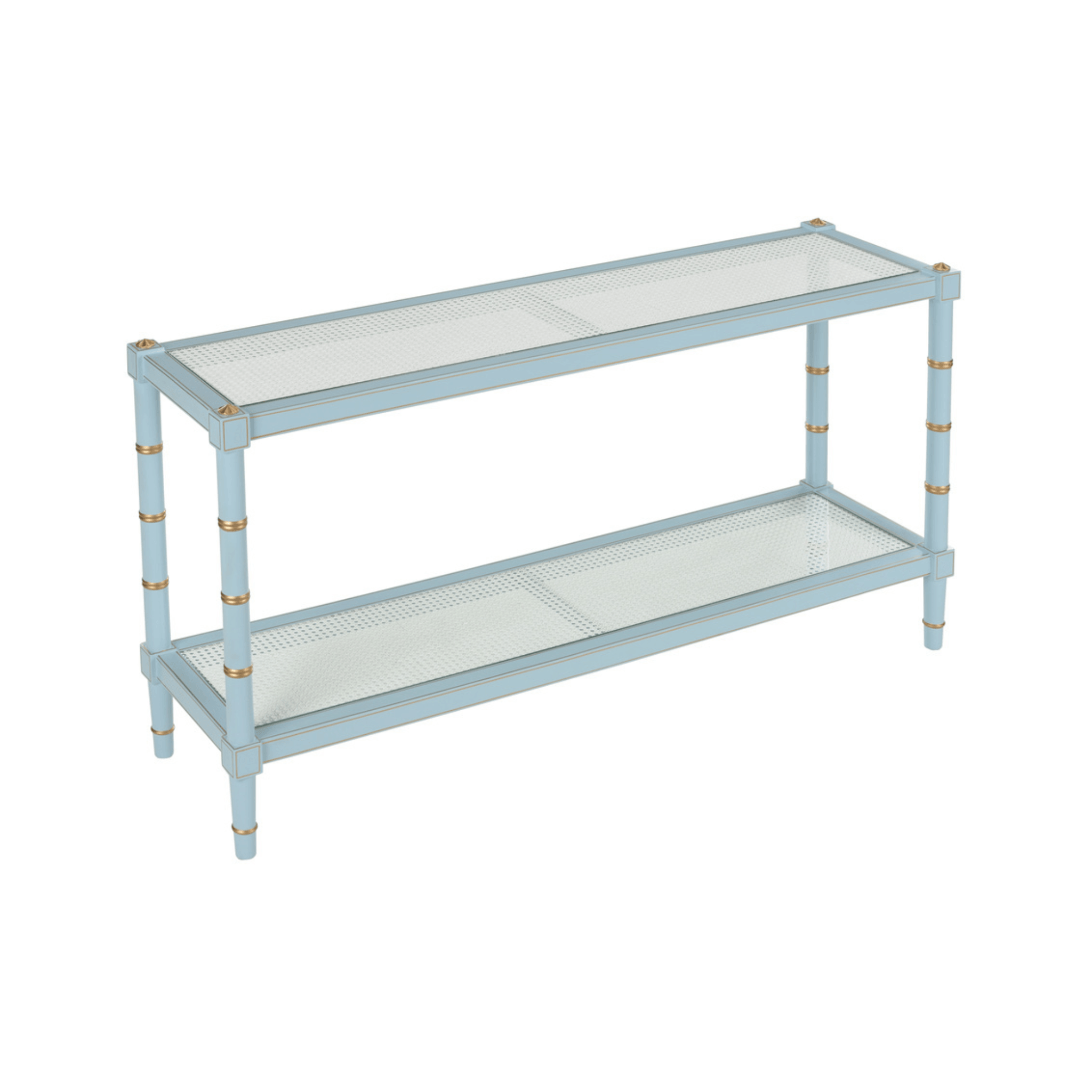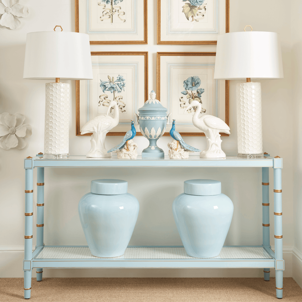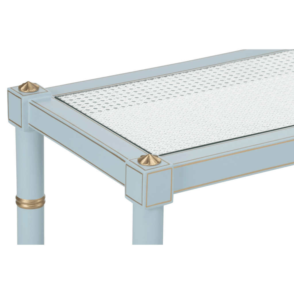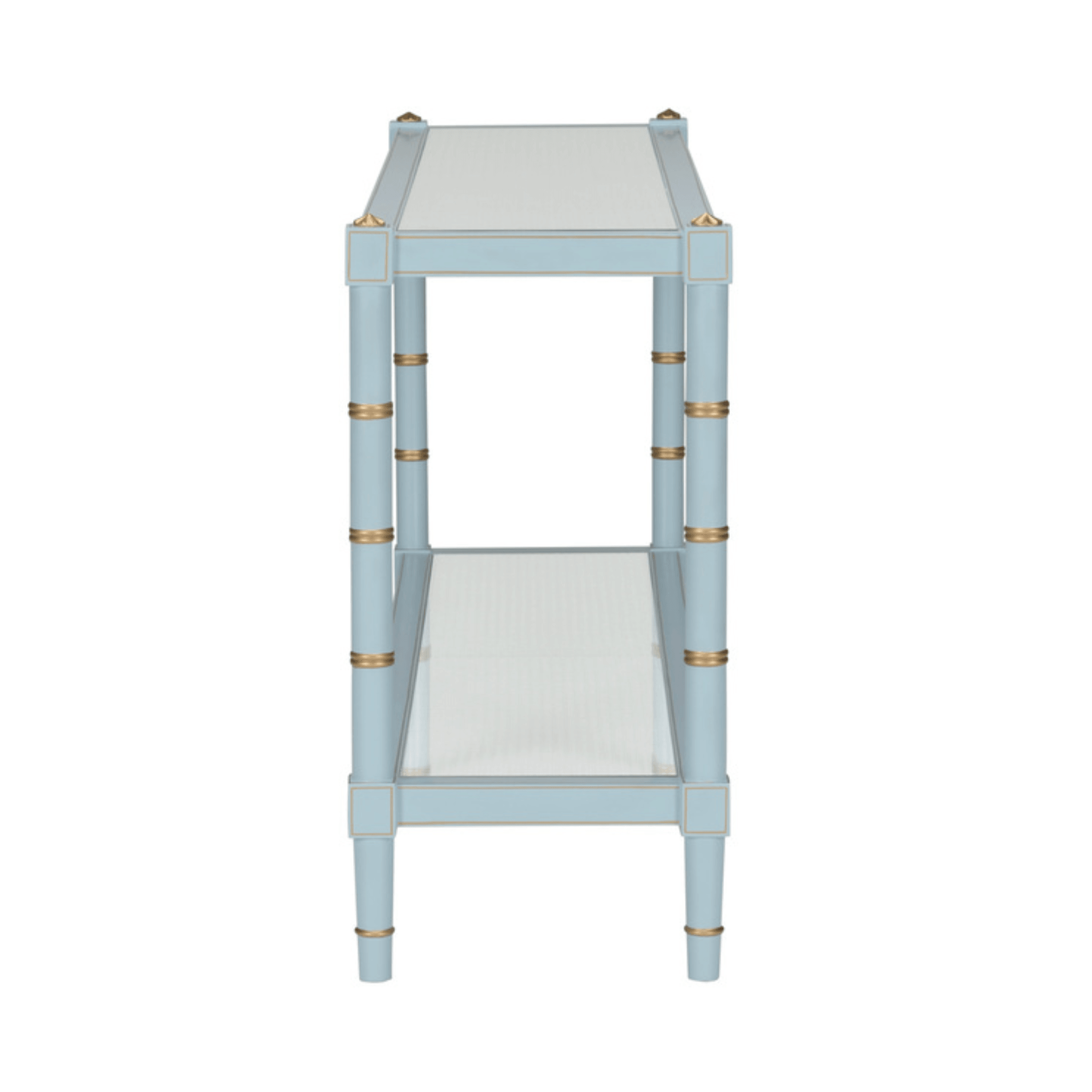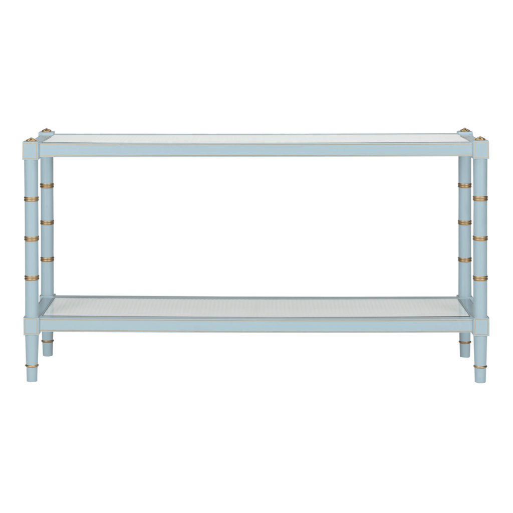 A pretty light blue console to compliment all your decor. Perfect for foyers & entries. Gold accents add an elegant touch.