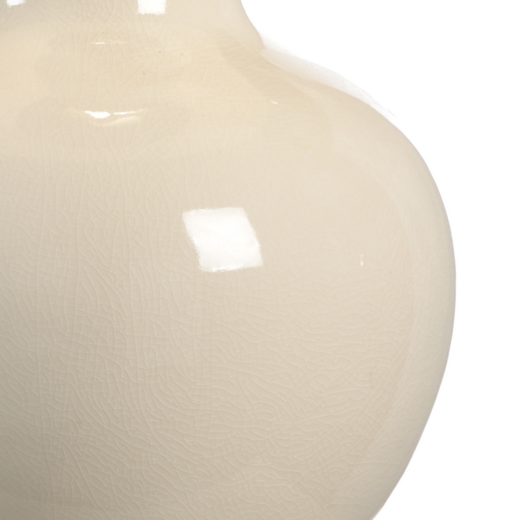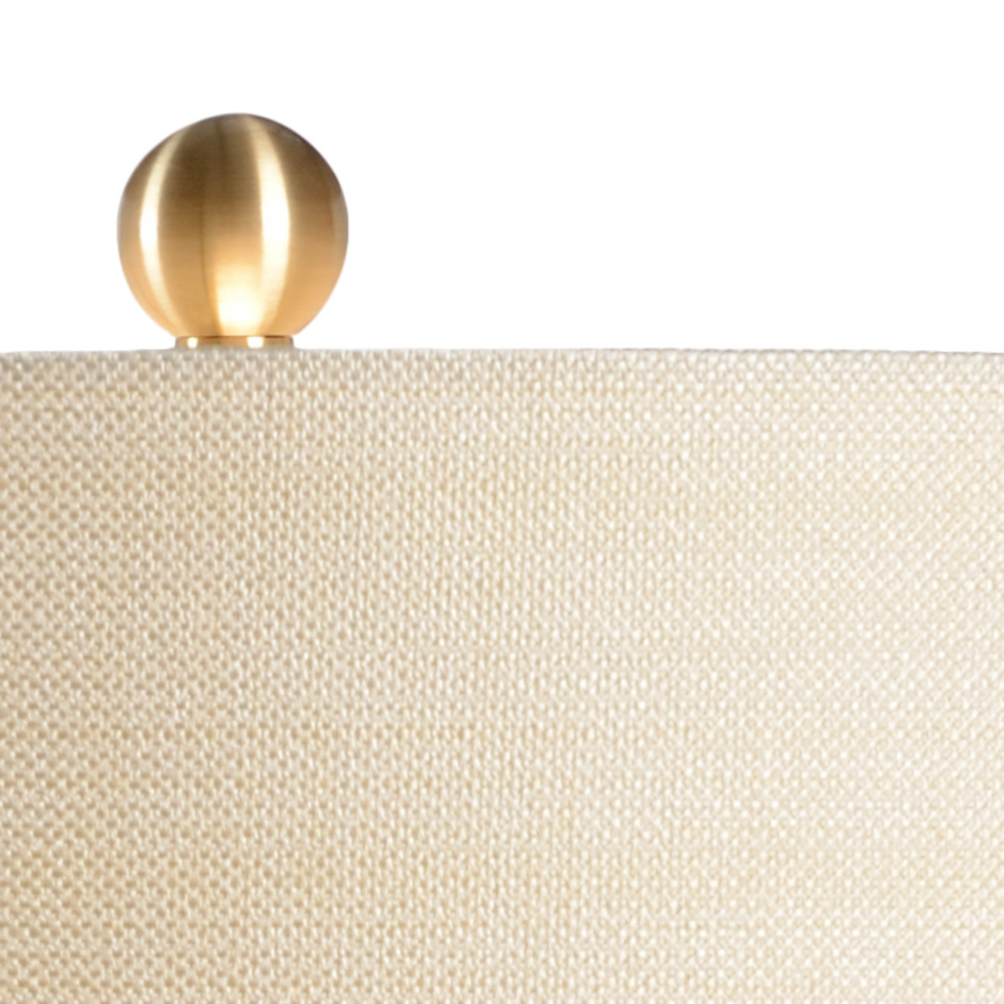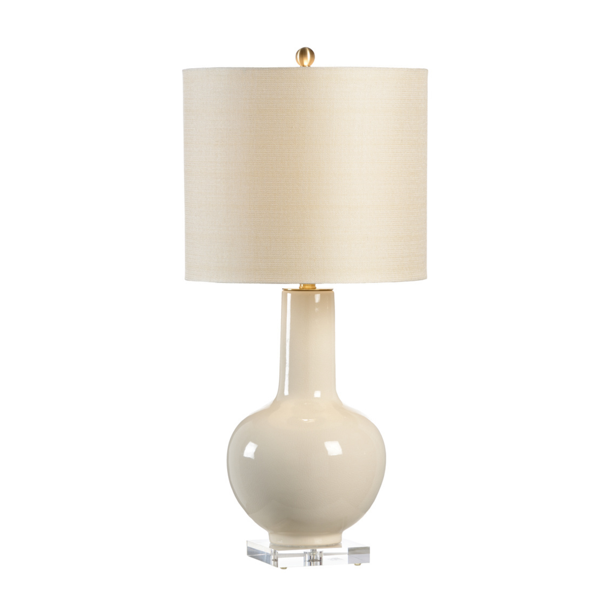 This modern single gourd lamp is a versatile light source for any design style. It features a cream glazed ceramic body and square acrylic base. A cream linen drum shade and brass ball finial finalizes this contemporary design that will blend effortlessly in any room. Click images for greater detail.