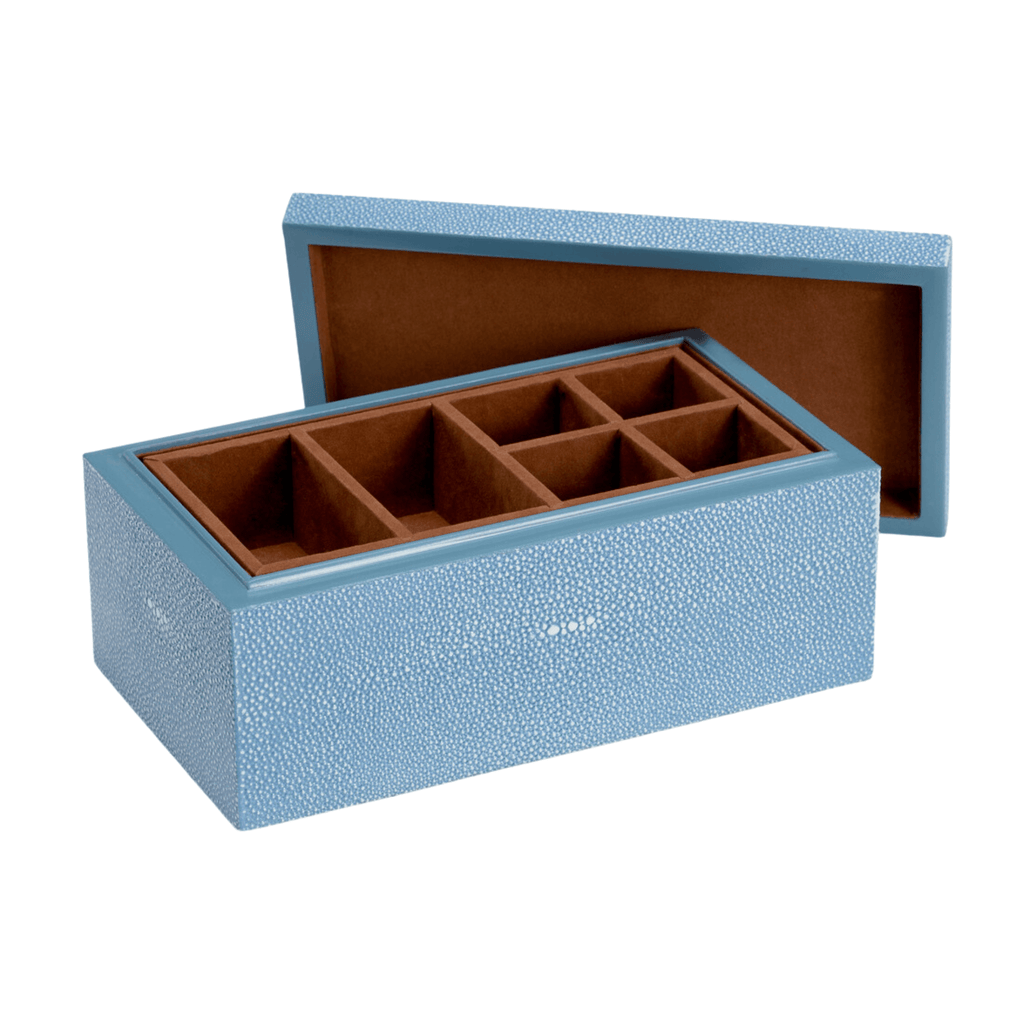 Store your jewelry in style with this fabulous light blue shagreen box. Velvet lined with a tray insert for organization, this box offers both function and flair. Measures 11w x 6d x 5.5h. Click on images for greater detail.