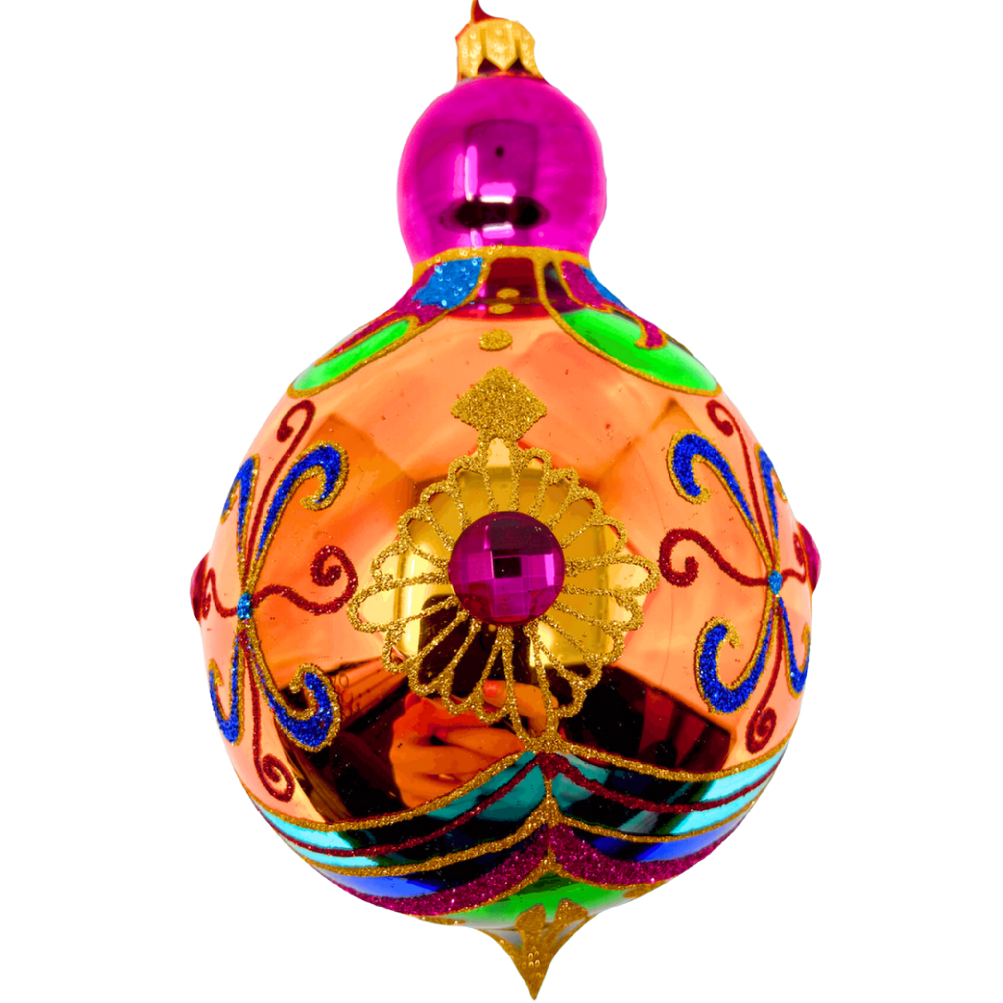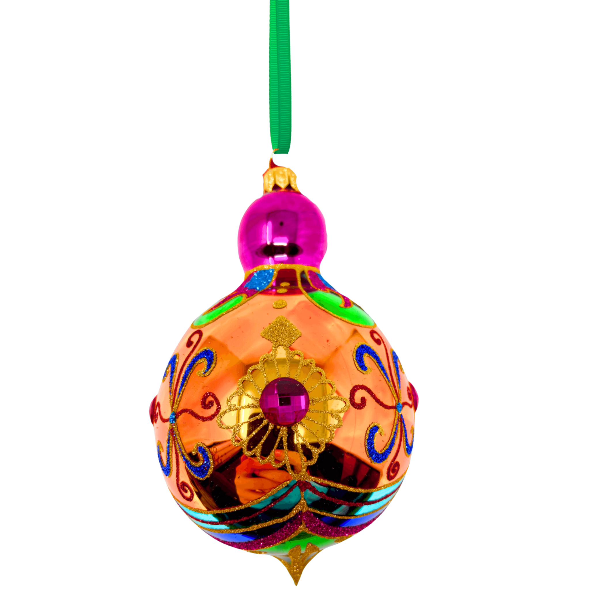 This luminous ornament captures the warmth of golden sunlight with its rich citrine hue, exuding elegance and festive charm. Adorned with gilded filigree that swirls delicately across the surface, it’s further embellished with dazzling jewel accents that catch the light from every angle. A true showstopper, this bauble adds a touch of luxury and brilliance - perfect for those who love their Christmas décor with a hint of opulence.