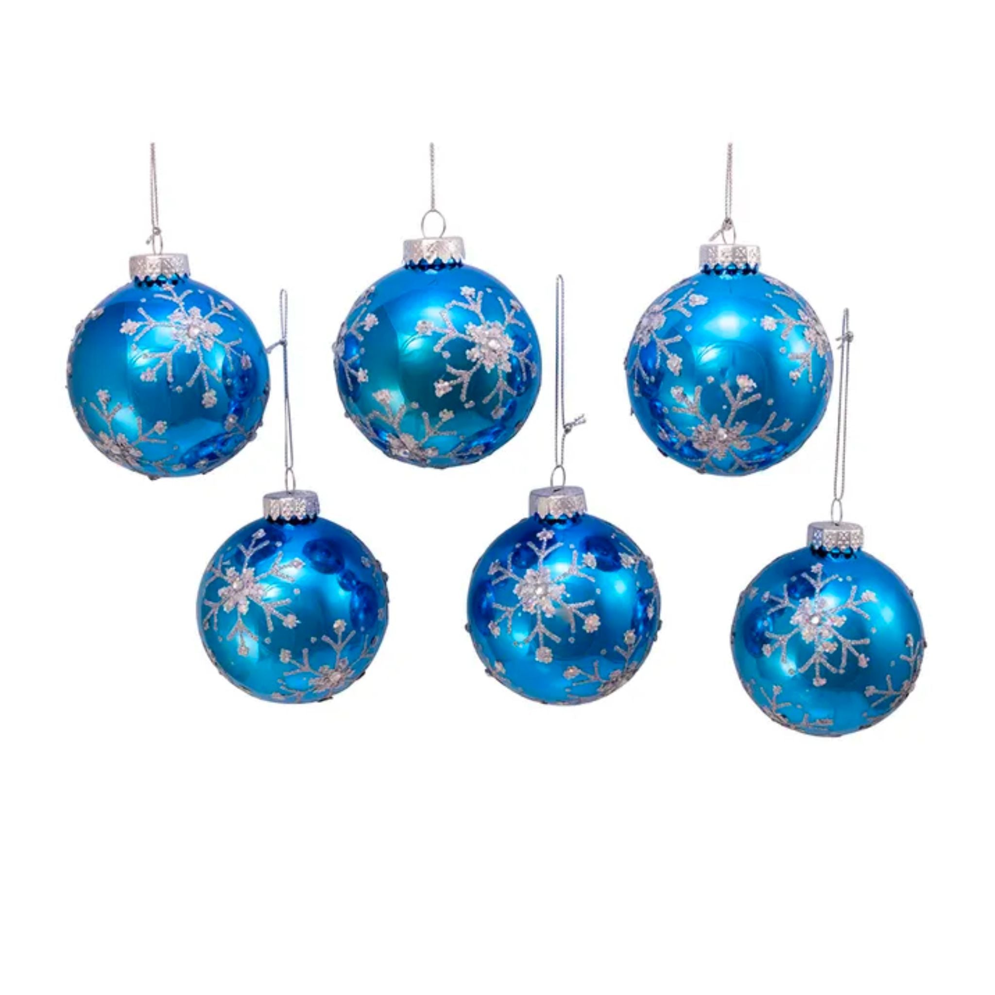 Glass Blue and Silver Glitter Snowflake Ball Ornaments, 6-Piece Set